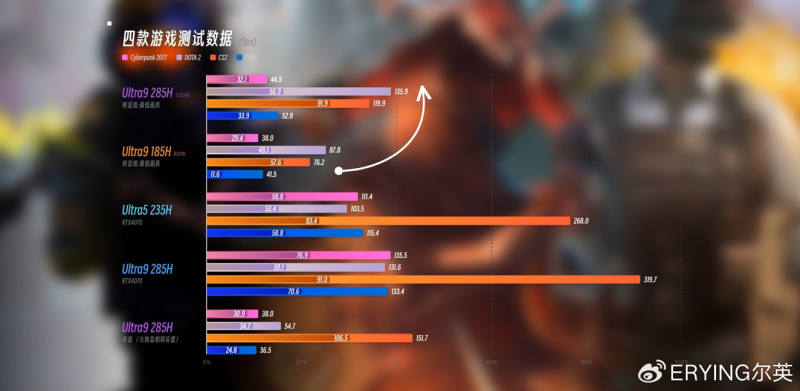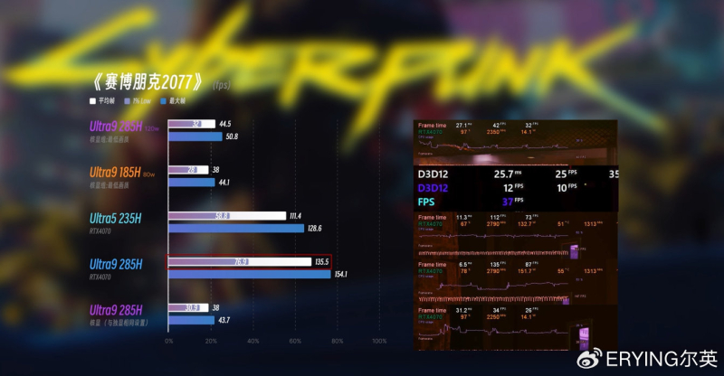 В Dota 2 частота кадров выросла с 88 до 136 FPS, а в Cyberpunk 2077 — примерно до 44,5 FPS на пониженных настройках. Минимальный показатель FPS (1 % low) в PUBG вырос с 11,6 FPS (Core Ultra 9 185H) до 33,9 FPS (Core Ultra 9 285H).