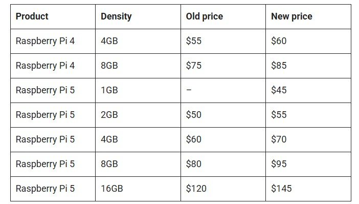 Изменение цен касается моделей Raspberry Pi 4 с 4 или 8 Гбайт оперативной памяти: они станут немного дороже — на 5 и 10 долларов соответственно. Модели Raspberry Pi 4 с объёмом оперативной памяти менее 4 Гбайт пока не затронуты повышением цен. Raspberry Pi также представила новую модель Raspberry Pi 5 с 1 Гбайт памяти, которая немного дешевле предыдущей модели с 2 Гбайт. В то же время другие конфигурации подорожали: версия с 2 Гбайт ОЗУ — на $5, с объёмом памяти 4 Гбайт — на $10, c 8 Гбайт — на $15, а c 16 Гбайт — на целых $25.