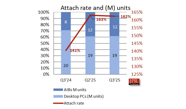 Отношение проданных карт к отгруженным настольным компьютерам в третьем квартале 2025 года составило 162 %, снизившись на 0,6 % по сравнению с предыдущим кварталом. Рынок процессоров для настольных ПК снизился на 7,6 % в годовом исчислении и вырос на 3,9 % по сравнению с предыдущим кварталом, составив 19,2 млн единиц.