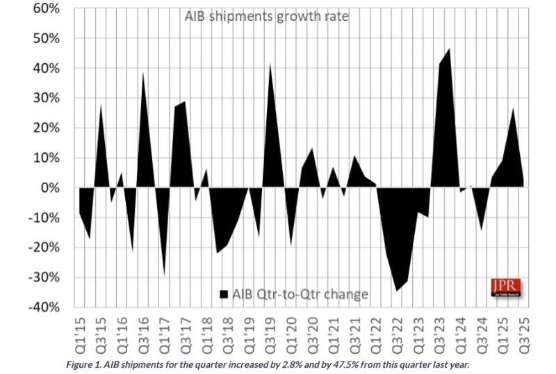 Согласно новому отчёту, объём рынка дискретных графических процессоров на платах расширения в третьем квартале 2025 года составил $8,8 млрд и достиг 12 млн устройств, что на 2,8 % больше, чем в предыдущем квартале.