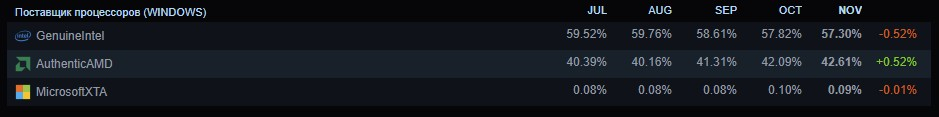 В сегменте центральных процессоров доля пользователей чипов Intel снизилась на 0,52 п.п. По итогам минувшего месяца 57,30 % участников опроса сообщили, что используют процессоры «синих». Доля пользователей процессоров AMD, в свою очередь, выросла до 42,61 % (+0,52 п.п. за месяц).