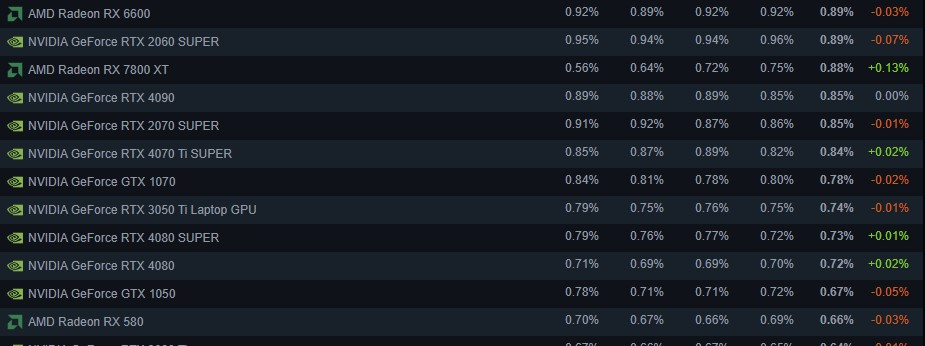 Тремя самыми популярными видеокартами AMD Radeon на платформе, если не считать встроенную графику, являются Radeon RX 6600 (0,89 % пользователей, -0,03 п.п. за месяц), Radeon RX 7800 XT (0,88 % пользователей, +0,13 п.п. в ноябре) и Radeon RX 580 (0,66 % пользователей, -0,03 п.п.). Видеокарт серии Radeon RX 9000 в статистике Steam по-прежнему нет.