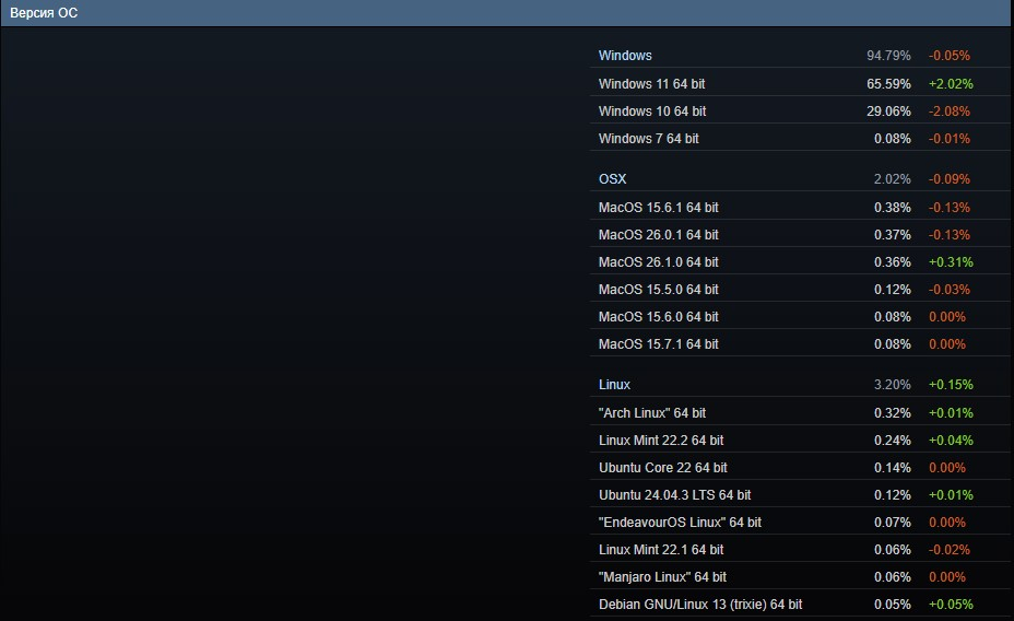 Также в статистике операционных систем обращает на себя внимание рост популярности Linux. Совокупная доля пользователей платформы выросла до 3,20 %, прибавив 0,15 п.п. за месяц. И это максимальный показатель для Linux-систем за всю историю Steam.