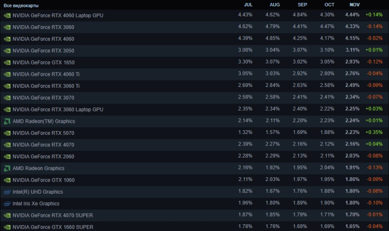 В сегменте видеокарт в целом никаких изменений: карты GeForce по-прежнему являются самыми популярными. Несмотря на то, что в ноябре доля карт «зелёных» снизилась на 0,1 п.п., общая картина остаётся прежней — 73,8 % участников опроса Steam отметили, что используют видеокарты Nvidia. Карты AMD прибавили за ноябрь 0,1 п.п., их общая доля на платформе составляет 17,9 %. У Intel потеря составила 0,1 п.п. за месяц — доля её карт на платформе находится на уровне 7,7 %.