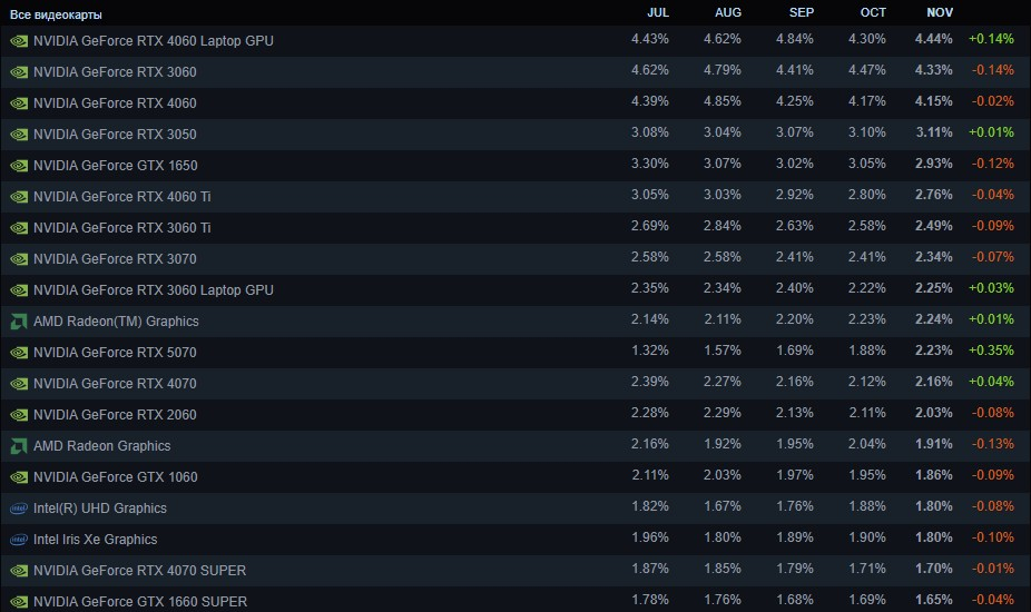 Самой популярной видеокартой платформы снова стала мобильная GeForce RTX 4060. Уже не первый месяц позиция лидера меняется между ней и десктопной GeForce RTX 3060. Последняя в ноябре потеряла 0,14 п.п., поэтому её доля на платформе составила по итогам ноября 4,33 %. Мобильная GeForce RTX 4060 прибавила те же 0,14 п.п. — её доля по итогам месяца достигла 4,44 %. На третьем месте по популярности находится десктопная версия GeForce RTX 4060 с долей 4,15 % (-0,02 п.п. за месяц).