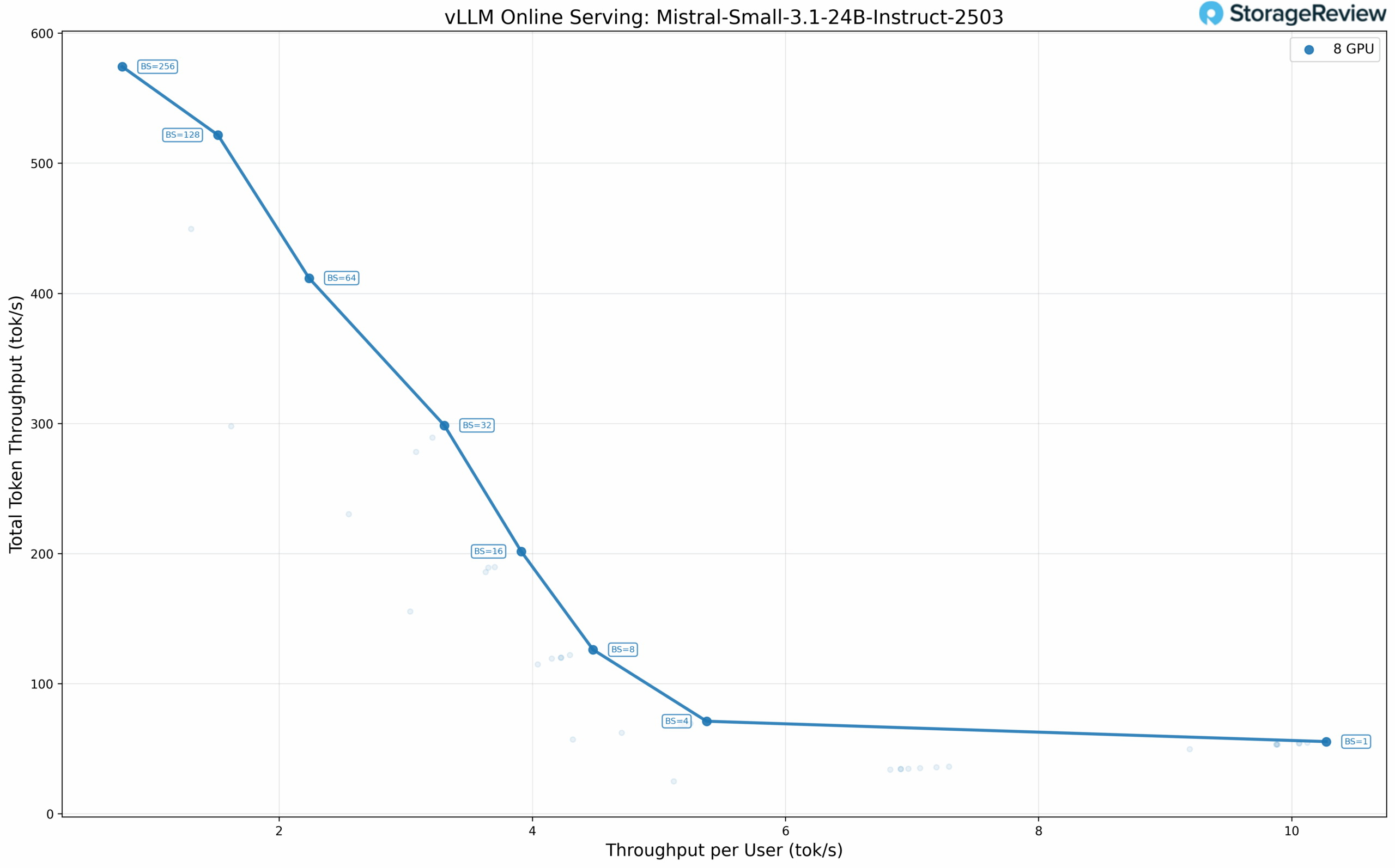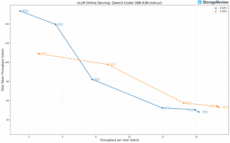 «Для всех протестированных моделей прослеживается общая закономерность: при небольших размерах пакета с нашей конфигурацией с 256 токенами ввода/вывода использование минимального количества графических процессоров, необходимого для размещения модели, обеспечивает лучшую производительность на пользователя, чем распределение по всем восьми графическим процессорам. Издержки взаимодействия между графическими процессорами через PCIe, даже на скоростях PCIe 5.0, приводят к задержке, превышающей преимущества распараллеливания в однопользовательских или низкоконкурентных сценариях», — пишет Storage Review.