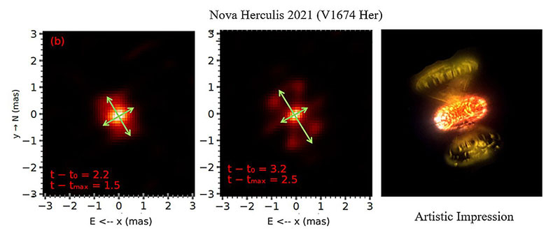 На днях в журнале Nature Astronomy международная команда астрономов опубликовала первые в истории прямые изображения взрывов двух классических новых (novae) — V1674 Herculis и V1405 Cassiopeiae — полученные в реальном времени с помощью оптического интерферометрического массива CHARA (Center for High Angular Resolution Astronomy) в США. Снимки впервые раскрывают динамику процесса, сложность которого удивила учёных.