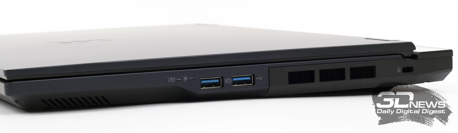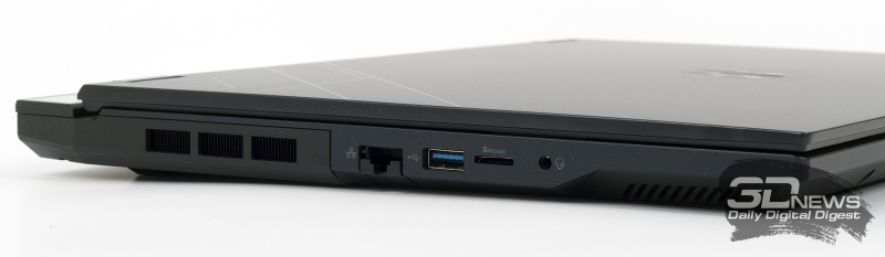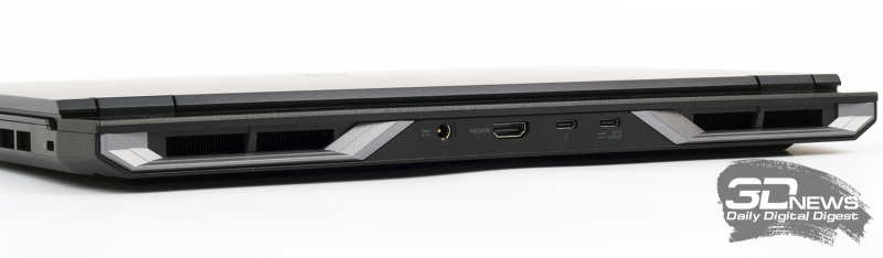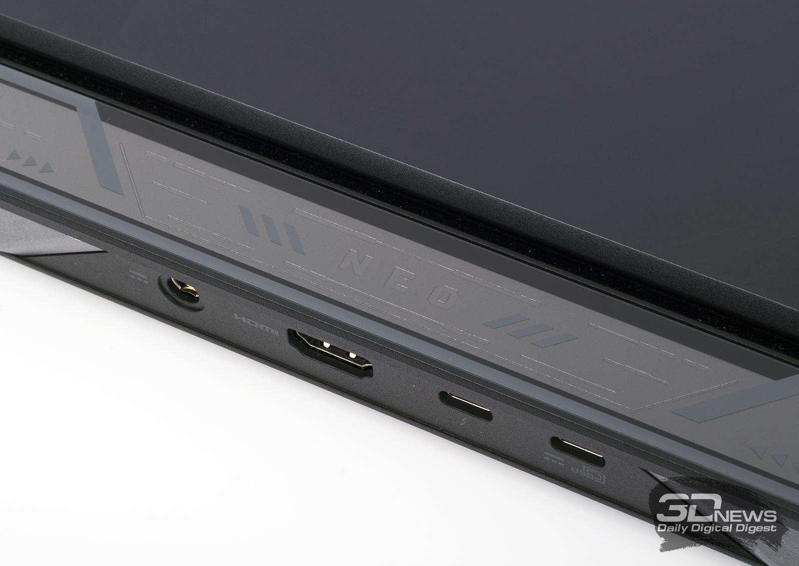 Или вот еще пример: лэптопы Acer обладают схожей функциональностью. Так, на левом боку Predator Helios Neo 16 AI выведены разъем RJ-45, подключенный к 2,5-гигабитному сетевому контроллеру, USB 3.2 Gen1 A-типа, слот для карт форм-фактора microSD и 3,5-мм «джек» для подключения гарнитуры. На правой стороне корпуса расположилась пара USB 3.2 Gen2 A-типа, сзади — HDMI-выход, разъем для подключения блока питания, Thunderbolt 4 и USB 3.2 Gen2 (оба — в виде USB Type-C). Последние два порта работают как в режиме DisplayPort, так и в режиме передачи электроэнергии. Следовательно, вместе с «Предатором» можно брать более компактный блок питания.