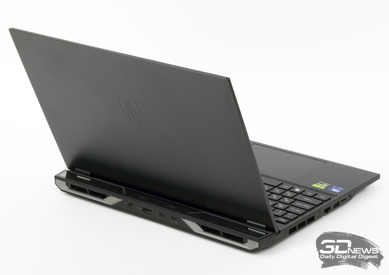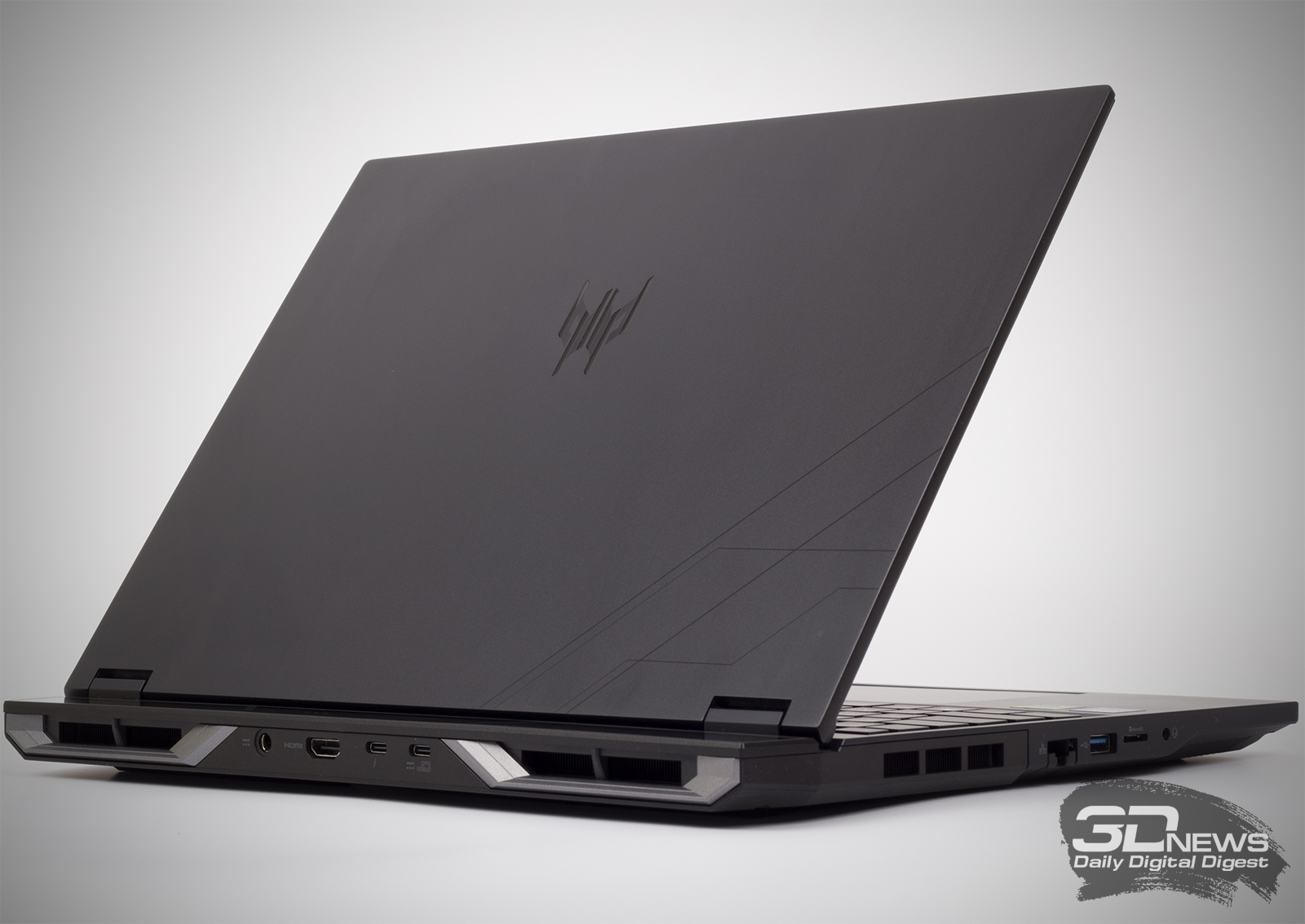 Герой тестирования выглядит строго и презентабельно. Крышка дисплея выполнена из металла. Сразу же бросаются в глаза значок серии Predator и заманчиво оформленная «корма» корпуса лэптопа — они приметны, даже если не подсвечиваются. К слову, помимо логотипа, RGB-подсветкой оснащена еще и клавиатура.