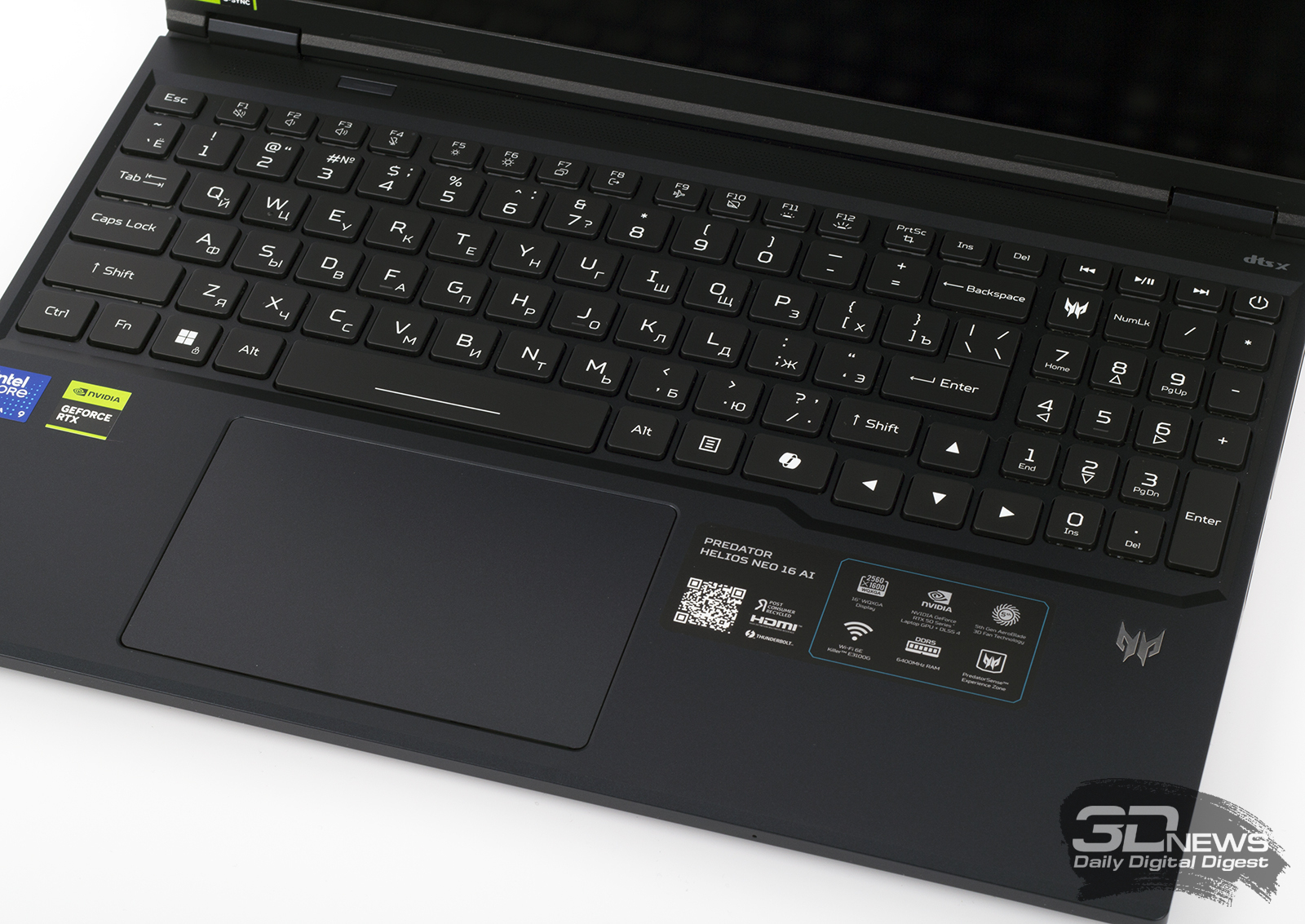 Наконец, ноутбуки серии Predator Helios Neo 16 AI и S-модификации укомплектованы одинаковой клавиатурой. Так, 16-дюймовые «Предаторы» оснащены цифровым блоком. Сами клавиши, впрочем, пришлось несколько ужать, чтобы вместить в том числе дополнительные кнопки. В частности, в цифровой блок интегрированы клавиша вызова приложения PredatorSense, кнопка включения, а также клавиши переключения и остановки видео и музыки. В левой части есть еще одна кнопка — с ее помощью переключаются режимы работы системы охлаждения лэптопа.