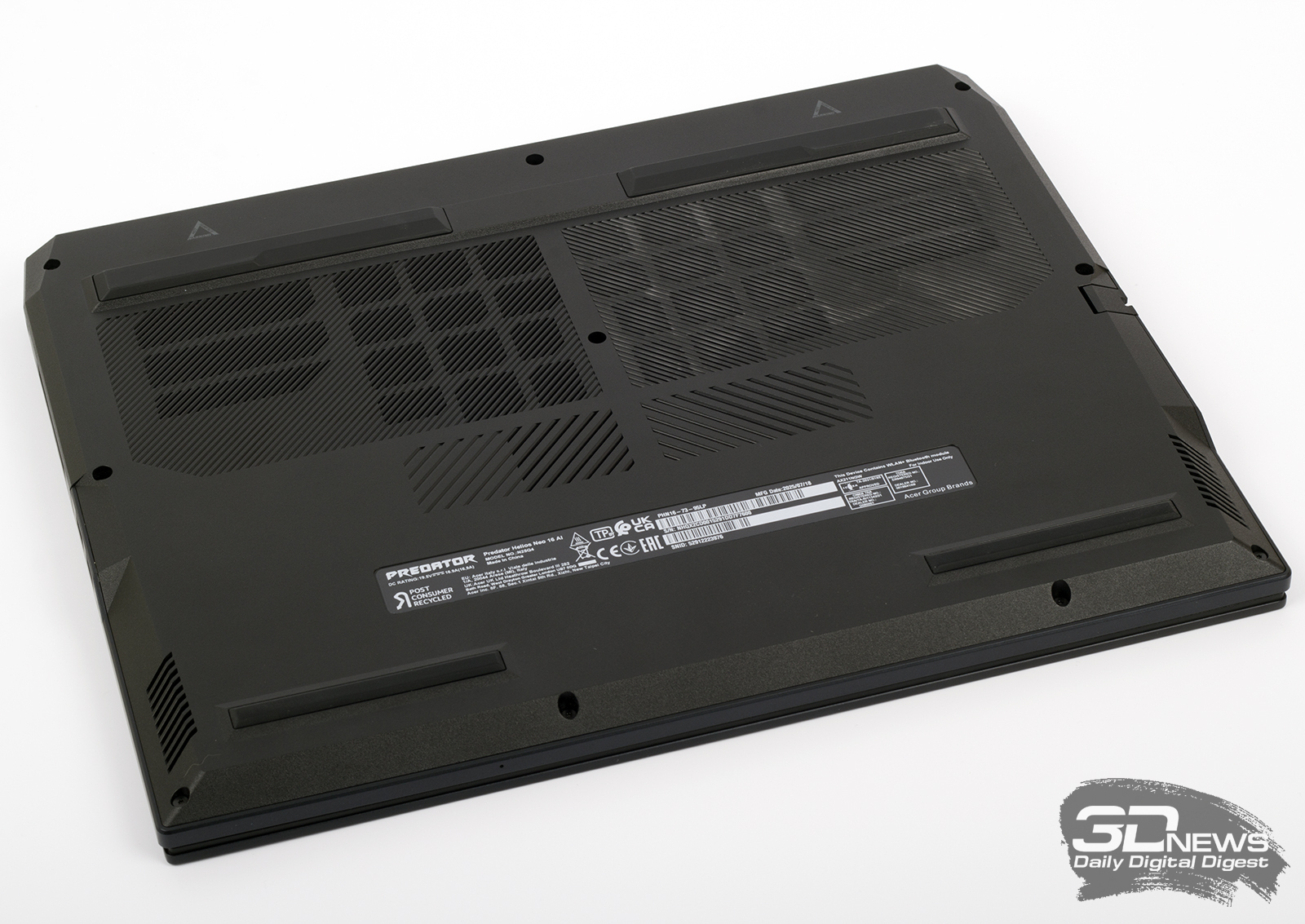 Нижняя панель Predator Helios Neo 16 AI снимается несложно. Сначала откручиваем несколько винтов с torx-шлицем — затем аккуратно отделяем пластину от основания, поддевая защелки тонким плоским предметом. Сама крышка оснащена большим количеством вентиляционных отверстий.