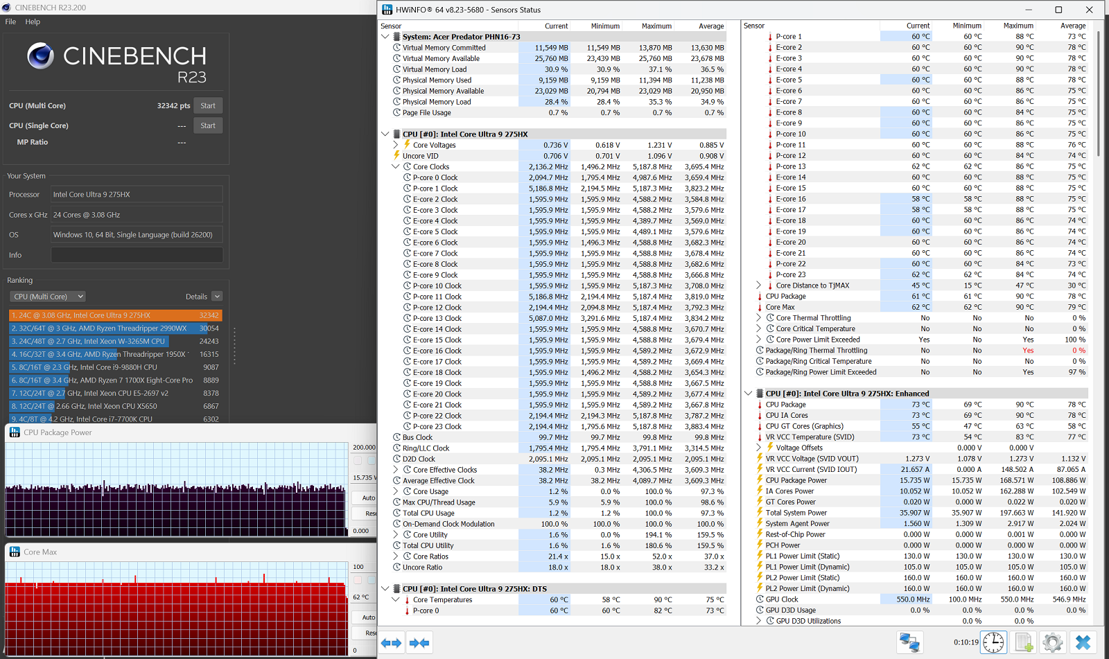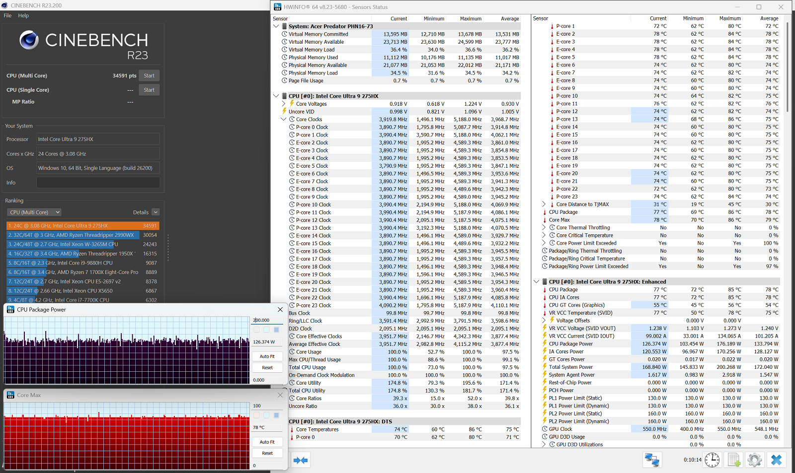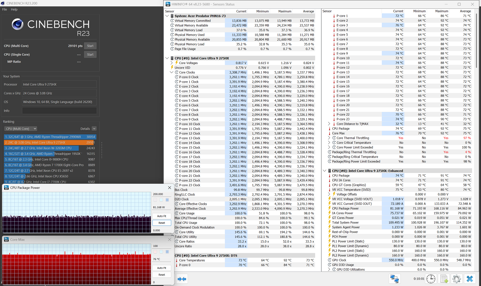 Тестирование Predator Helios Neo 16 AI меня несколько удивило. Я ожидал, что в большинстве режимов центральный процессор лэптопа будет работать с увеличенными лимитами мощности. Мы видим, что Core Ultra 9 275HX в ноутбуке серьезно разогнан. Это стандартная практика для игровых моделей и мобильных рабочих станций класса high-end. Удивляет другое: в режиме «Турбо» 24-ядерный Core работает на очень высокой мощности, но его самые горячие ядра, что называется, не упираются в температурный потолок, установленный Intel. Средний показатель в 134 Вт при максимальном нагреве в 86 градусов Цельсия — да, перед вами очень холодный лэптоп! Естественно, вся эта «красота» достигается за счет очень высокого уровня шума компьютера. Впрочем, верно и то, что в режимах «Производительность» и «Сбалансированный» громкость Predator Helios Neo 16 AI держится комфортных показателей, а пресет «Тихо» частично оправдывает свое название.