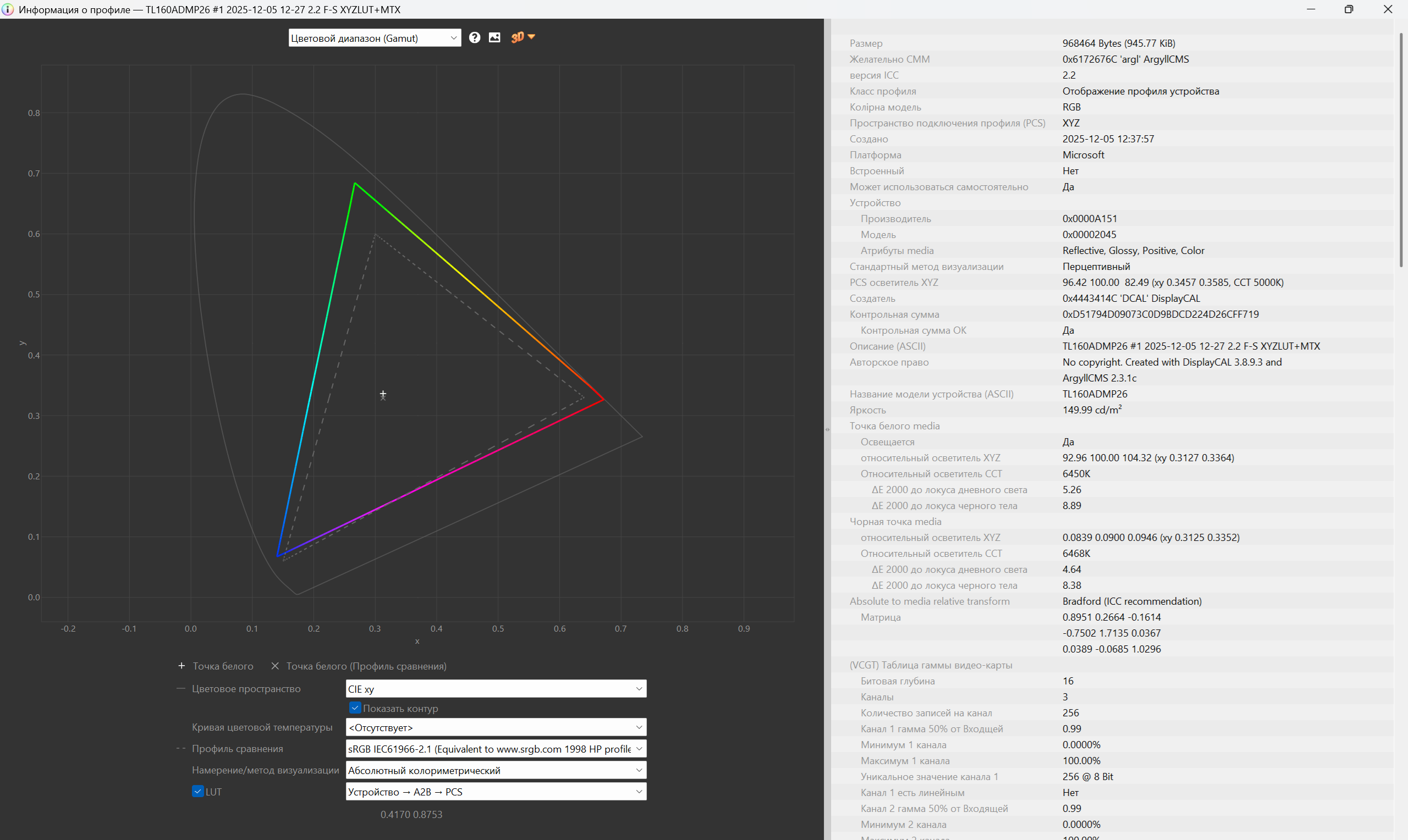 Тестирование дисплея производится при помощи колориметра X-Rite i1Display Pro и приложения DisplayCAL 3.