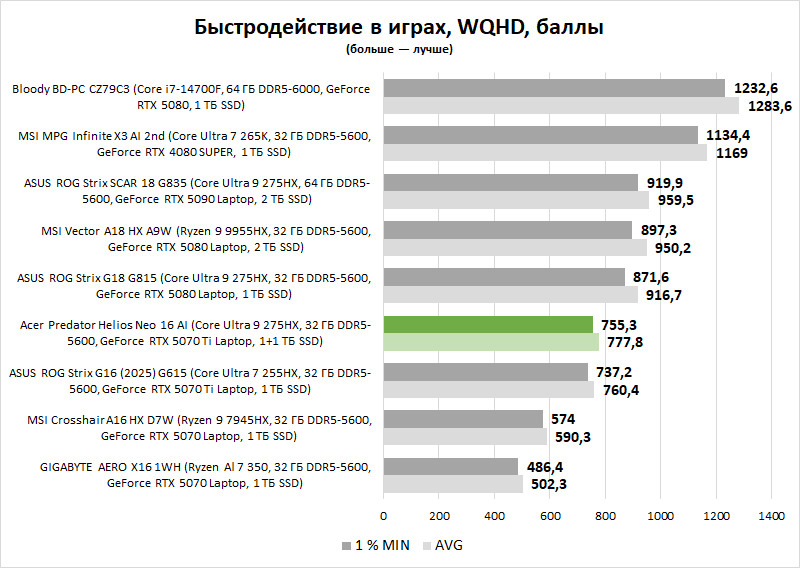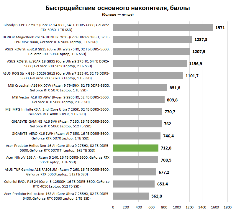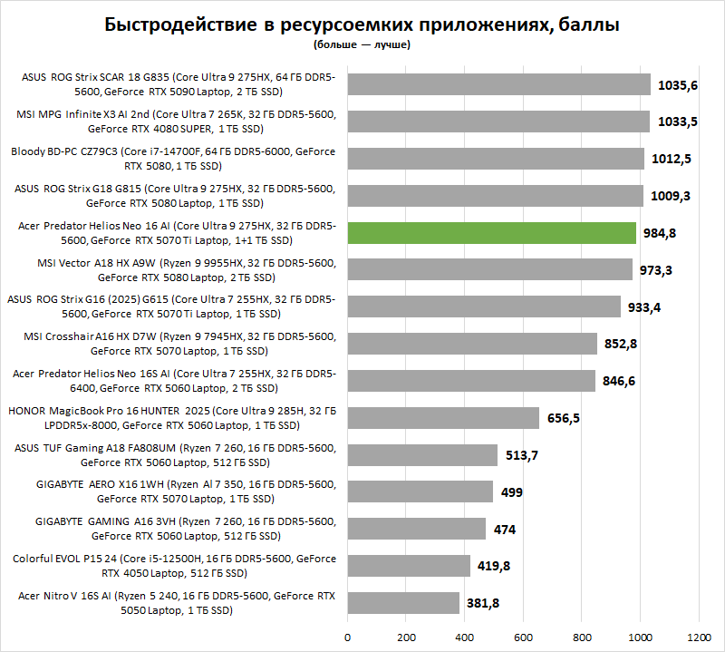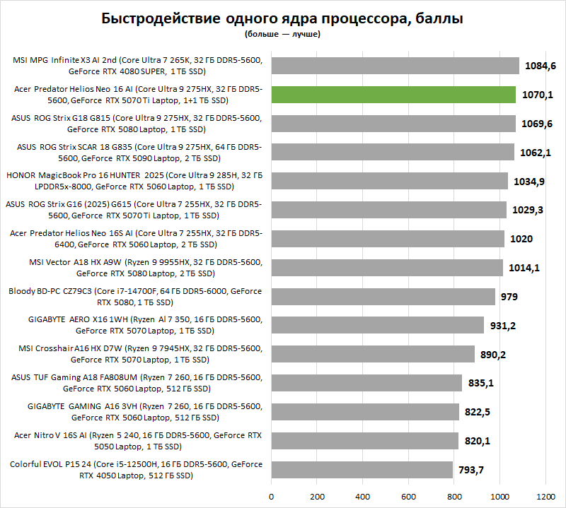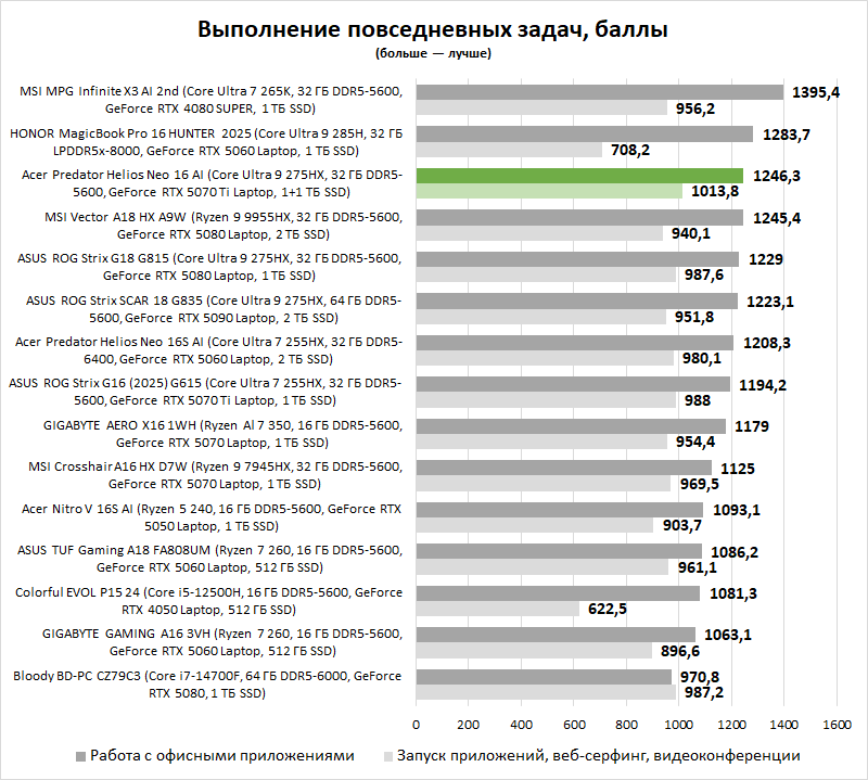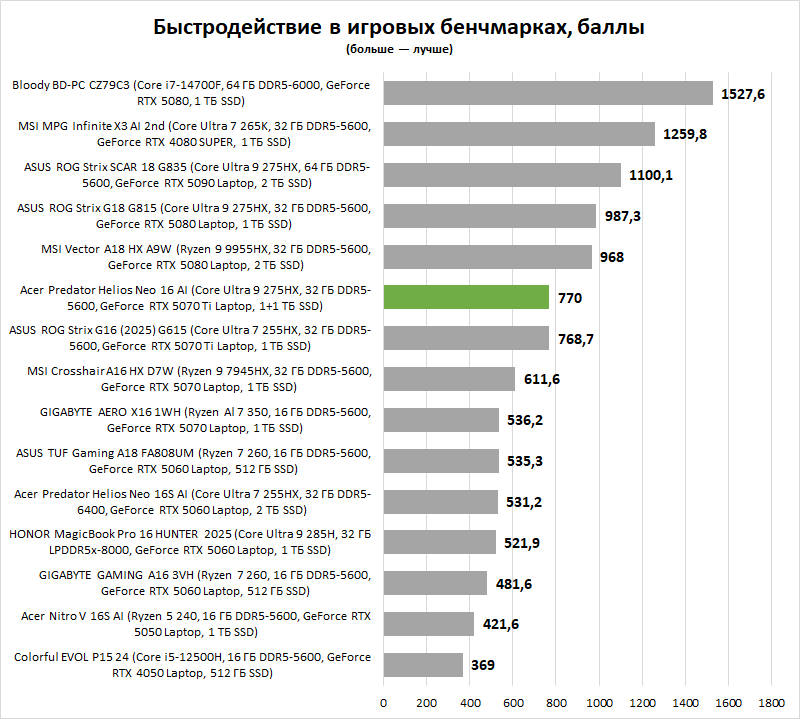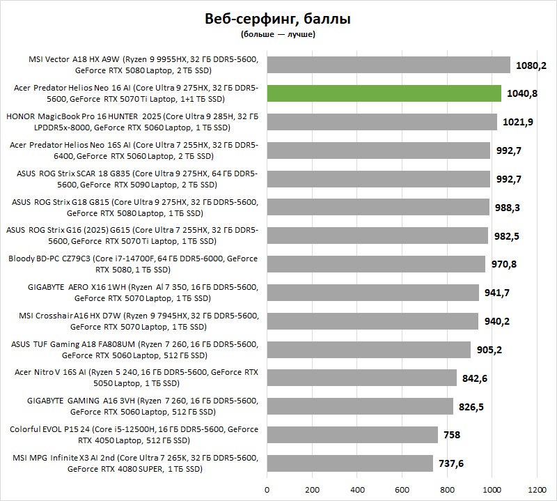 Комментировать результаты тестирования Predator Helios Neo 16 AI нет никакого смысла. Перед вами очень быстрый ноутбук, который может навязать конкуренцию даже современным десктопам.