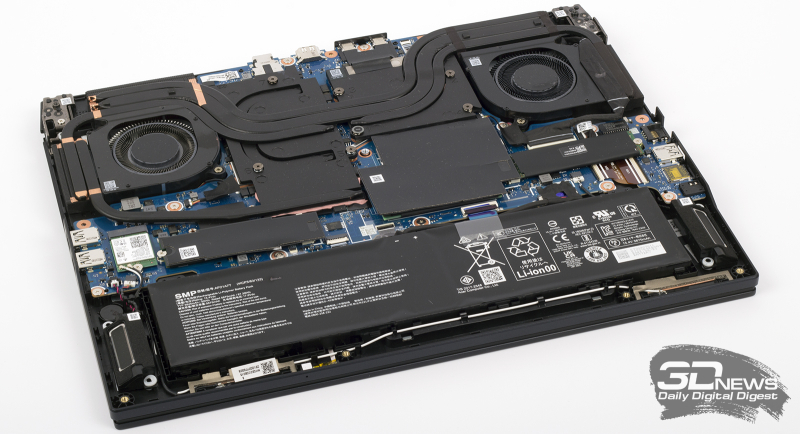 Система охлаждения ноутбука насчитывает шесть медных теплотрубок, четыре радиатора и два вентилятора. Схема работы — замудренная, так как часть теплотрубок отвечает за стабильную работу чипов памяти GeForce RTX 5070 Ti и конвертера питания GPU.