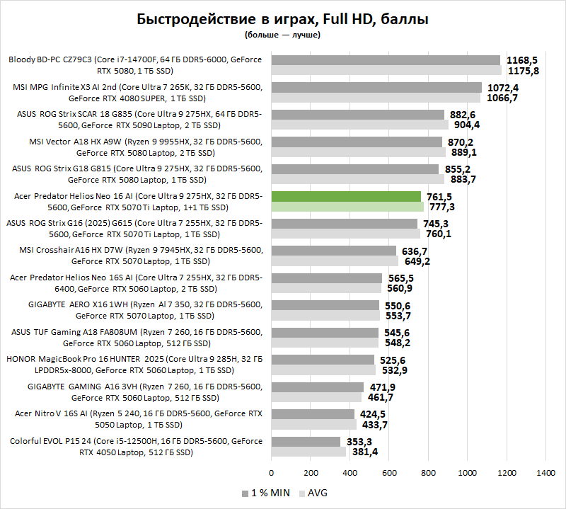 Для наглядного сравнения различных моделей ноутбуков, моноблоков и прочих игровых ПК мы ввели индекс производительности, в котором за 100 % приняты результаты тестирования эталонной системы. В ее состав входят центральный процессор Core i7-14700KF (профиль Intel), оперативная память DDR5-7600 (36-48-48-84), видеокарта GeForce RTX 5070 и твердотельный накопитель Intel 760p 2 Тбайт. Баллы рассчитываются в процентах от быстродействия эталонной игровой системы, умноженных на 10. В стенде использовалась операционная система Windows 11 со всеми установленными обновлениями (весна 2025 г.) и драйверами, включая GeForce Game Ready Driver 576.40 и Intel Chipset Driver 10.1.20020.8623