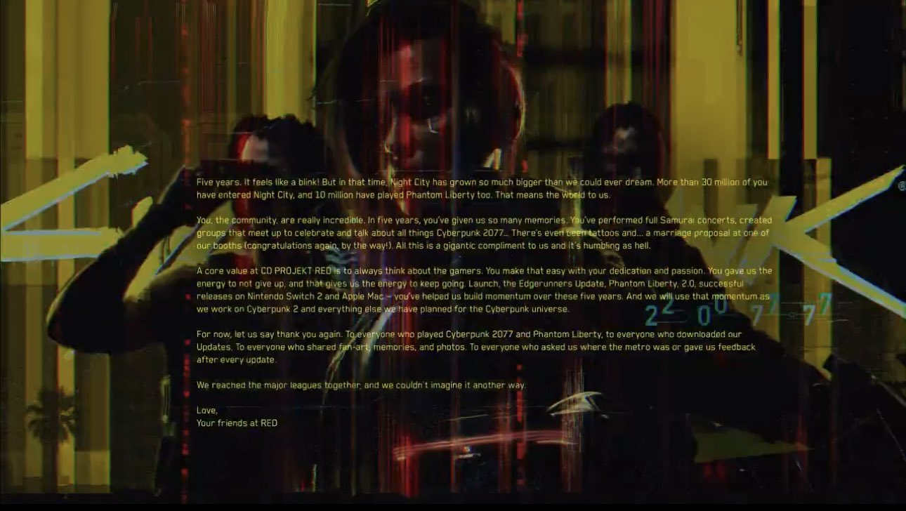 По случаю памятной даты CD Projekt Red представила специальный трейлер. Ролик называется «Город легенд» (City of Legends), включает кавер песни Never Fade Away и секретное послание от разработчиков (мелькает на 2:14).