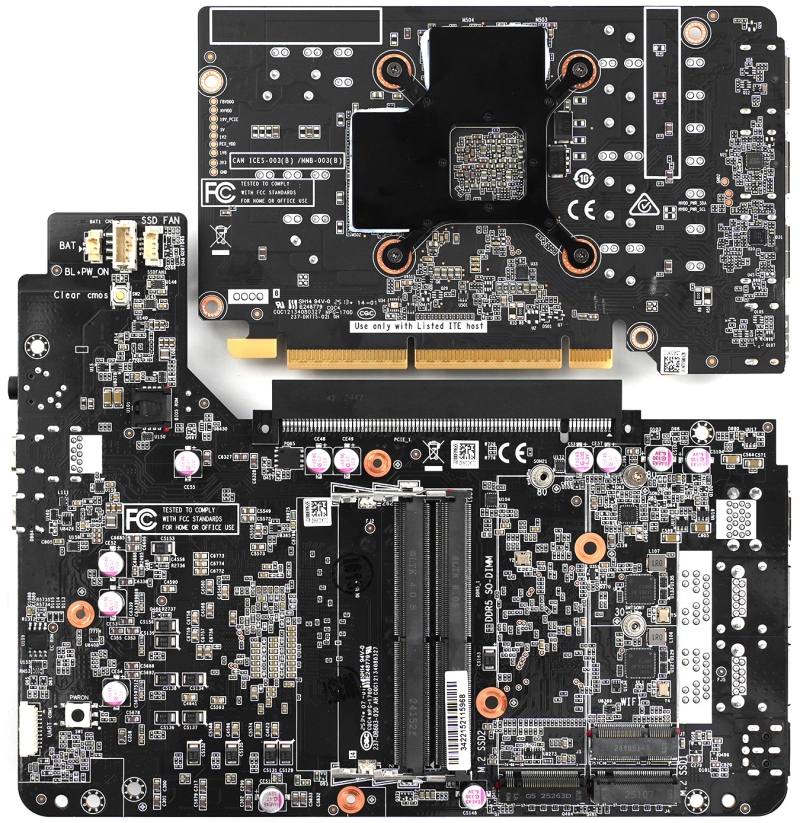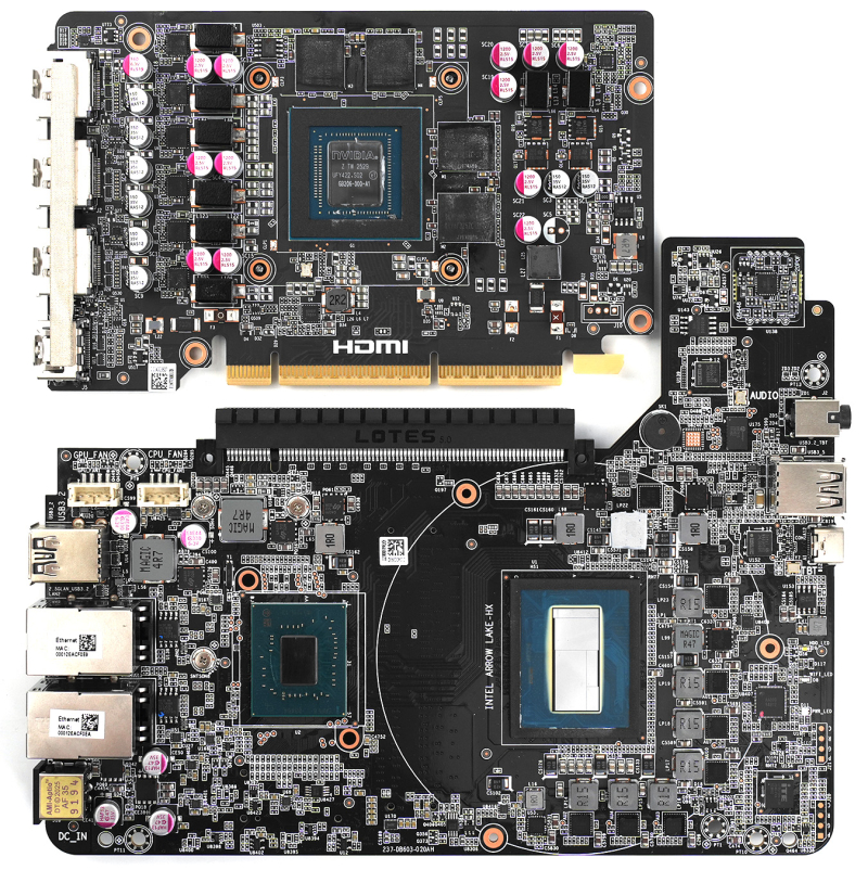 На первый взгляд видеокарта выглядит как обычная десктопная версия. Однако у неё отсутствуют разъёмы для подключения внешних кабелей питания. Вместо них карта получает дополнительное питание через часть интерфейса PCIe x16. Он разделён на две секции: первая секция x8 используется для передачи данных, вторая перепрофилирована под подачу питания 19 В от кастомного слота PCIe на материнской плате мини-ПК, что обеспечивает GPU мощность до 180 Вт.