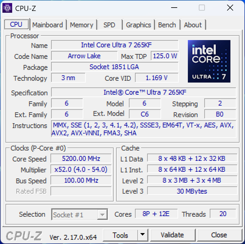 Архитектура Core Ultra 7 265KF — гибридная, она знакома по предыдущим поколениям Core и означает соседство в CPU двух типов ядер. Вместе с тем сами эти ядра заметно продвинулись вперёд. По данным Intel, новые производительные ядра Lion Cove превосходят Raptor Cove по IPC на 9 %, а эффективные ядра Skymont прибавили относительно Gracemont на 32 % и в целочисленных задачах вплотную приблизились к уровню прежних P-ядер. И действительно, рост внутреннего параллелизма, переработанная входная часть конвейера и увеличенные буферы сделали новые E-ядра значительно мощнее. А если добавить к этому рост L2-кеша P-ядер до 3 Мбайт, который уменьшил их зависимость от более медленного L3, то в целом архитектура Arrow Lake выглядит очень прогрессивно.