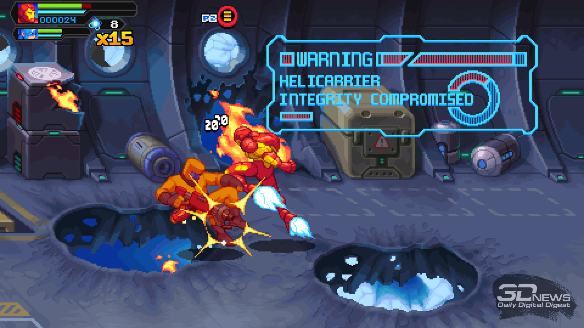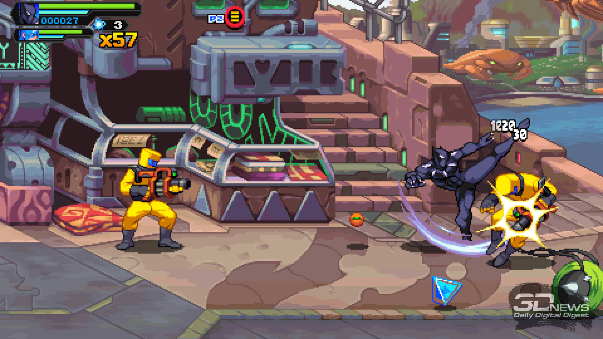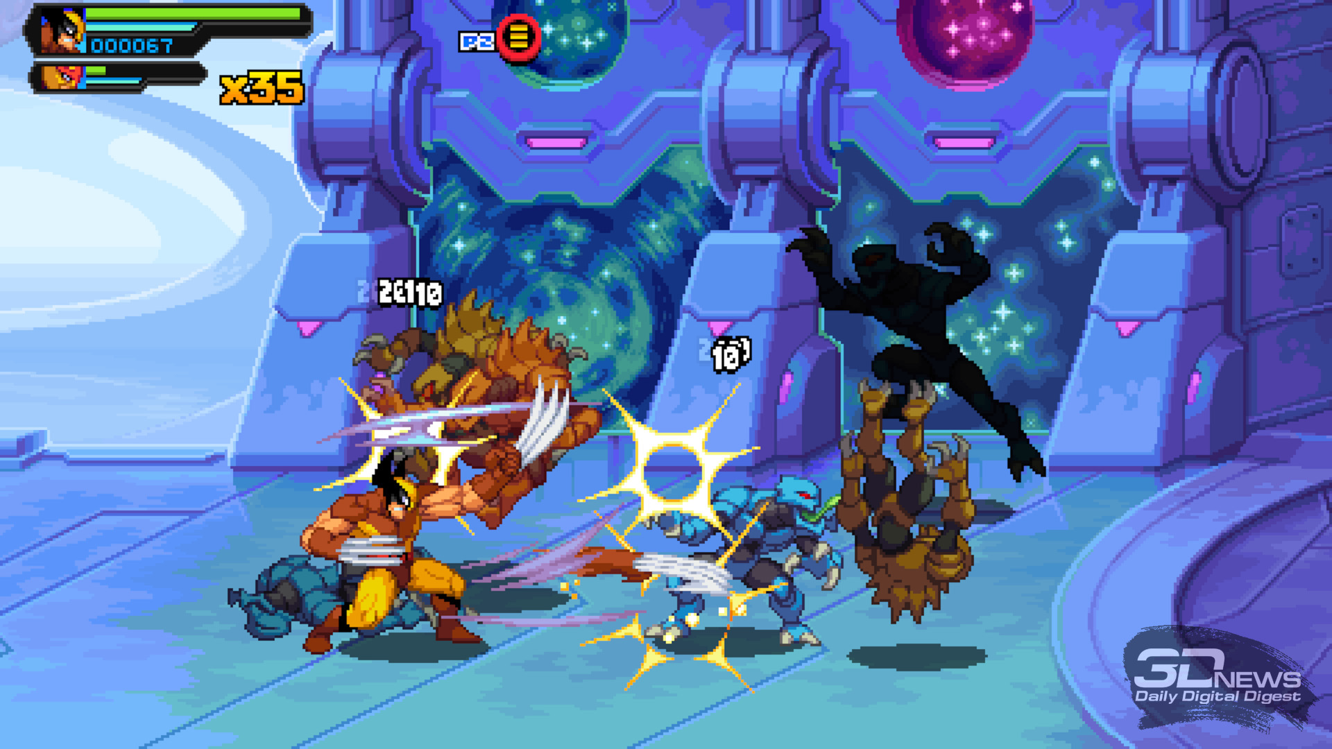 Играли на Xbox Series S В 2022 году выходцы из Ubisoft выпустили Teenage Mutant Ninja Turtles: Shredder’s Revenge — не самый оригинальный, но увлекательный beat ‘em up с Черепашками-ниндзя и их противниками, которых мы с детства знаем по именам. Спустя три с лишним года коллектив Tribute Games снова пытается пробудить ностальгические чувства пиксельной графикой и геймплеем с аркадных автоматов. После «Черепашек» фанаты возлагали на Marvel Cosmic Invasion большие надежды. По большей части игра удалась, но нужно быть готовым к тому, что привычная для разработчиков формула не получила развития. ⇡#Все пригодятсяПоскольку это beat ‘em up, да ещё и по комиксам Marvel, сюжет умещается в пару предложений. Правитель Негативной Зоны, Аннигилус, хочет захватить Галактику, в том числе планету Земля. Супергерои ему мешают, и делают это своим супергеройским способом: отправляются в разные места Ваканды, Диких земель и Геноши и побеждают там противников, разумом которых управляет Аннигилус. Главных его противников — Фантастической четвёрки — в игре почему-то вообще нет, зато есть как знаменитые любимчики из вселенной Marvel (Человек-паук, Веном, Железный человек), так и малоизвестные герои. Например, Бета Рэй Билл и Космический призрачный гонщик, которые за пределами редких комиксов появлялись только в игре Marvel SNAP. Бойцов в два раза больше, чем в «Черепашках», и отличаются они друг от друга гораздо заметнее. Каждый герой обладает уникальными навыками и приёмами, полностью соответствующими тем, которые были у него в комиксах. Капитан Америка швыряет щит, Джин Грей использует телекинез, Росомаха набрасывается на противников и закалывает их длинными когтями. Управляя Женщиной-Халк, будто играешь за рестлера — носишься по арене, хватаешь врагов, подбрасываешь, бьёшь в воздухе ногой, а потом с разбегу плюхаешься на землю. А будучи Человеком-пауком, быстро перемещаешься от одного края арены к другому на паутине, которой потом стреляешь в оппонентов, чтобы их замедлить. Всех персонажей объединяет возможность совершать обычные атаки (и их комбинации) в ближнем бою, а если удерживать кнопку удара, то они применяют заряженные приёмы. Нова, к примеру, создаёт вокруг себя огненный барьер, а Железный человек выпускает энергетическую сферу. Другой кнопкой осуществляется уникальная атака, на которую тратятся заряды (они восстанавливаются со временем). У Чёрной пантеры это клинки из вибраниума, у Шторм — потоки арктического ветра, замедляющие цели. Использовали трижды — и ждите несколько секунд, пока они снова станут доступны. А вот Капитан Америка и Бета Рэй Билл могут кидать щит и молот сколько угодно раз. Главная особенность здешней «боёвки» связана с тем, что перед началом уровня вы выбираете не одного героя, а двоих. Между ними можно свободно переключаться в любой момент — например, чтобы один восстановил здоровье, пока другой дерётся. А ещё напарника позволяют призвать прямо посреди комбо, чтобы он ненадолго появился, раздал тумаков и сразу убежал обратно за пределы экрана. Прежде всего это полезно в драках с крупными противникам и боссами — таким образом удаётся быстро нанести оппоненту много урона. Но и против скоплений врагов призыв оказывается эффективен, хотя в Cosmic Invasion такие ситуации встречаются чуть реже, чем хотелось бы. С таким количеством персонажей глаза разбегаются уже на первом уровне, да и не 