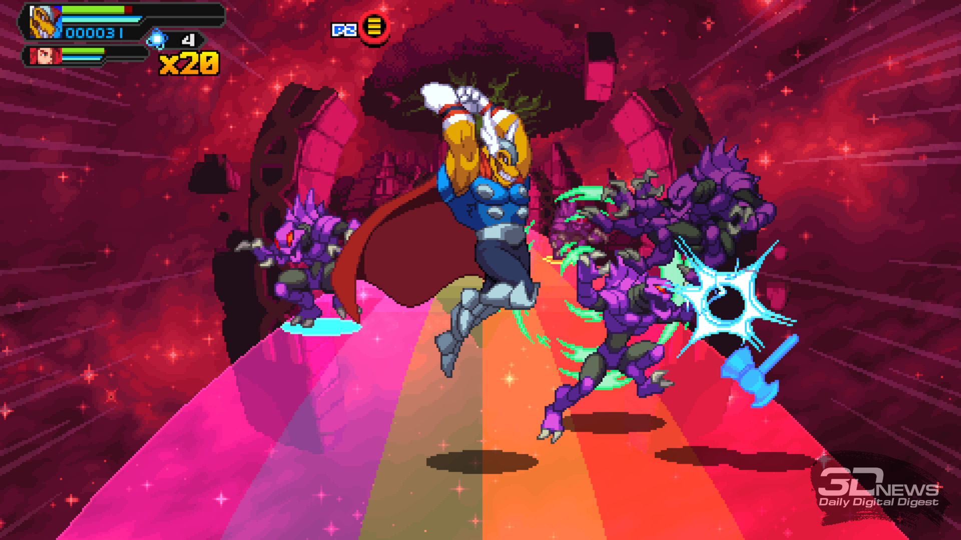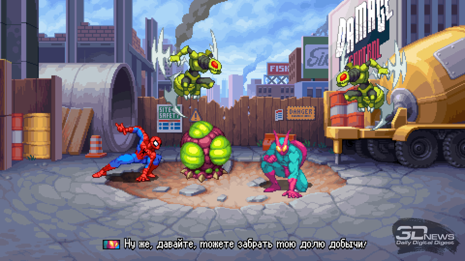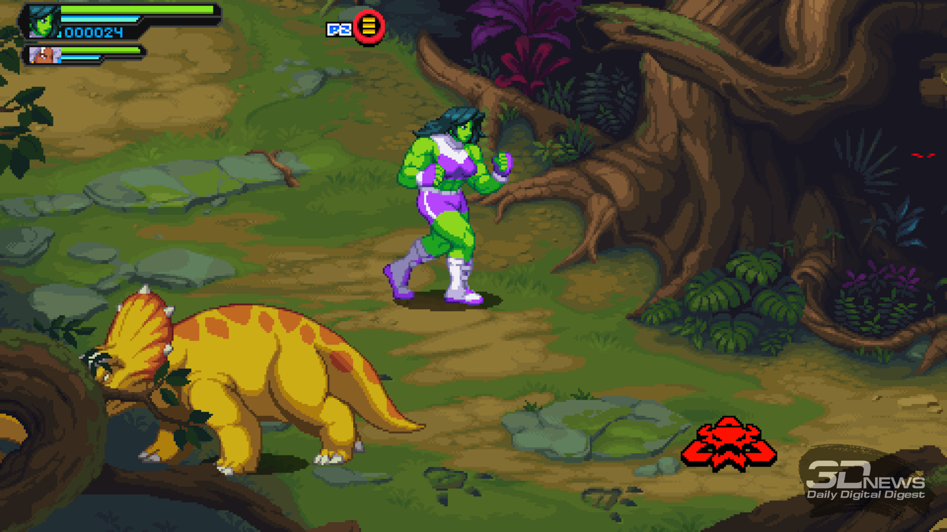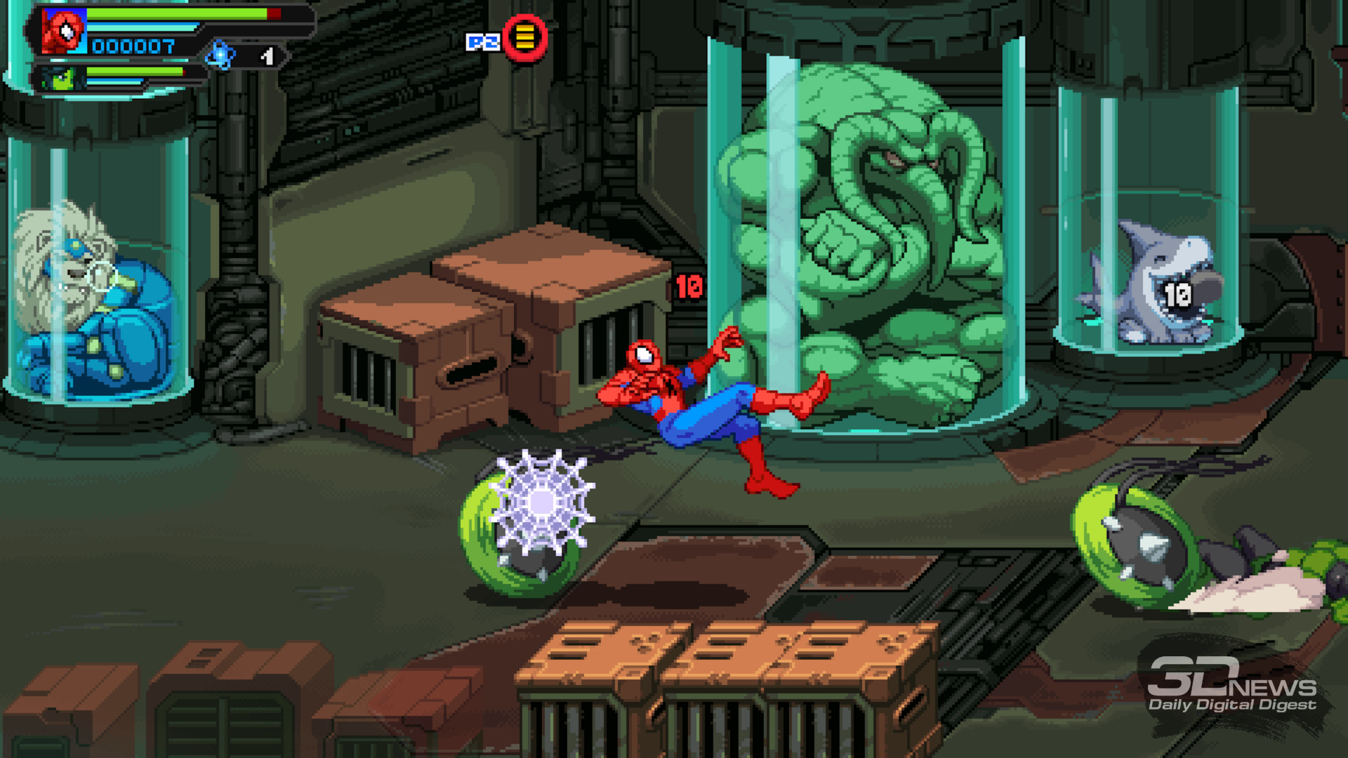 Играли на Xbox Series S В 2022 году выходцы из Ubisoft выпустили Teenage Mutant Ninja Turtles: Shredder’s Revenge — не самый оригинальный, но увлекательный beat ‘em up с Черепашками-ниндзя и их противниками, которых мы с детства знаем по именам. Спустя три с лишним года коллектив Tribute Games снова пытается пробудить ностальгические чувства пиксельной графикой и геймплеем с аркадных автоматов. После «Черепашек» фанаты возлагали на Marvel Cosmic Invasion большие надежды. По большей части игра удалась, но нужно быть готовым к тому, что привычная для разработчиков формула не получила развития. ⇡#Все пригодятсяПоскольку это beat ‘em up, да ещё и по комиксам Marvel, сюжет умещается в пару предложений. Правитель Негативной Зоны, Аннигилус, хочет захватить Галактику, в том числе планету Земля. Супергерои ему мешают, и делают это своим супергеройским способом: отправляются в разные места Ваканды, Диких земель и Геноши и побеждают там противников, разумом которых управляет Аннигилус. Главных его противников — Фантастической четвёрки — в игре почему-то вообще нет, зато есть как знаменитые любимчики из вселенной Marvel (Человек-паук, Веном, Железный человек), так и малоизвестные герои. Например, Бета Рэй Билл и Космический призрачный гонщик, которые за пределами редких комиксов появлялись только в игре Marvel SNAP. Бойцов в два раза больше, чем в «Черепашках», и отличаются они друг от друга гораздо заметнее. Каждый герой обладает уникальными навыками и приёмами, полностью соответствующими тем, которые были у него в комиксах. Капитан Америка швыряет щит, Джин Грей использует телекинез, Росомаха набрасывается на противников и закалывает их длинными когтями. Управляя Женщиной-Халк, будто играешь за рестлера — носишься по арене, хватаешь врагов, подбрасываешь, бьёшь в воздухе ногой, а потом с разбегу плюхаешься на землю. А будучи Человеком-пауком, быстро перемещаешься от одного края арены к другому на паутине, которой потом стреляешь в оппонентов, чтобы их замедлить. Всех персонажей объединяет возможность совершать обычные атаки (и их комбинации) в ближнем бою, а если удерживать кнопку удара, то они применяют заряженные приёмы. Нова, к примеру, создаёт вокруг себя огненный барьер, а Железный человек выпускает энергетическую сферу. Другой кнопкой осуществляется уникальная атака, на которую тратятся заряды (они восстанавливаются со временем). У Чёрной пантеры это клинки из вибраниума, у Шторм — потоки арктического ветра, замедляющие цели. Использовали трижды — и ждите несколько секунд, пока они снова станут доступны. А вот Капитан Америка и Бета Рэй Билл могут кидать щит и молот сколько угодно раз. Главная особенность здешней «боёвки» связана с тем, что перед началом уровня вы выбираете не одного героя, а двоих. Между ними можно свободно переключаться в любой момент — например, чтобы один восстановил здоровье, пока другой дерётся. А ещё напарника позволяют призвать прямо посреди комбо, чтобы он ненадолго появился, раздал тумаков и сразу убежал обратно за пределы экрана. Прежде всего это полезно в драках с крупными противникам и боссами — таким образом удаётся быстро нанести оппоненту много урона. Но и против скоплений врагов призыв оказывается эффективен, хотя в Cosmic Invasion такие ситуации встречаются чуть реже, чем хотелось бы. С таким количеством персонажей глаза разбегаются уже на первом уровне, да и не 