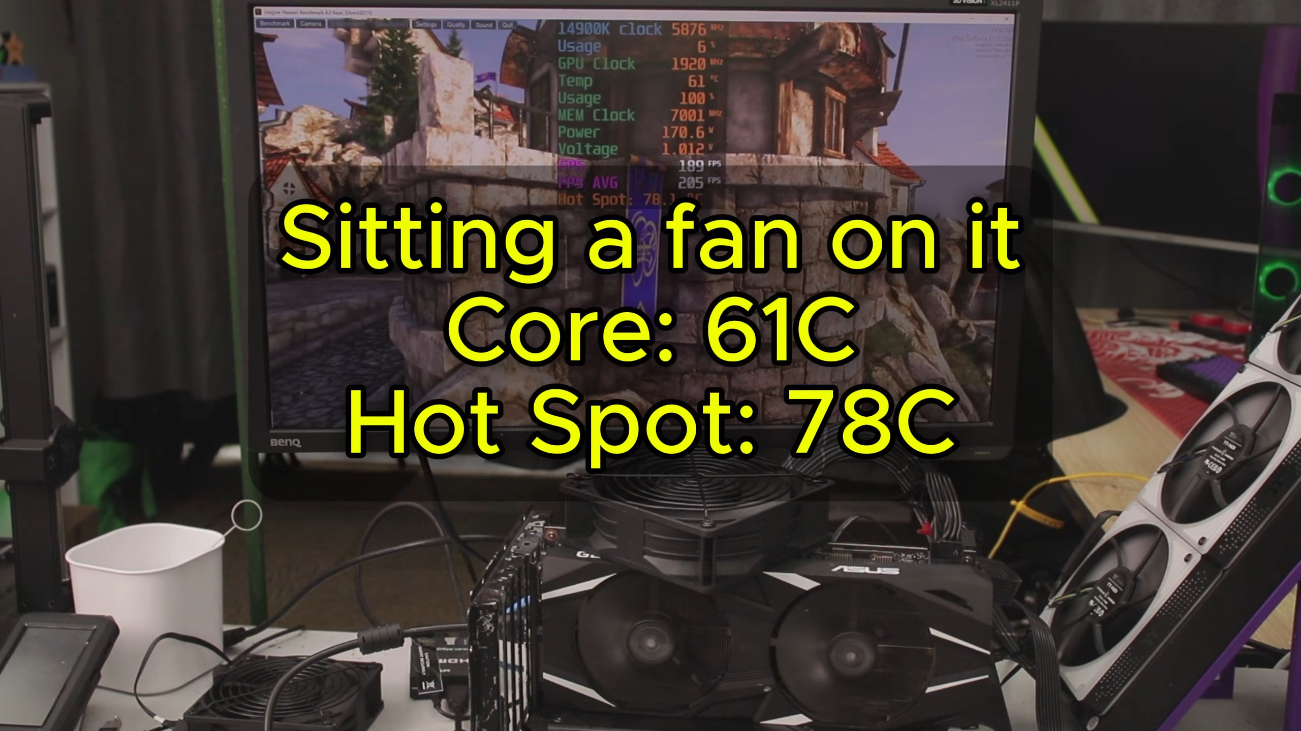 Затем ютубер протестировал конфигурацию с голой печатной платой, дополненной радиаторами и вентилятором, что позволило снизить среднюю температуру GPU до 64 °C и до 82 °C в самой горячей точке. Добавление обычного бокового вентилятора снизило показатели до 61 и 78 °C соответственно.