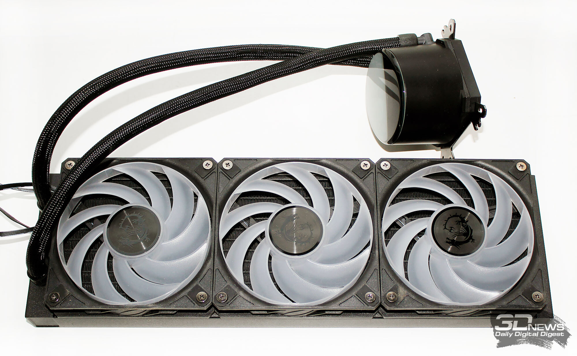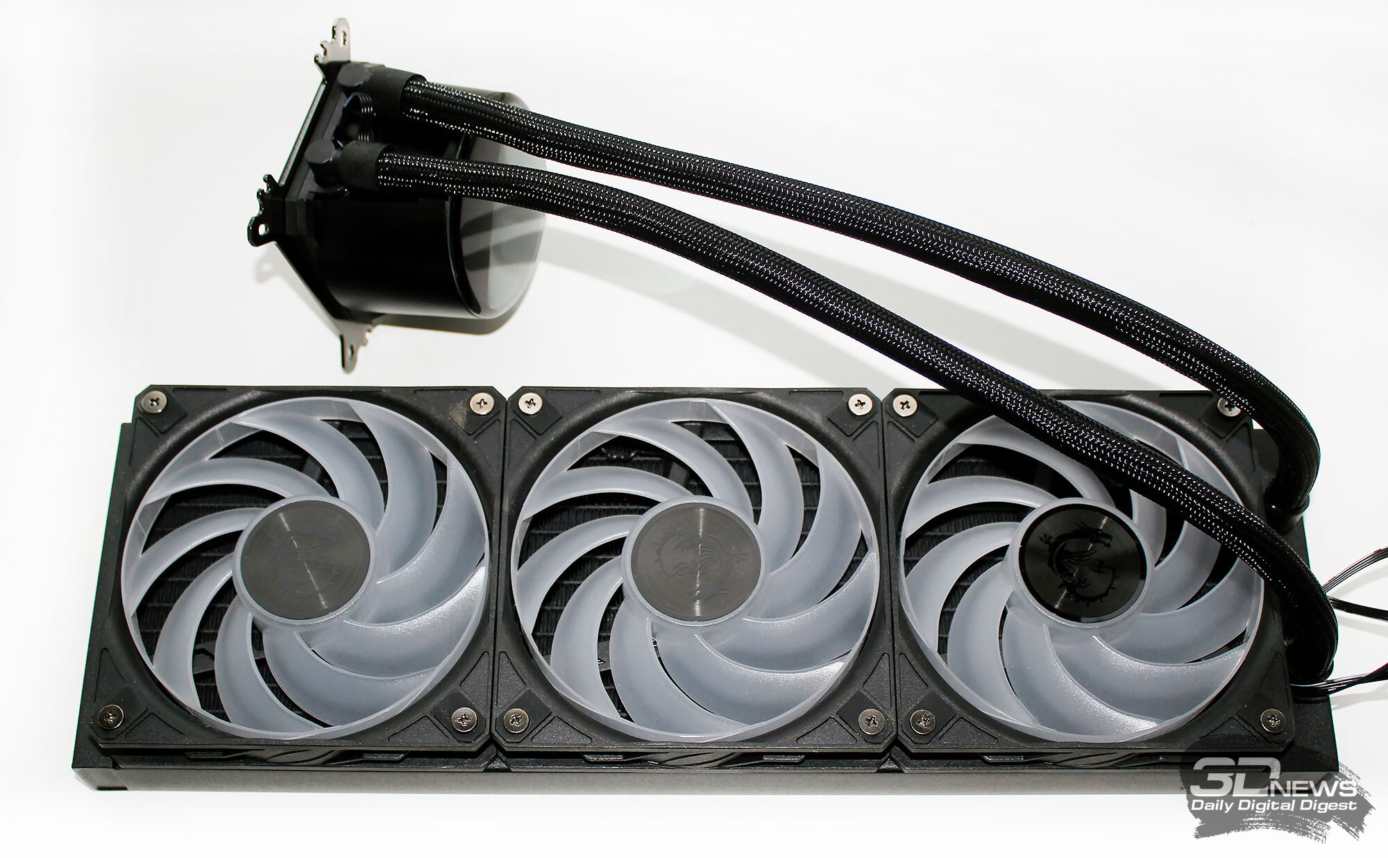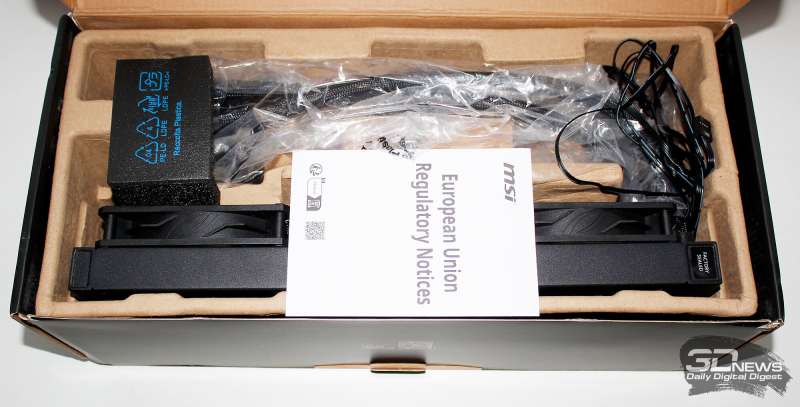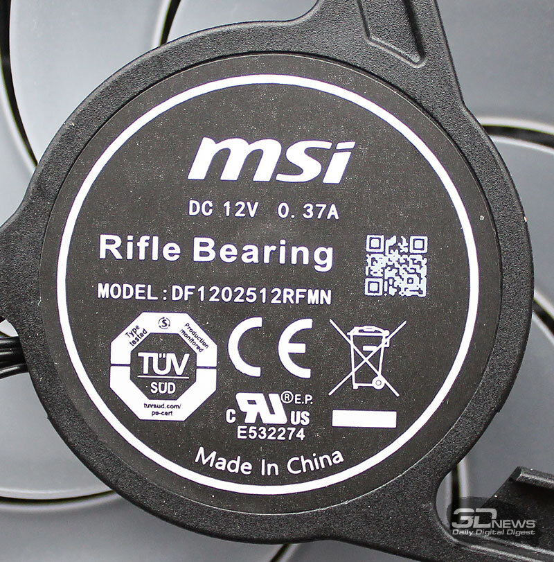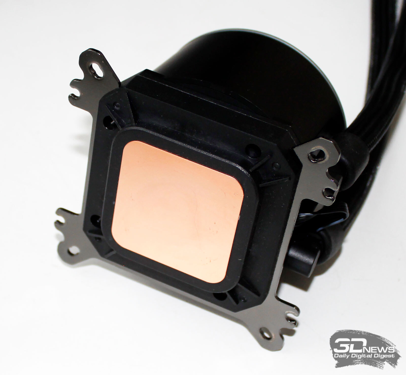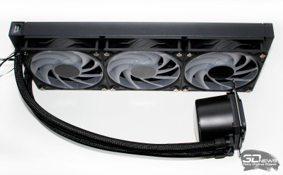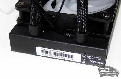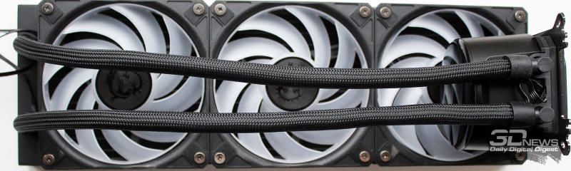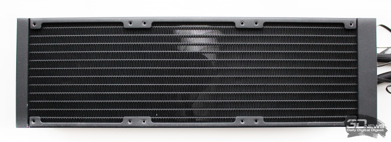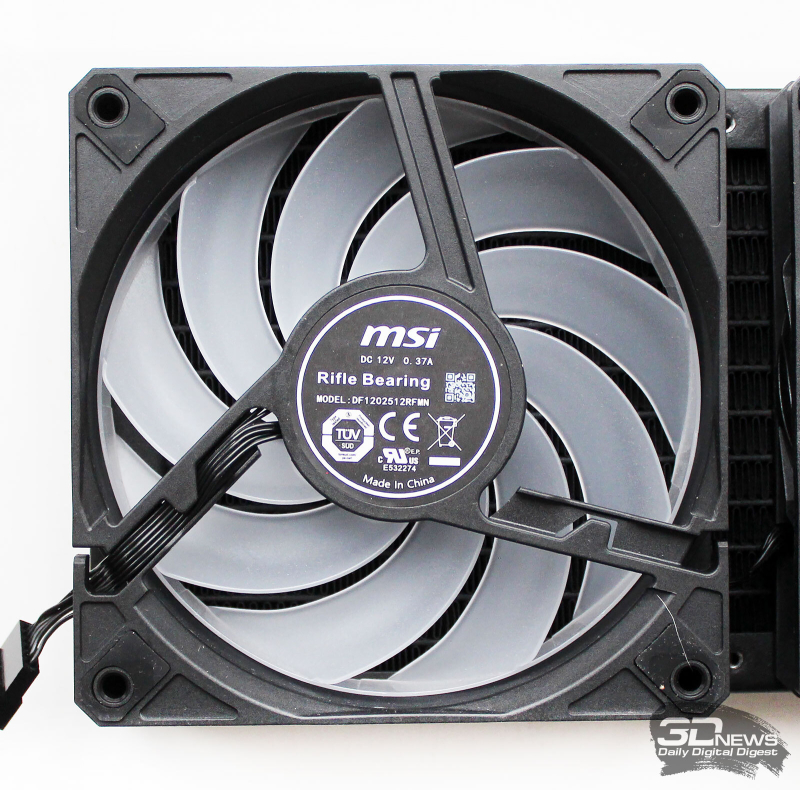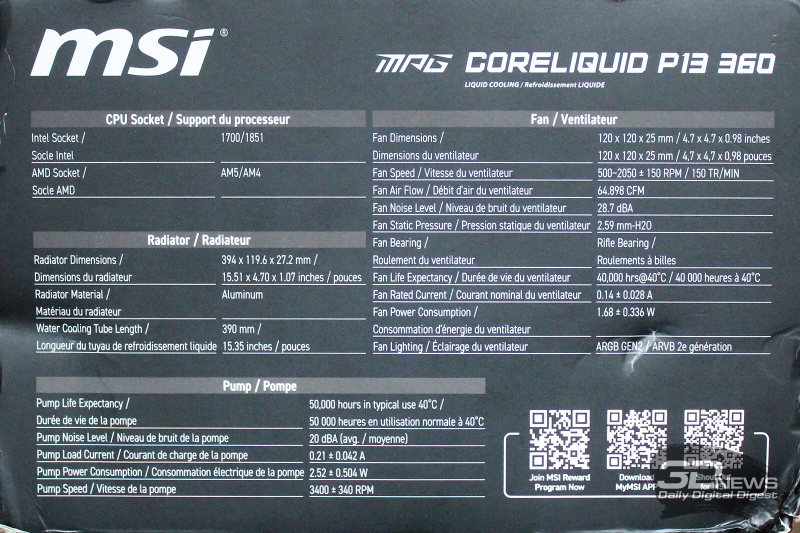 ⇡#Упаковка и комплектацияКартонная коробка, в которой поставляется MSI MPG CoreLiquid P13, выглядит очень ярко и стильно. На её лицевой стороне приведено крупное фото СЖО с работающими вентиляторами и помпой, а ниже указана серия и модель системы. На противоположной стороне коробки внимание концентрируется на экране помпы с «каруселью» из разных режимов его работы. Технические характеристики СЖО размещены на одном из торцов упаковки, где также можно найти перечень поддерживаемых процессорных сокетов и QR-коды на загрузку программного обеспечения. В цветную коробку вставлена корзина из пористого картона с отсеками под компоненты системы жидкостного охлаждения. Это достаточно надёжная упаковка, выдерживающая все перипетии российско-китайской доставки. Комплектующие СЖО находятся в отдельной коробочке, к которой прилагается гарантийная памятка. А вот бумажной инструкции по установке в комплекте MPG CoreLiquid P13 почему-то не нашлось. В коробочке находятся усилительная пластина для Intel, четыре набора винтов, втулок и шпилек, декоративная панель и термопаста. MSI MPG CoreLiquid P13 выпускается в Китае. Стоимость СЖО в России составляет 11600 рублей, гарантия – 3 года. ⇡#Особенности конструкцииСистема жидкостного охлаждения MSI MPG CoreLiquid P13 доступна в белом и чёрном оформлении. Как раз последний вариант мы сегодня и тестируем. Система построена по классической схеме, когда 360-мм радиатор соединён двумя гибкими шлангами трубками с блоком помпы и водоблока. Внешне модель MPG CoreLiquid P13 почти не отличается от ранее протестированной нами MAG CoreLiquid A13 360, разве что дизайн водоблока здесь другой. Общая масса системы без учёта креплений, монтируемых на материнскую плату, составляет 1712 граммов, – плюс-минус обычное значение для СЖО 360-мм форм-фактора. Радиатор выполнен из алюминия, его размеры равны 394 × 120 × 27 мм. При этом размеры так называемого «рабочего тела» радиатора (плоские каналы и перфорированная лента между ними) составляют 359 × 117 × 20,5 мм. Всего в радиаторе двенадцать каналов, по которым прокачивается теплоноситель, а плотность радиатора равна стандартным для СЖО этого класса 20-21 FPI. Торцы радиатора ничем примечательным не выделяются: из основного выходят два статичных фитинга с опрессованными на них шлангами, а на противоположном вообще ничего нет (да и не должно быть). Радиатор с помпой соединены парой шлангов из синтетического каучука (EPDM) в нейлоновой оплётке. Их длина равна 370 мм. Соединительных хомутов на шлангах нет. Как вы уже наверняка для себя отметили, радиатор и шланги в MPG CoreLiquid P13 абсолютно стандартны и ничем не отличаются как от других моделей СЖО компании MSI, так и от систем жидкостного охлаждения иных производителей. А вот помпа и вентиляторы отличаются. Итак, помпа. Её размеры равны 85 × 80 × 73 мм, а дизайн можно назвать минималистичным: эдакий короткий бочонок с чёрной глянцевой крышкой, в которую встроен 2,1-дюймовый IPS LCD-дисплей. Сразу обращает на себя внимание отсутствие каких-либо кабелей у помпы, но подробнее мы об этом расскажем чуть позже. Скорость вращения ротора заявлена на отметке 3400 об/мин, что было подтверждено данными мониторинга. Интересно, что при такой довольно высокой скорости ротора энергопотребление насоса составило 2,5 ватта и соответствует указанному в её характеристиках. Уровень шума не должен превышать 20 дБА – это очень низкое 