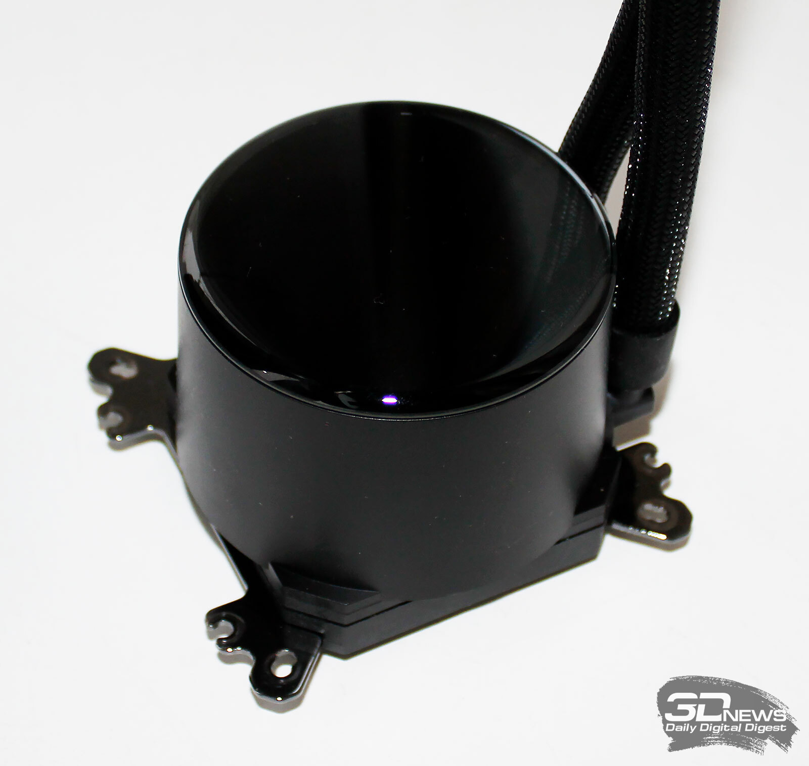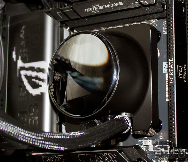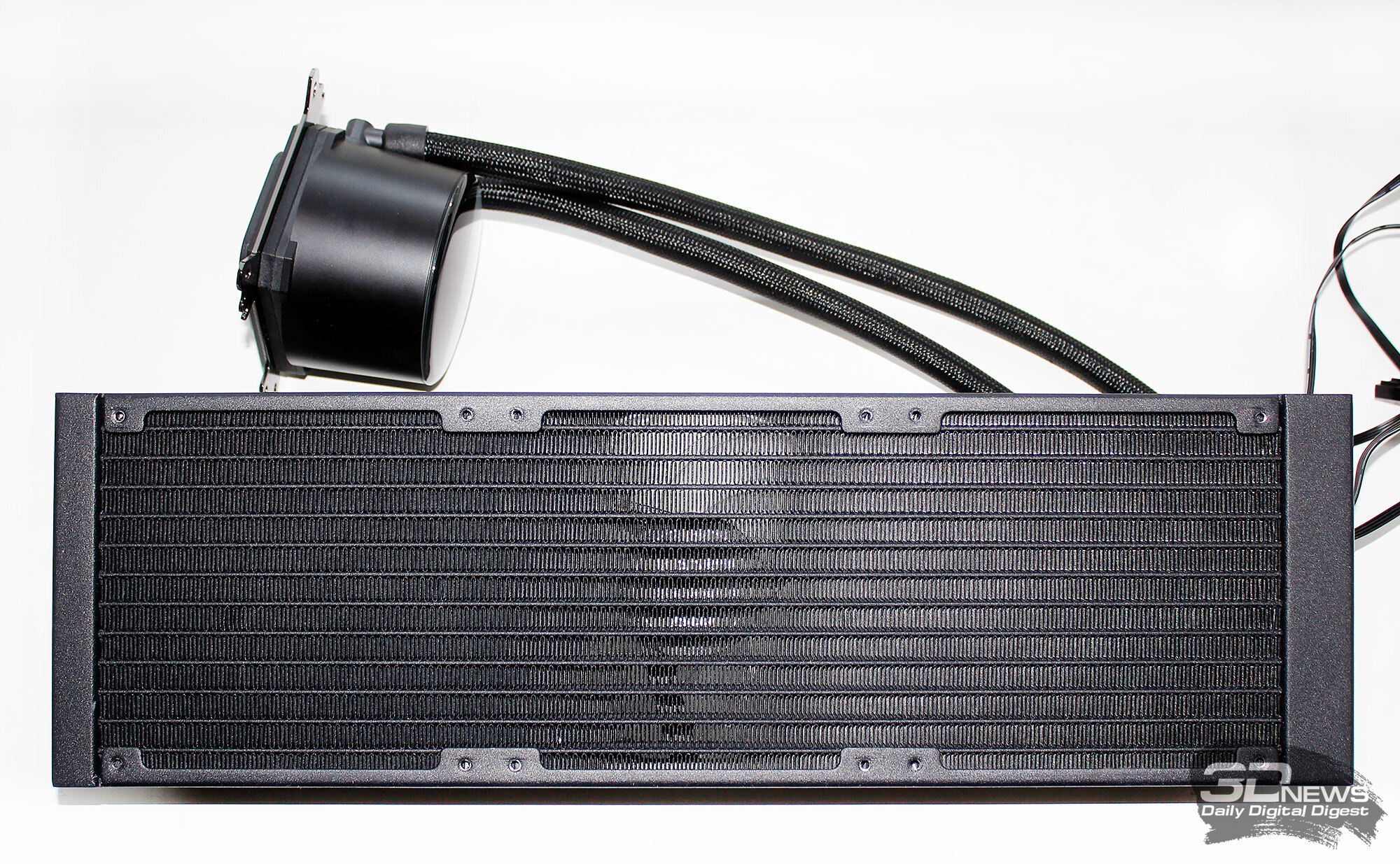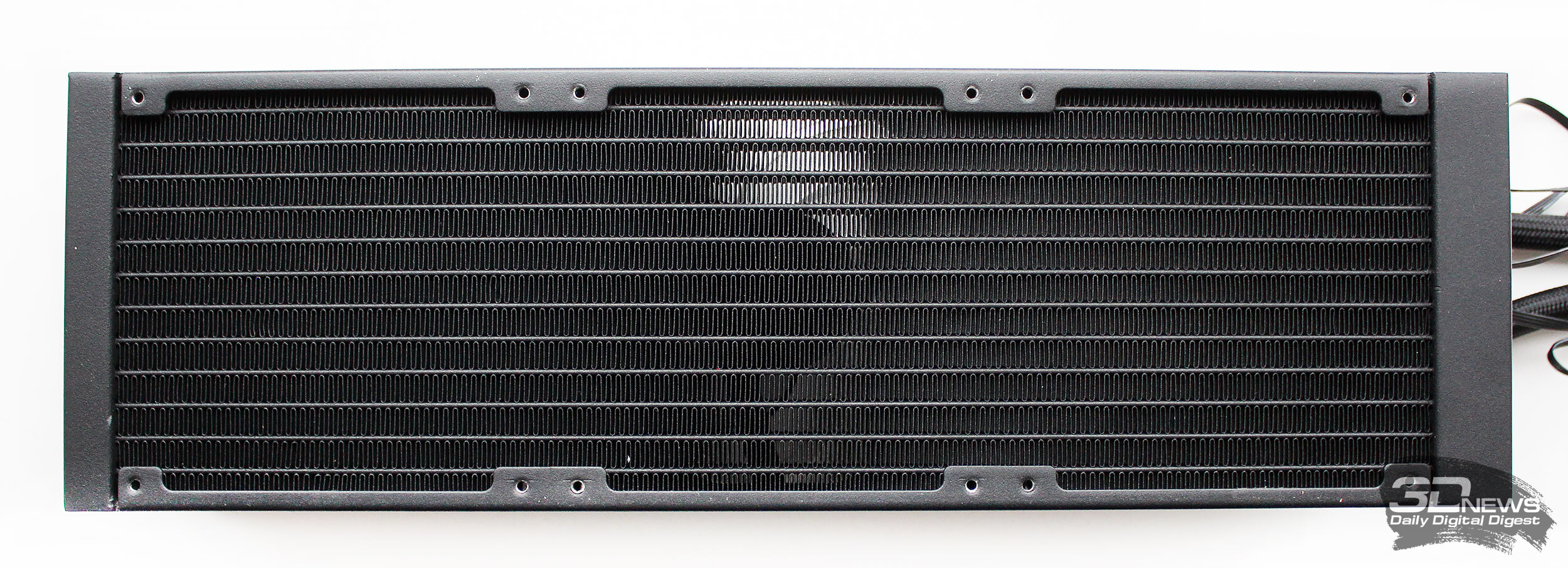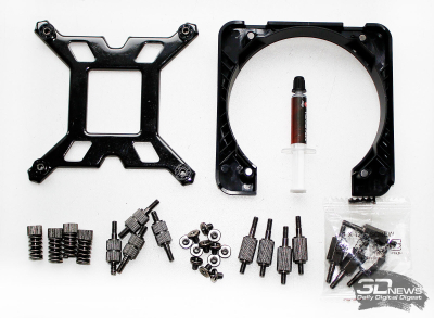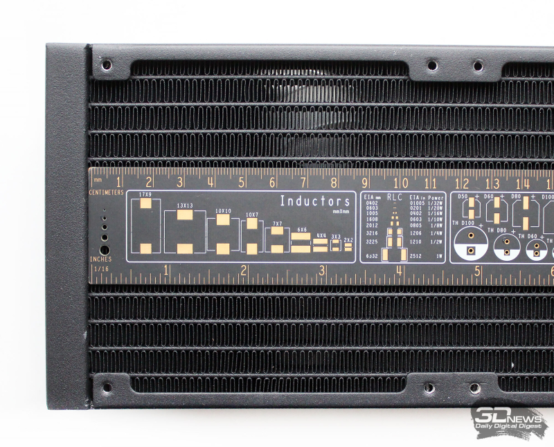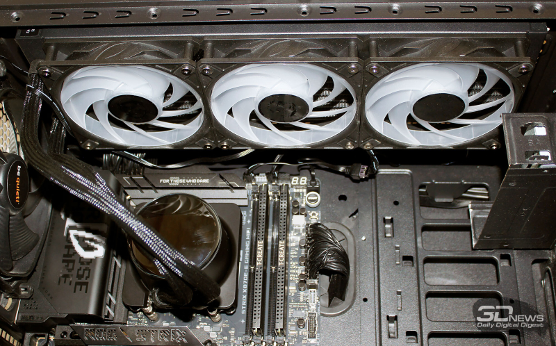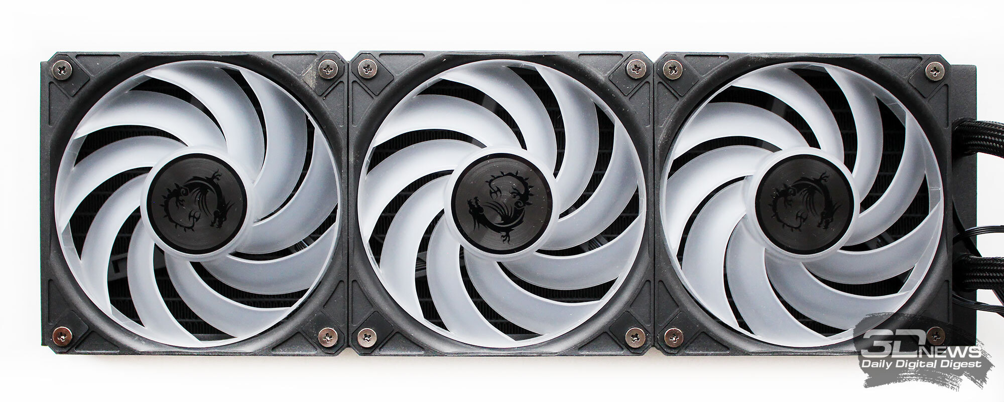 ⇡#Упаковка и комплектацияКартонная коробка, в которой поставляется MSI MPG CoreLiquid P13, выглядит очень ярко и стильно. На её лицевой стороне приведено крупное фото СЖО с работающими вентиляторами и помпой, а ниже указана серия и модель системы. На противоположной стороне коробки внимание концентрируется на экране помпы с «каруселью» из разных режимов его работы. Технические характеристики СЖО размещены на одном из торцов упаковки, где также можно найти перечень поддерживаемых процессорных сокетов и QR-коды на загрузку программного обеспечения. В цветную коробку вставлена корзина из пористого картона с отсеками под компоненты системы жидкостного охлаждения. Это достаточно надёжная упаковка, выдерживающая все перипетии российско-китайской доставки. Комплектующие СЖО находятся в отдельной коробочке, к которой прилагается гарантийная памятка. А вот бумажной инструкции по установке в комплекте MPG CoreLiquid P13 почему-то не нашлось. В коробочке находятся усилительная пластина для Intel, четыре набора винтов, втулок и шпилек, декоративная панель и термопаста. MSI MPG CoreLiquid P13 выпускается в Китае. Стоимость СЖО в России составляет 11600 рублей, гарантия – 3 года. ⇡#Особенности конструкцииСистема жидкостного охлаждения MSI MPG CoreLiquid P13 доступна в белом и чёрном оформлении. Как раз последний вариант мы сегодня и тестируем. Система построена по классической схеме, когда 360-мм радиатор соединён двумя гибкими шлангами трубками с блоком помпы и водоблока. Внешне модель MPG CoreLiquid P13 почти не отличается от ранее протестированной нами MAG CoreLiquid A13 360, разве что дизайн водоблока здесь другой. Общая масса системы без учёта креплений, монтируемых на материнскую плату, составляет 1712 граммов, – плюс-минус обычное значение для СЖО 360-мм форм-фактора. Радиатор выполнен из алюминия, его размеры равны 394 × 120 × 27 мм. При этом размеры так называемого «рабочего тела» радиатора (плоские каналы и перфорированная лента между ними) составляют 359 × 117 × 20,5 мм. Всего в радиаторе двенадцать каналов, по которым прокачивается теплоноситель, а плотность радиатора равна стандартным для СЖО этого класса 20-21 FPI. Торцы радиатора ничем примечательным не выделяются: из основного выходят два статичных фитинга с опрессованными на них шлангами, а на противоположном вообще ничего нет (да и не должно быть). Радиатор с помпой соединены парой шлангов из синтетического каучука (EPDM) в нейлоновой оплётке. Их длина равна 370 мм. Соединительных хомутов на шлангах нет. Как вы уже наверняка для себя отметили, радиатор и шланги в MPG CoreLiquid P13 абсолютно стандартны и ничем не отличаются как от других моделей СЖО компании MSI, так и от систем жидкостного охлаждения иных производителей. А вот помпа и вентиляторы отличаются. Итак, помпа. Её размеры равны 85 × 80 × 73 мм, а дизайн можно назвать минималистичным: эдакий короткий бочонок с чёрной глянцевой крышкой, в которую встроен 2,1-дюймовый IPS LCD-дисплей. Сразу обращает на себя внимание отсутствие каких-либо кабелей у помпы, но подробнее мы об этом расскажем чуть позже. Скорость вращения ротора заявлена на отметке 3400 об/мин, что было подтверждено данными мониторинга. Интересно, что при такой довольно высокой скорости ротора энергопотребление насоса составило 2,5 ватта и соответствует указанному в её характеристиках. Уровень шума не должен превышать 20 дБА – это очень низкое 