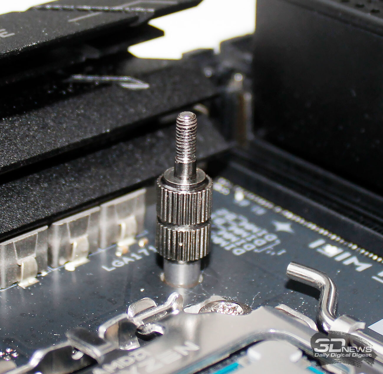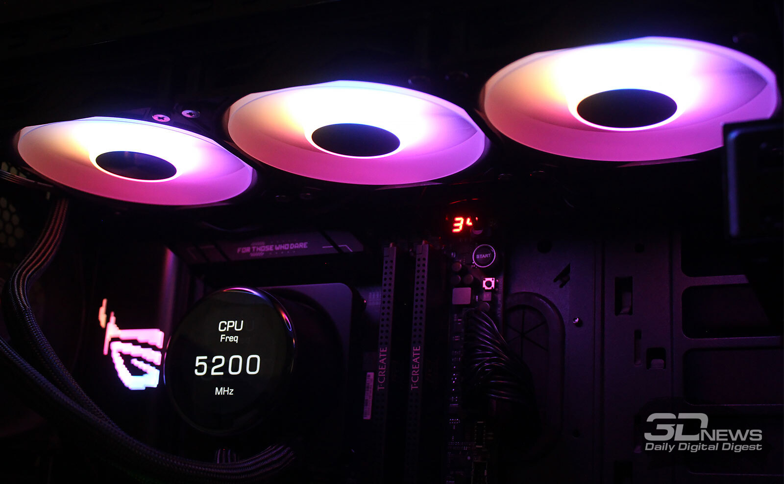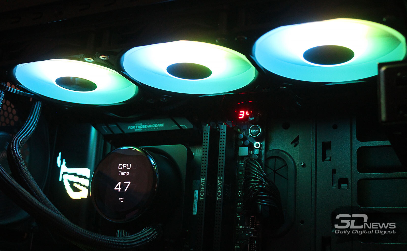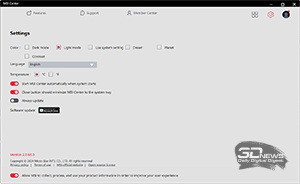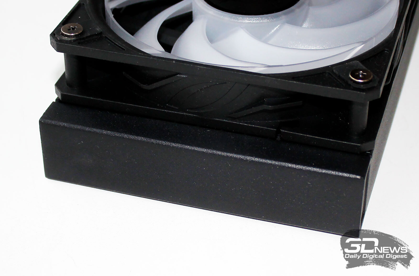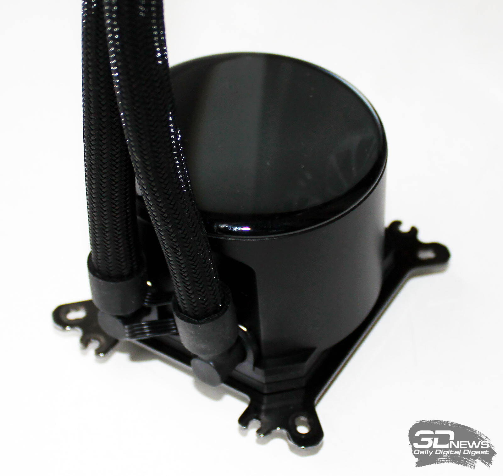⇡#Упаковка и комплектацияКартонная коробка, в которой поставляется MSI MPG CoreLiquid P13, выглядит очень ярко и стильно. На её лицевой стороне приведено крупное фото СЖО с работающими вентиляторами и помпой, а ниже указана серия и модель системы. На противоположной стороне коробки внимание концентрируется на экране помпы с «каруселью» из разных режимов его работы. Технические характеристики СЖО размещены на одном из торцов упаковки, где также можно найти перечень поддерживаемых процессорных сокетов и QR-коды на загрузку программного обеспечения. В цветную коробку вставлена корзина из пористого картона с отсеками под компоненты системы жидкостного охлаждения. Это достаточно надёжная упаковка, выдерживающая все перипетии российско-китайской доставки. Комплектующие СЖО находятся в отдельной коробочке, к которой прилагается гарантийная памятка. А вот бумажной инструкции по установке в комплекте MPG CoreLiquid P13 почему-то не нашлось. В коробочке находятся усилительная пластина для Intel, четыре набора винтов, втулок и шпилек, декоративная панель и термопаста. MSI MPG CoreLiquid P13 выпускается в Китае. Стоимость СЖО в России составляет 11600 рублей, гарантия – 3 года. ⇡#Особенности конструкцииСистема жидкостного охлаждения MSI MPG CoreLiquid P13 доступна в белом и чёрном оформлении. Как раз последний вариант мы сегодня и тестируем. Система построена по классической схеме, когда 360-мм радиатор соединён двумя гибкими шлангами трубками с блоком помпы и водоблока. Внешне модель MPG CoreLiquid P13 почти не отличается от ранее протестированной нами MAG CoreLiquid A13 360, разве что дизайн водоблока здесь другой. Общая масса системы без учёта креплений, монтируемых на материнскую плату, составляет 1712 граммов, – плюс-минус обычное значение для СЖО 360-мм форм-фактора. Радиатор выполнен из алюминия, его размеры равны 394 × 120 × 27 мм. При этом размеры так называемого «рабочего тела» радиатора (плоские каналы и перфорированная лента между ними) составляют 359 × 117 × 20,5 мм. Всего в радиаторе двенадцать каналов, по которым прокачивается теплоноситель, а плотность радиатора равна стандартным для СЖО этого класса 20-21 FPI. Торцы радиатора ничем примечательным не выделяются: из основного выходят два статичных фитинга с опрессованными на них шлангами, а на противоположном вообще ничего нет (да и не должно быть). Радиатор с помпой соединены парой шлангов из синтетического каучука (EPDM) в нейлоновой оплётке. Их длина равна 370 мм. Соединительных хомутов на шлангах нет. Как вы уже наверняка для себя отметили, радиатор и шланги в MPG CoreLiquid P13 абсолютно стандартны и ничем не отличаются как от других моделей СЖО компании MSI, так и от систем жидкостного охлаждения иных производителей. А вот помпа и вентиляторы отличаются. Итак, помпа. Её размеры равны 85 × 80 × 73 мм, а дизайн можно назвать минималистичным: эдакий короткий бочонок с чёрной глянцевой крышкой, в которую встроен 2,1-дюймовый IPS LCD-дисплей. Сразу обращает на себя внимание отсутствие каких-либо кабелей у помпы, но подробнее мы об этом расскажем чуть позже. Скорость вращения ротора заявлена на отметке 3400 об/мин, что было подтверждено данными мониторинга. Интересно, что при такой довольно высокой скорости ротора энергопотребление насоса составило 2,5 ватта и соответствует указанному в её характеристиках. Уровень шума не должен превышать 20 дБА – это очень низкое 