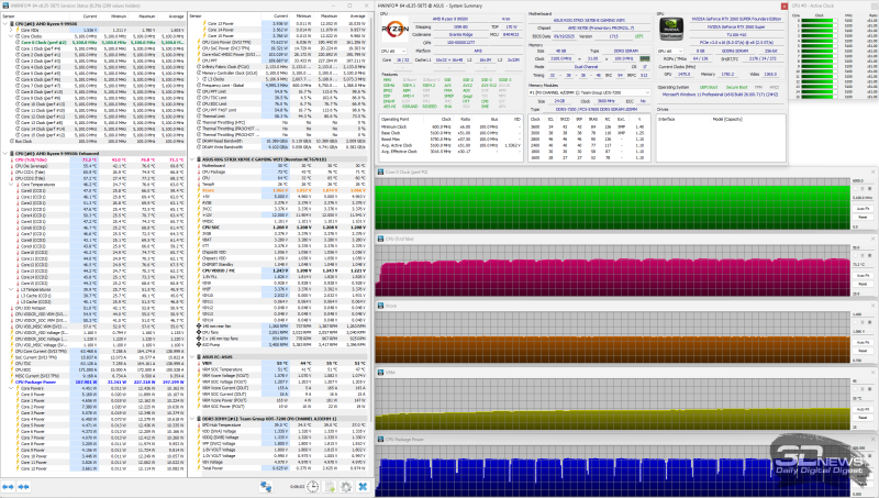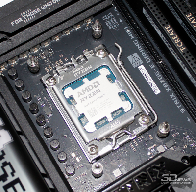 Для получения стабильных и объективно сопоставимых друг с другом результатов основные параметры процессора были зафиксированы в следующих значениях: частота BCLK – 100 МГц, множитель ядер – 51, частота – 5,1 ГГц, напряжение Vcore – 1,07-1,075 В. В BIOS материнской платы Asus был выставлен восьмой (максимальный) уровень стабилизации напряжения на ядре процессора (CPU load-line calibration). По данным HWiNFO64, уровень тепловыделения процессора с такими настройками достигал 225 ватт. Эффективная частота оперативной памяти была зафиксирована на отметке 6,2 ГГц при напряжениях 1,320/1,320 В (VDD/VDDQ), а её основные тайминги фиксировались в значениях 32-38-38-48 CR1 с дополнительной подстройкой вторичных и третичных таймингов. Напряжение VSOC фиксировалось на отметке 1,210 В. Частота коммуникационной шины Infinity Fabric (FCLK) была установлена на 2,066 ГГц. Тестирование было проведено в операционной системе Microsoft Windows 11 Pro версии 24H2 (26100.7171). Программное обеспечение, использованное для теста: