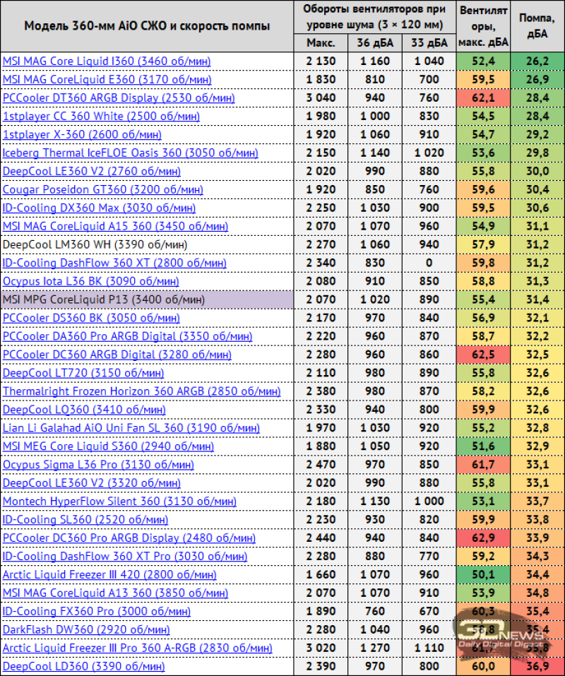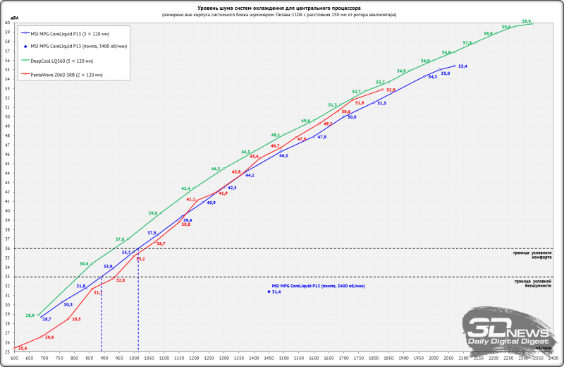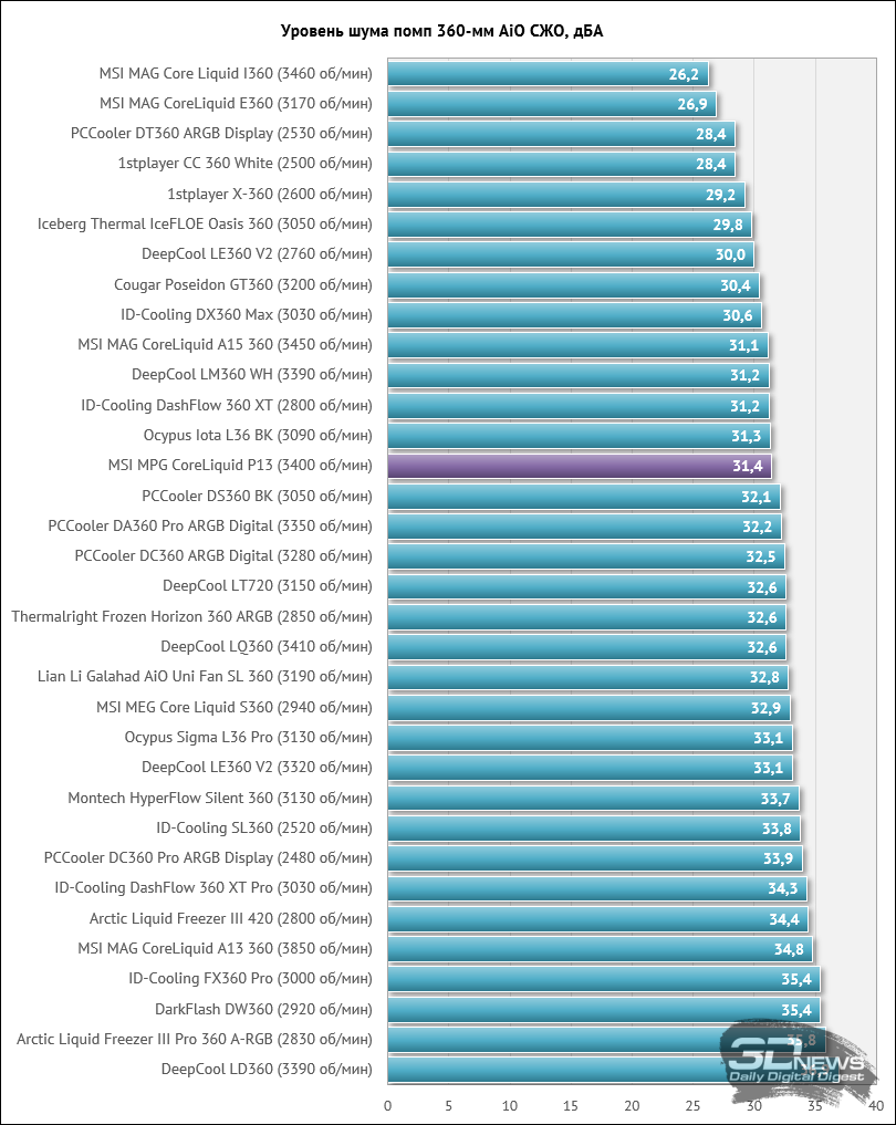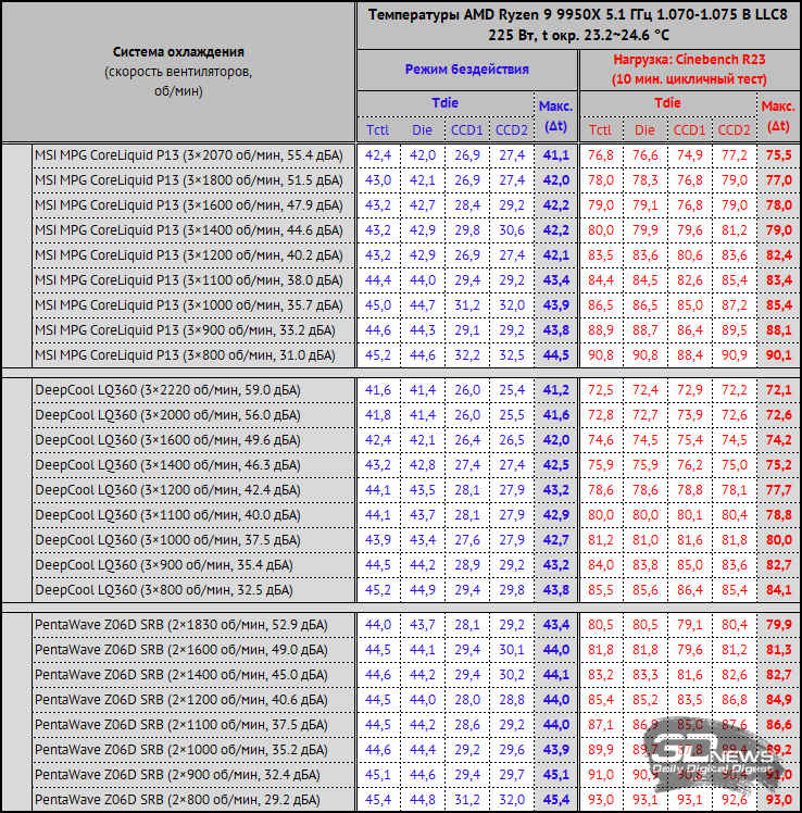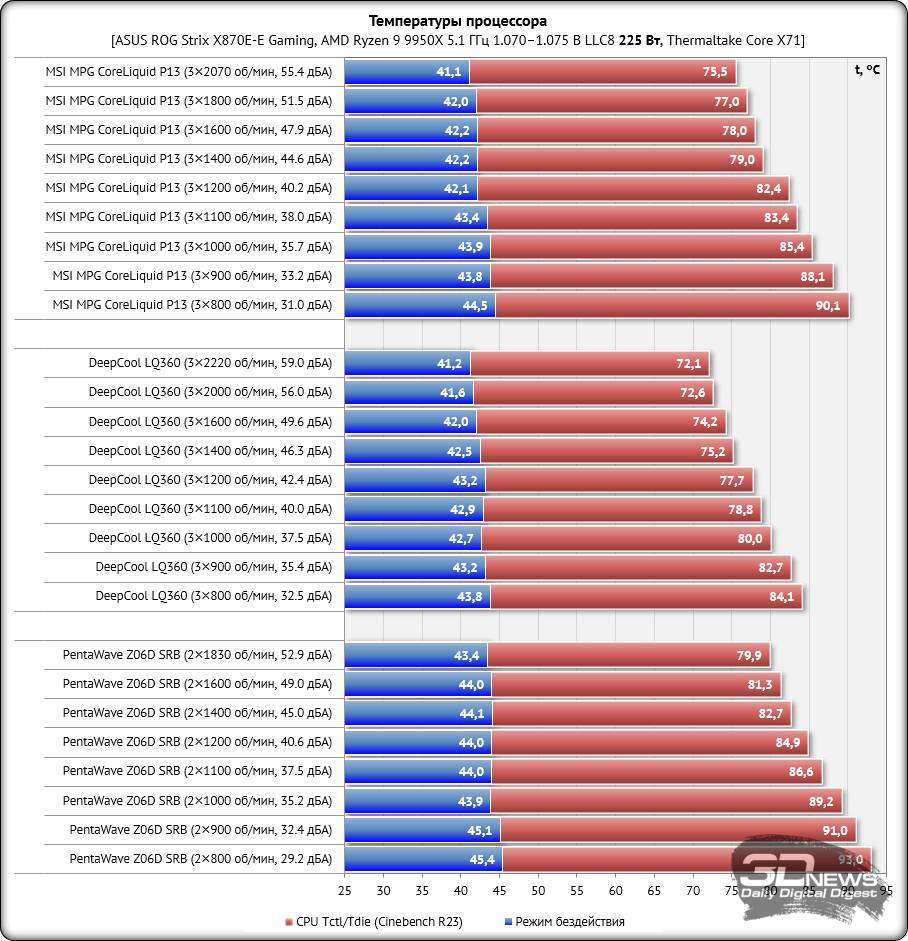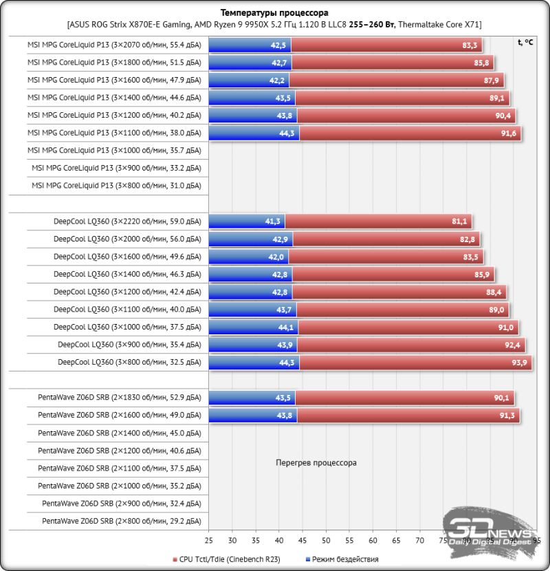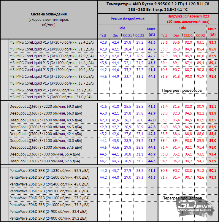 Снимок экрана мониторинга во время одного из циклов тестирования выглядит следующим образом. Нагрузка на процессор создавалась двумя последовательными циклами Cinebench R23. На стабилизацию температуры CPU между циклами отводилось по 10 минут. За окончательный результат, который вы увидите на диаграмме, принята максимальная температура по датчику Tdie в пике нагрузки и в режиме простоя с учётом корректировки на дельту температуры окружения. Кроме этого, в отдельной таблице будут приведены температуры каждого кластера ядер процессора (CCD1 и CCD2). Температура в помещении контролировалась установленным рядом с системным блоком электронным термометром с точностью измерений 0,1 °C и с возможностью почасового мониторинга изменения температуры в помещении за последние 6 часов. Во время данного тестирования температура колебалась в диапазоне 23,2–24,6 °C (дельта учитывалась в результатах). Измерение уровня шума систем охлаждения проводилось электронным шумомером «ОКТАВА-110А» в период от ноля до трёх часов ночи в полностью закрытой комнате площадью около 20 м2. Уровень шума измерялся вне корпуса системного блока, когда источником шума в помещении являлась только система охлаждения и её вентиляторы или только помпа. Шумомер, зафиксированный на штативе, всегда располагался строго в одной точке на расстоянии ровно 150 мм от ротора вентилятора. Системы охлаждения размещались на самом углу стола на подложке из вспененного полиэтилена. Нижняя граница измерений шумомера составляет 22 дБА, а субъективно-комфортный (просьба не путать с низким!) уровень шума систем охлаждения при измерениях с такого расстояния находится около отметки 36 дБА. За условно-низкий уровень шума мы принимаем значение 33 дБА. Соперником MSI MPG CoreLiquid P13 сегодня выступит система с 360-мм радиатором такого же типоразмера – DeepCool LQ360. Кроме этого, в тестирование включен воздушный суперкулер PentaWave Z06D SRB. Добавим, что скорость вращения крыльчаток вентиляторов тестируемых систем охлаждения регулировалась в диапазоне от 800 об/мин до их максимума с шагом 100 или 200 об/мин с помощью специального контроллера, точность которого составляет ±10 об/мин. ⇡#Эффективность охлажденияПо эффективности охлаждения ситуация для MSI MPG CoreLiquid P13 сложная. На максимальной скорости и вплоть до её снижения до 1400 об/мин новинка уступает DeepCool LQ360 от полутора до трёх с половиной градусов Цельсия, что в принципе немного для СЖО одного форм-фактора. Однако такие режимы работы вентиляторов СЖО малополезны для домашнего использования, поскольку уровень шума либо высокий, либо, как минимум, дискомфортный. А вот в скоростном диапазоне от 1200 до 800 об/мин отставание MSI MPG CoreLiquid P13 от конкурента составляет от 3,6 до 6 градусов Цельсия, и это уже приличная разница. Причина этому для нас очевидна – вентиляторы с закольцованной крыльчаткой неэффективны в этих скоростных режимах. Нет ни потока, ни давления, и вот результат. Примечательно, что на 800 об/мин MSI MPG CoreLiquid P13 выиграла у воздушного кулера менее трёх градусов Цельсия, хотя уровень шума у PentaWave Z06D SRB чуть ниже, чем у СЖО. Далее мы повышаем частоту AMD Ryzen 9 9950X до 5,2 ГГц с увеличением напряжения до 1,120 В при том же восьмом уровне LLC. После этого по данным HWiNFO64 тепловыделение процессора под стрессовой нагрузкой достигает 255-260 ватт, поэтому температуры заметно выросли, а воздушный кулер справ