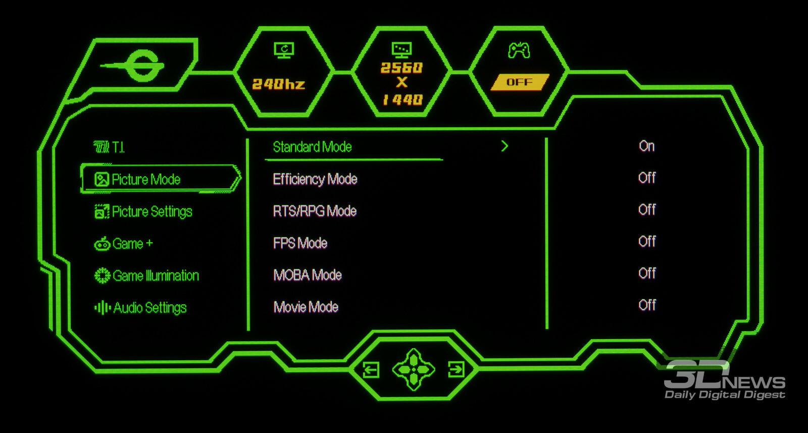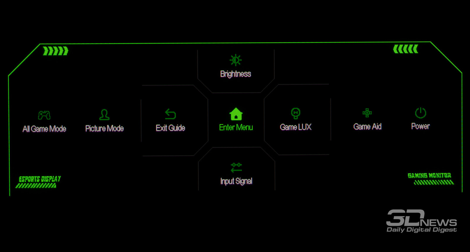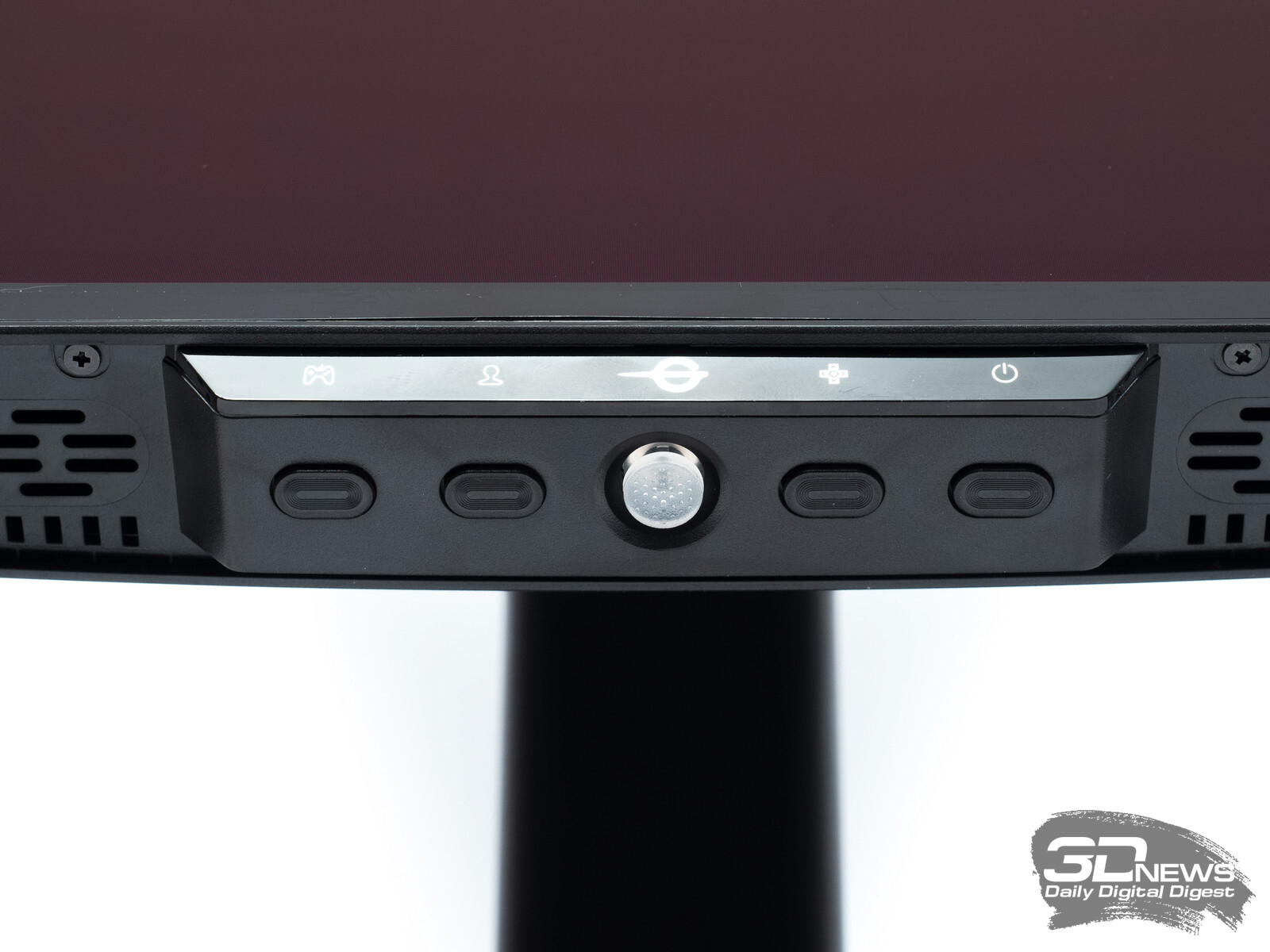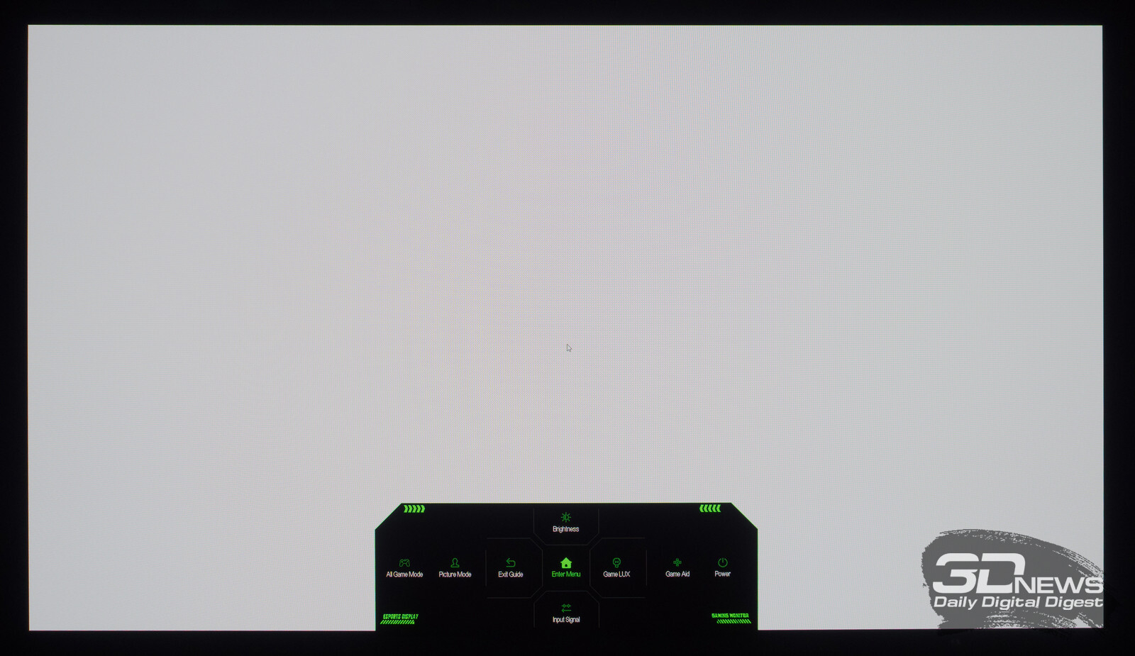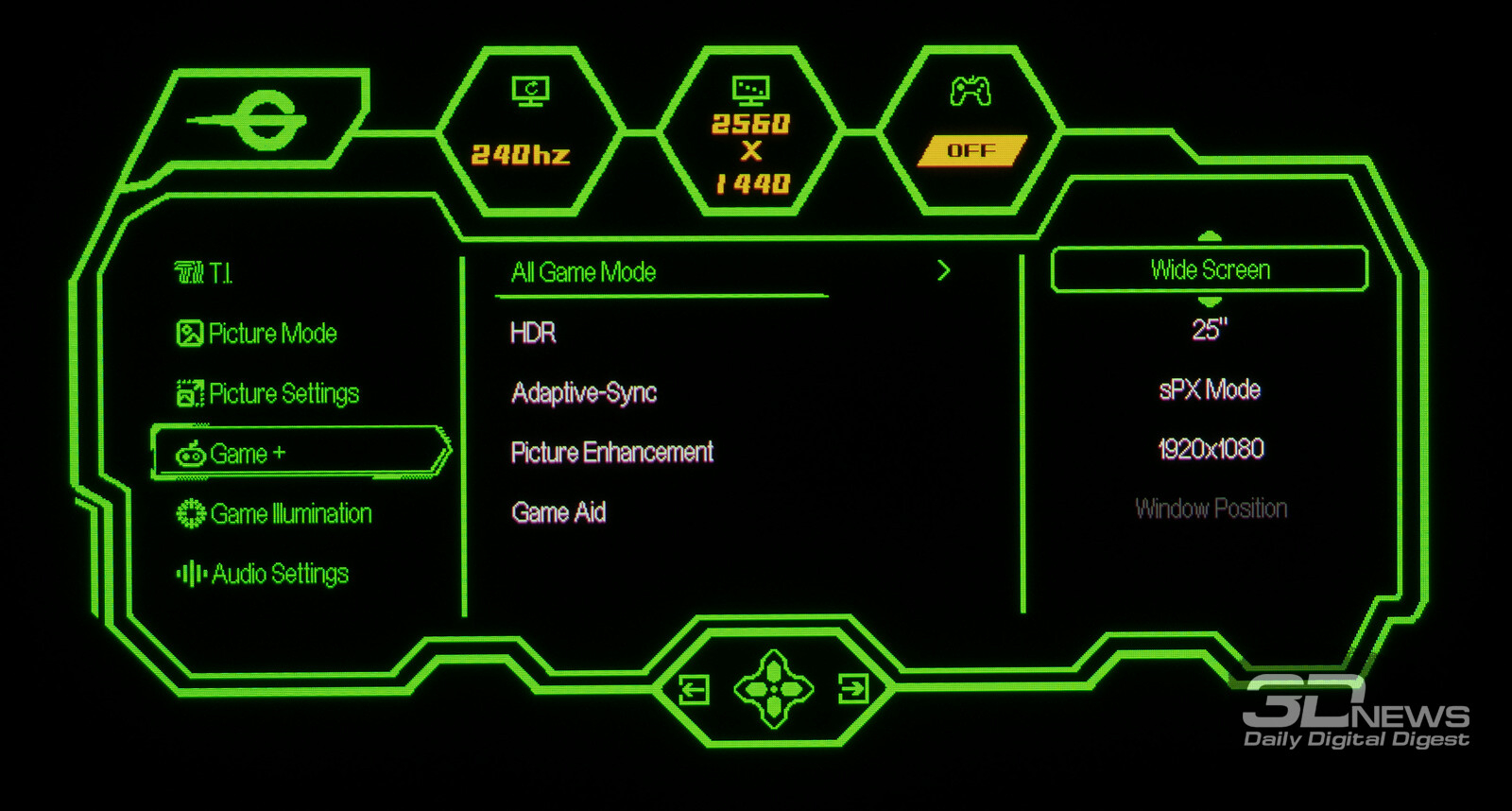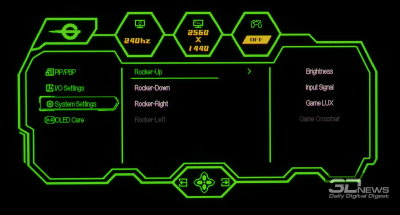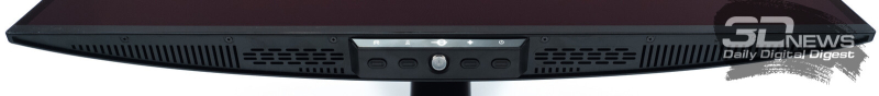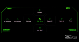 Управление монитором осуществляется с помощью удобного 5-позиционного джойстика и четырёх дополнительных клавиш. Дополнительно рядом с джойстиком предусмотрены по две кнопки с каждой стороны, отвечающие за вызов игровых функций с быстрым доступом, среди которых: All Game Mode (выбор режима работы скалера – режимы 25-дюймового экрана, Full HD и псевдо-4K), Game Aid (прицелы, таймеры, индикаторы, ночное видение.