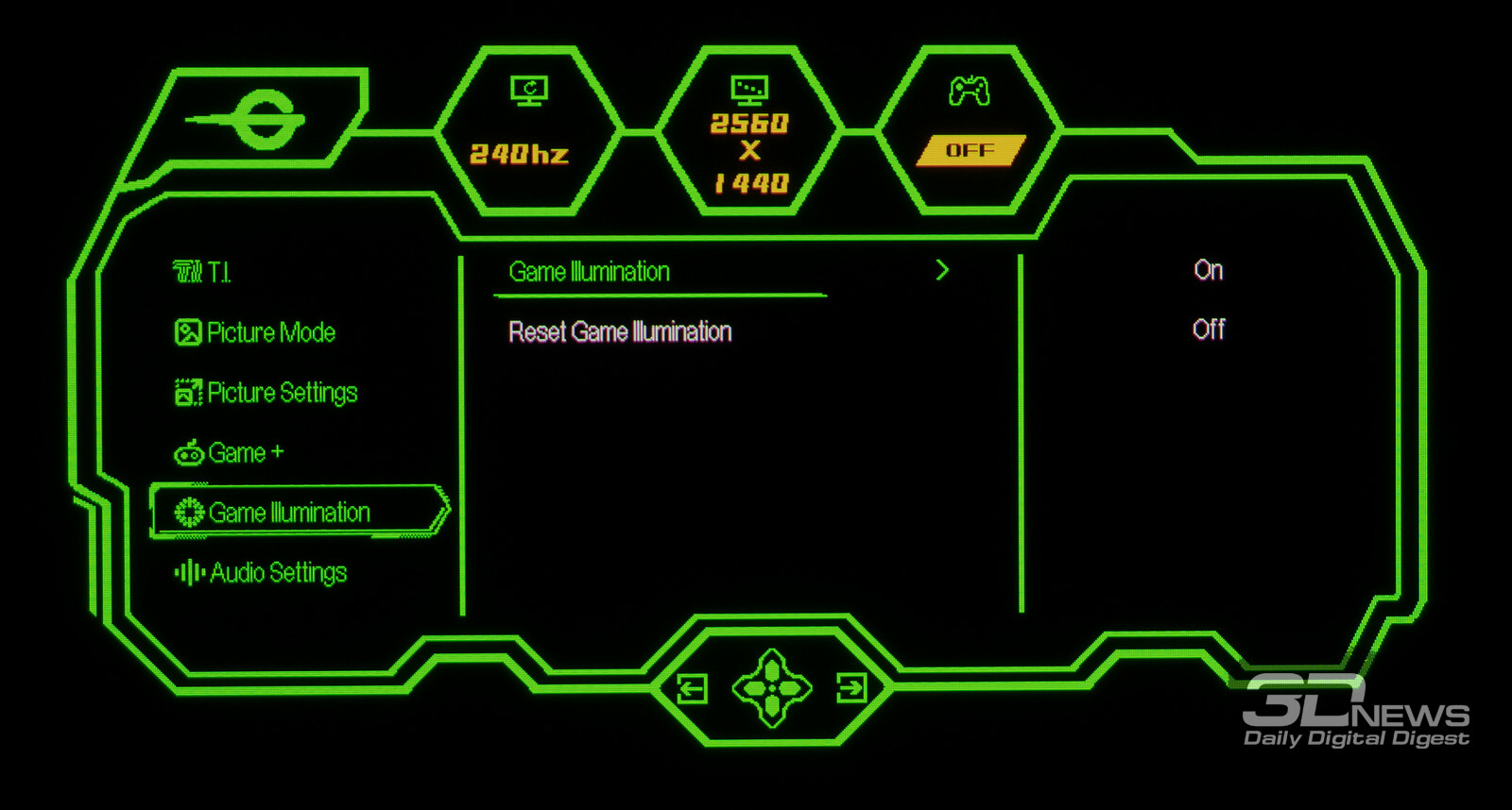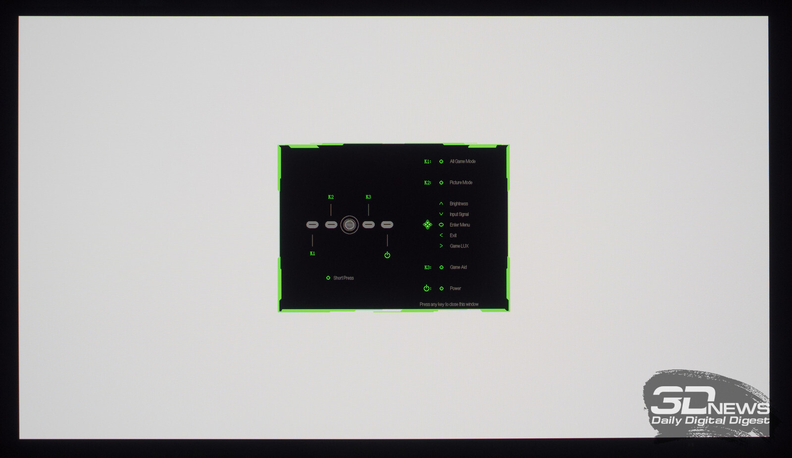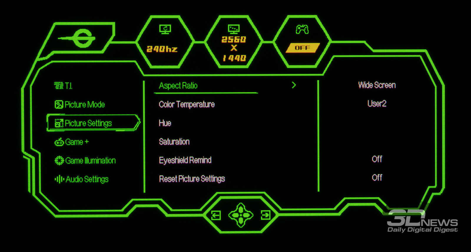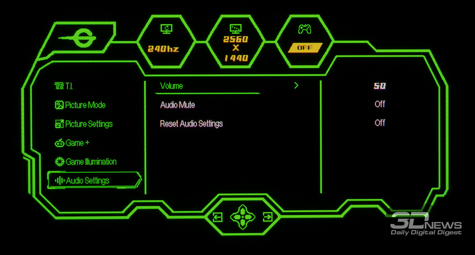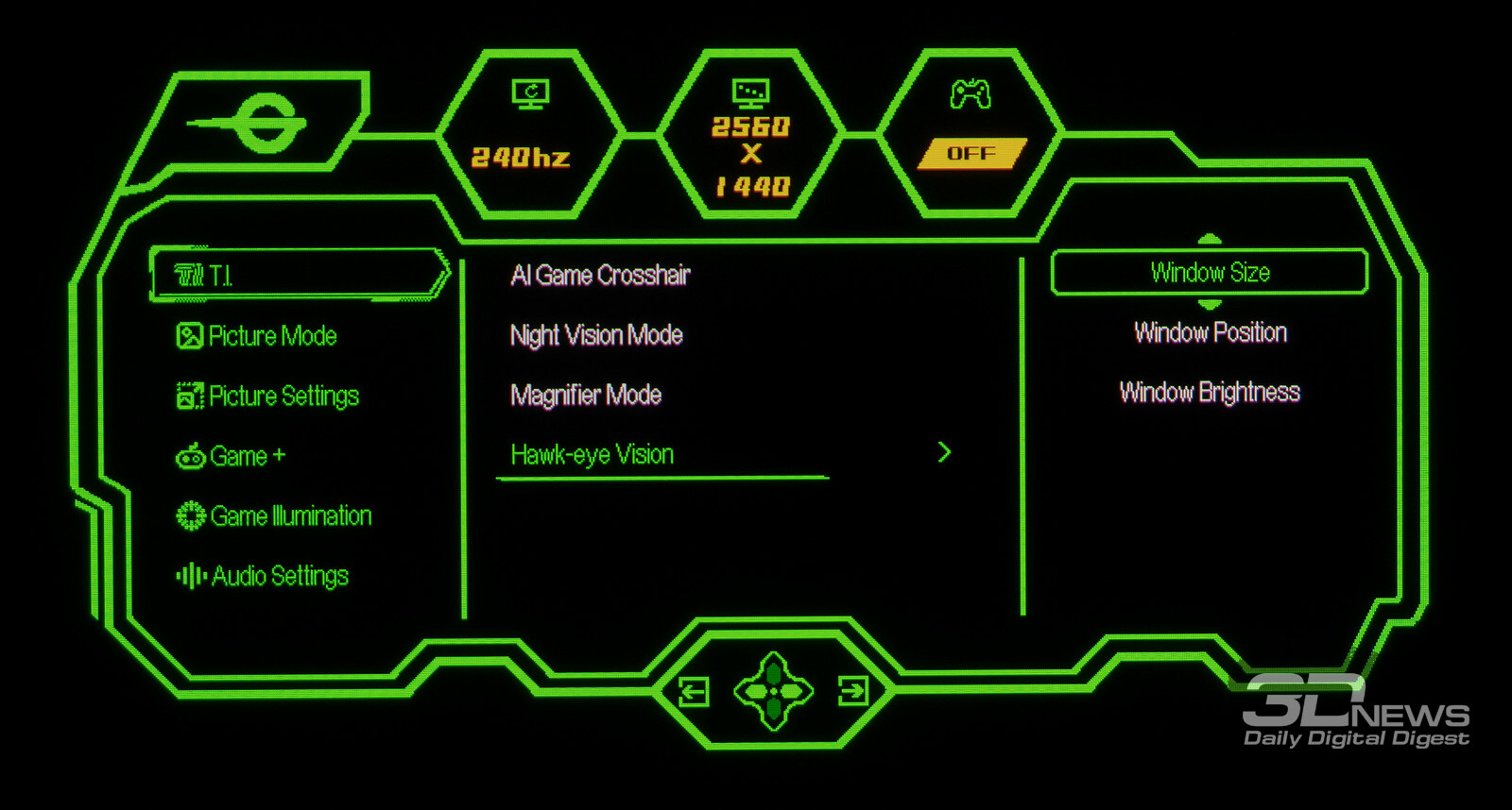 Управление монитором осуществляется с помощью удобного 5-позиционного джойстика и четырёх дополнительных клавиш. Дополнительно рядом с джойстиком предусмотрены по две кнопки с каждой стороны, отвечающие за вызов игровых функций с быстрым доступом, среди которых: All Game Mode (выбор режима работы скалера – режимы 25-дюймового экрана, Full HD и псевдо-4K), Game Aid (прицелы, таймеры, индикаторы, ночное видение.