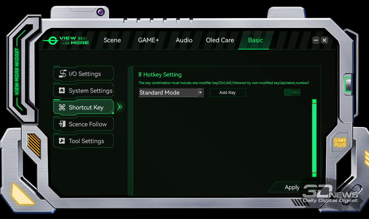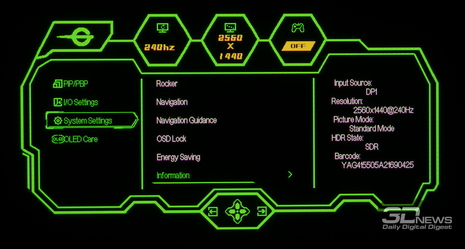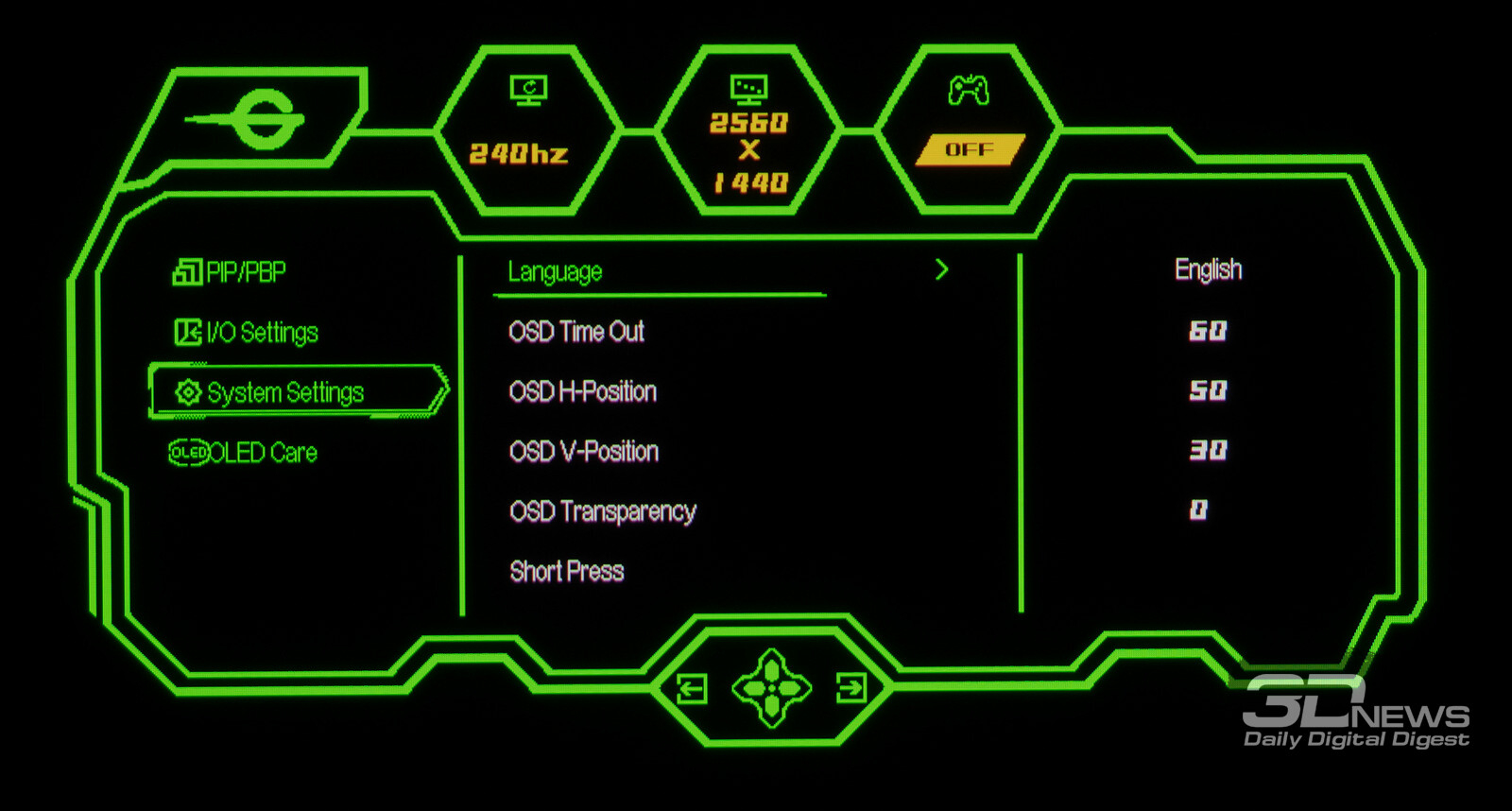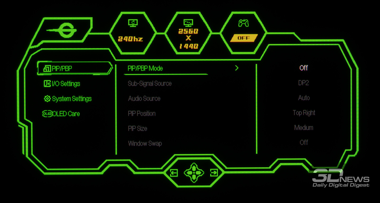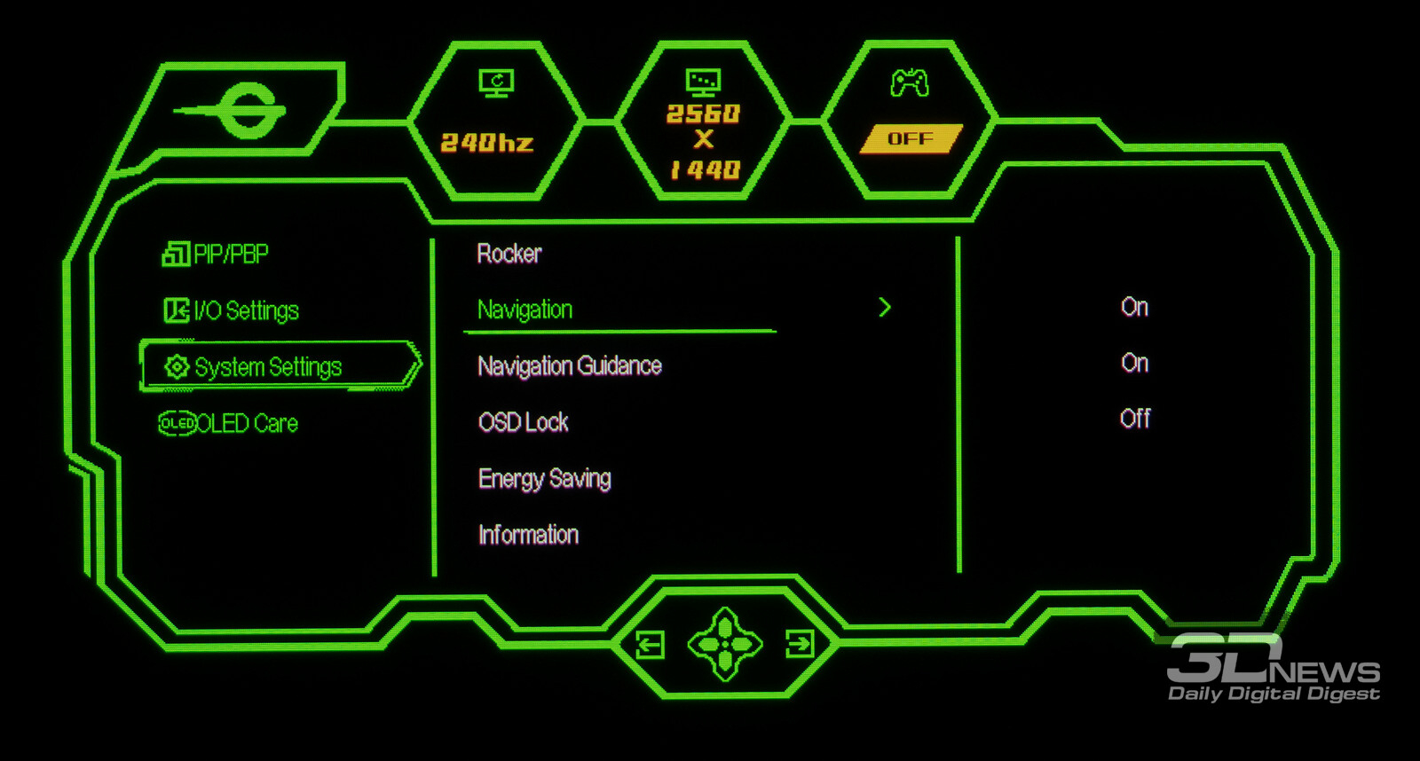 Управление монитором осуществляется с помощью удобного 5-позиционного джойстика и четырёх дополнительных клавиш. Дополнительно рядом с джойстиком предусмотрены по две кнопки с каждой стороны, отвечающие за вызов игровых функций с быстрым доступом, среди которых: All Game Mode (выбор режима работы скалера – режимы 25-дюймового экрана, Full HD и псевдо-4K), Game Aid (прицелы, таймеры, индикаторы, ночное видение.