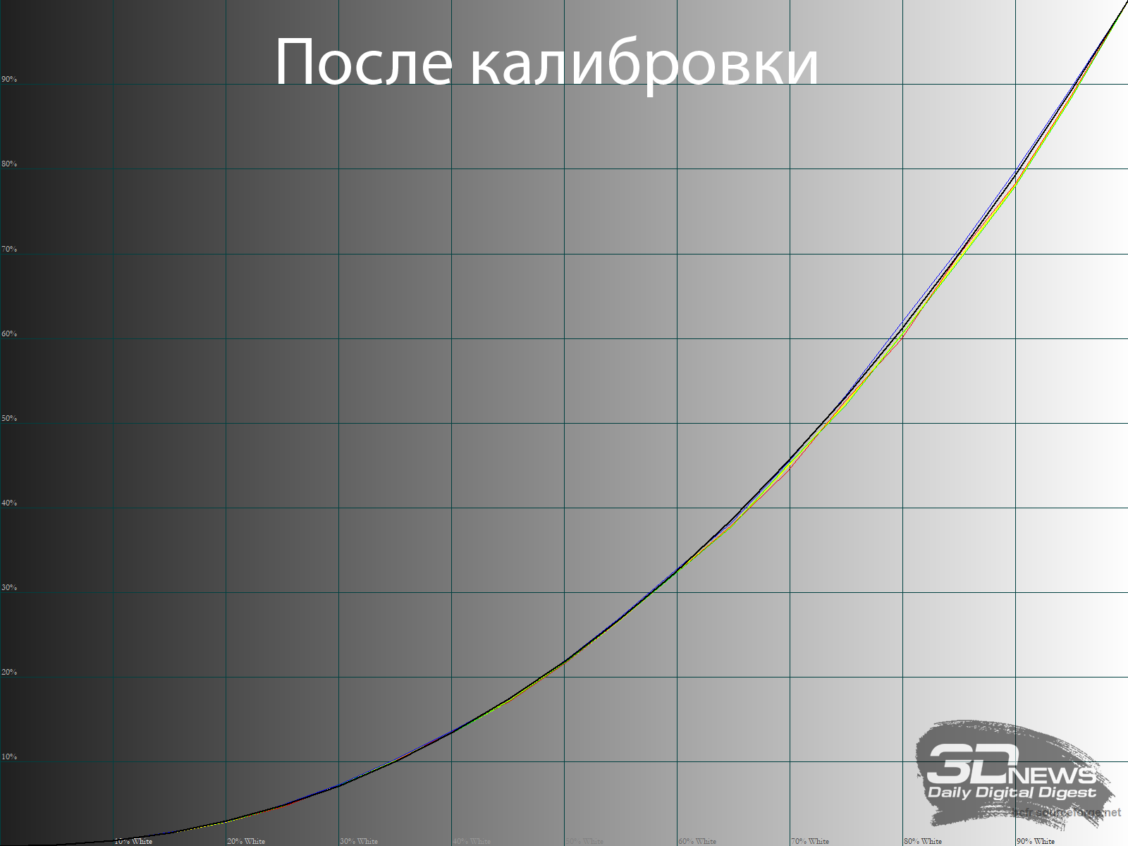 В ходе настройки монитора мы воспользовались созданным профилем с правками в LUT видеокарты. При его использовании качество тоновых переходов несколько падает, появляются области с паразитными оттенками и грубыми переходами. Всё обычно – ничего нового.