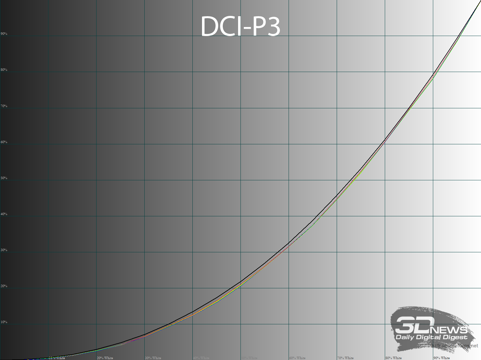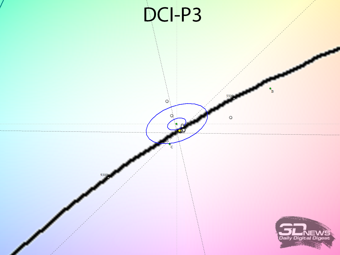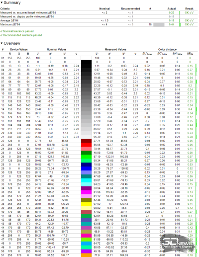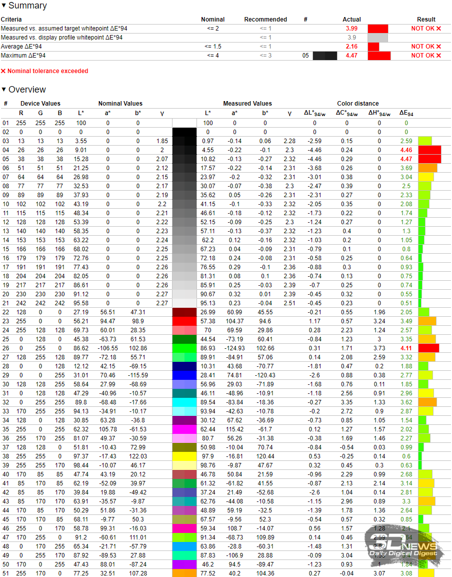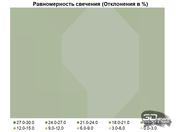 На белом поле проблемы равномерности отсутствуют: цифры устанавливаются на уровне отклонений 0,6 % в среднем и 2 % в максимуме – лучше результата у OLED мы не видели. Браво, Titan Army и спасибо Samsung Display!