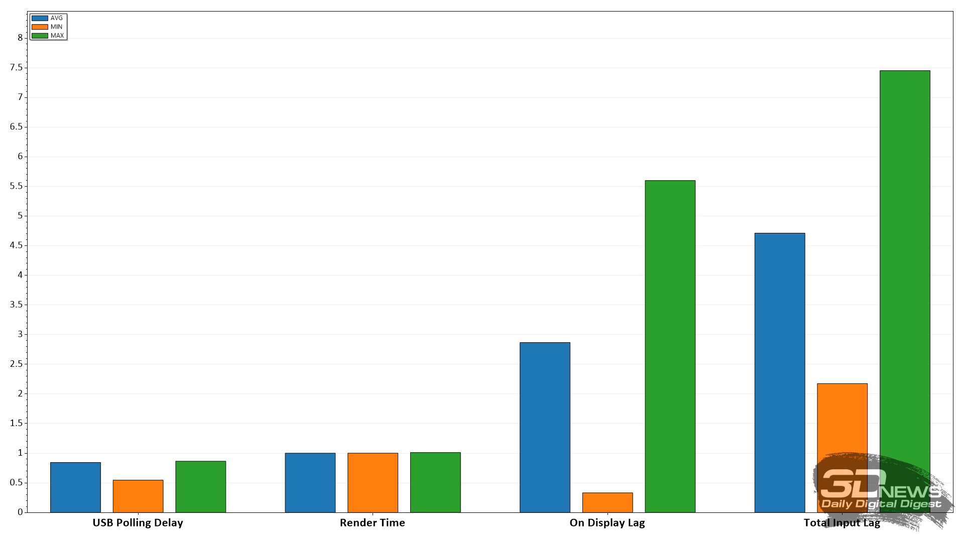 Что касается задержки вывода, то на частоте 240 Гц она составила всего 2,8 мс в среднем – прекрасный результат.