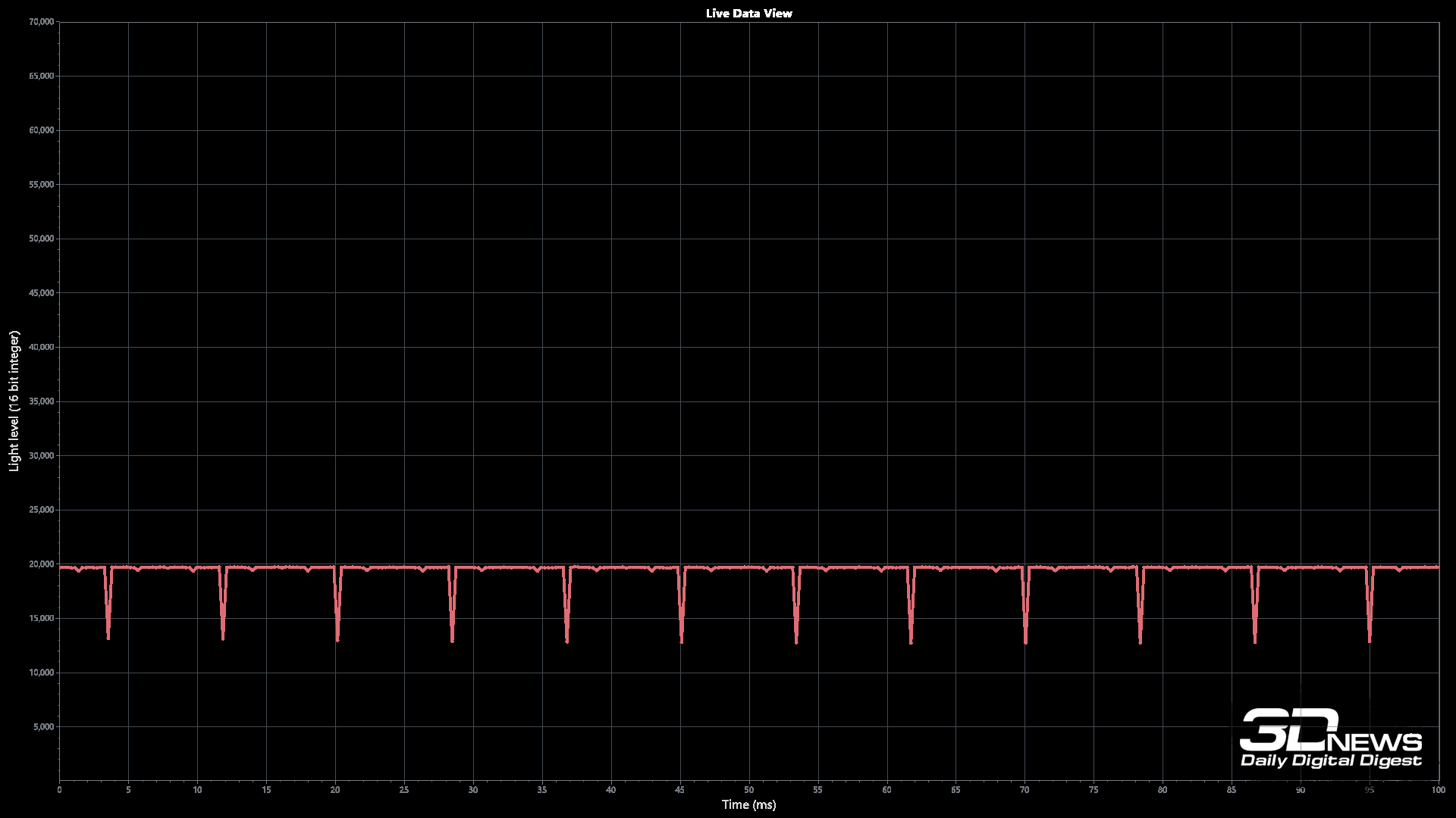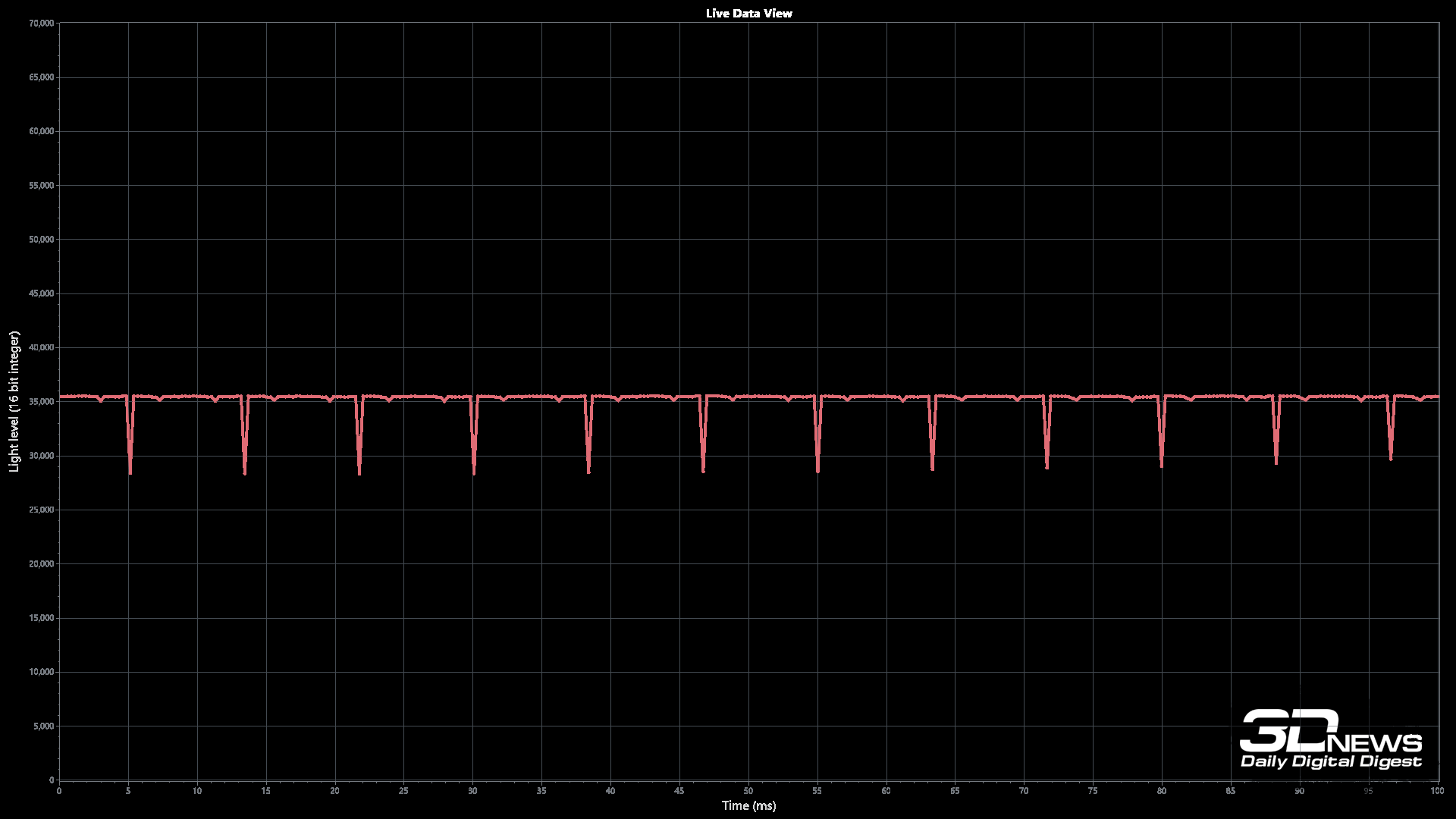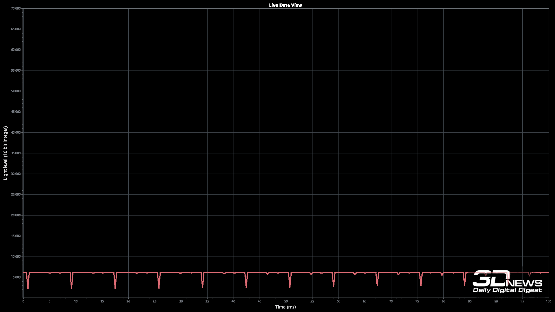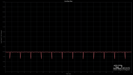 При высоком уровне яркости на статичном проверочном изображении пульсации (а не ШИМ в привычном понимании) действительно можно скрыть. При снижении же уровня яркости до 0-50 % сделать это становится гораздо сложнее. На трёх графиках чётко видны пульсации. Но это не полноценная ШИ-модуляция, а общий уровень пульсаций находится в норме.