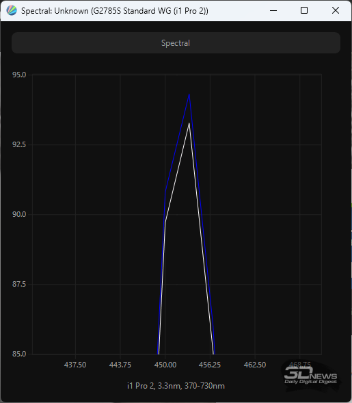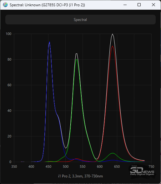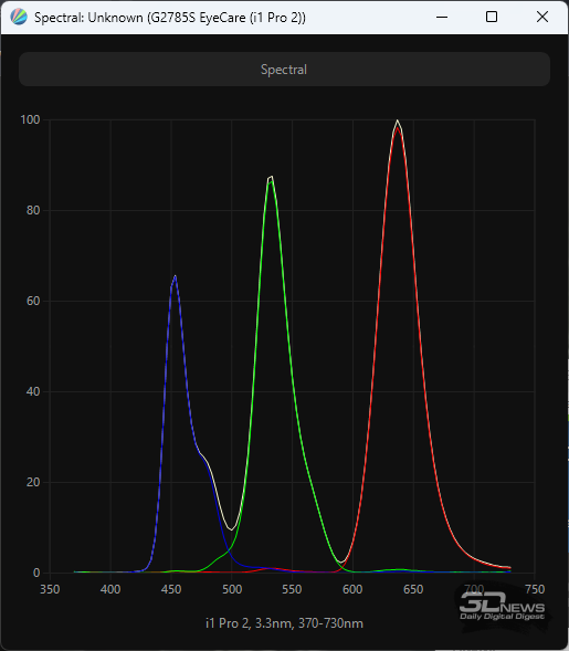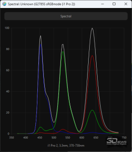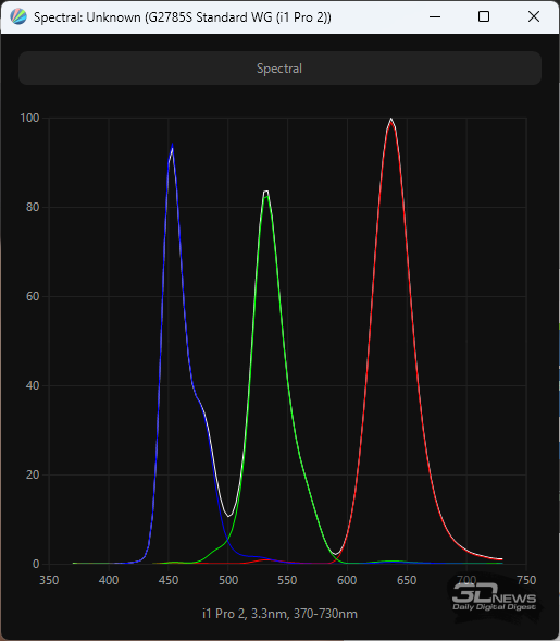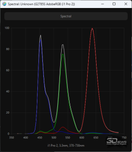 QD-OLED-матрица компании Samsung Display в мониторе Titan Army разработана в соответствии с современными стандартами безопасности: синий пик в спектре подсветки смещён в безопасную область на 453,5-456 нм. Применение технологии «квантовых точек» позволило значительно расширить цветовой охват. Официально заявлено покрытие на 99 % sRGB и DCI-P3 и 98 % полиграфического AdobeRGB. При этом мы можем с уверенностью сказать, что монитор также обеспечивает достойные результаты по стандарту Rec.2020.
