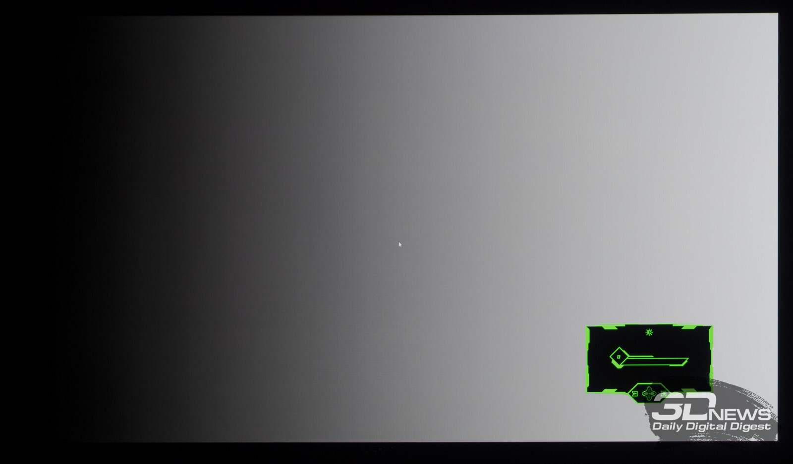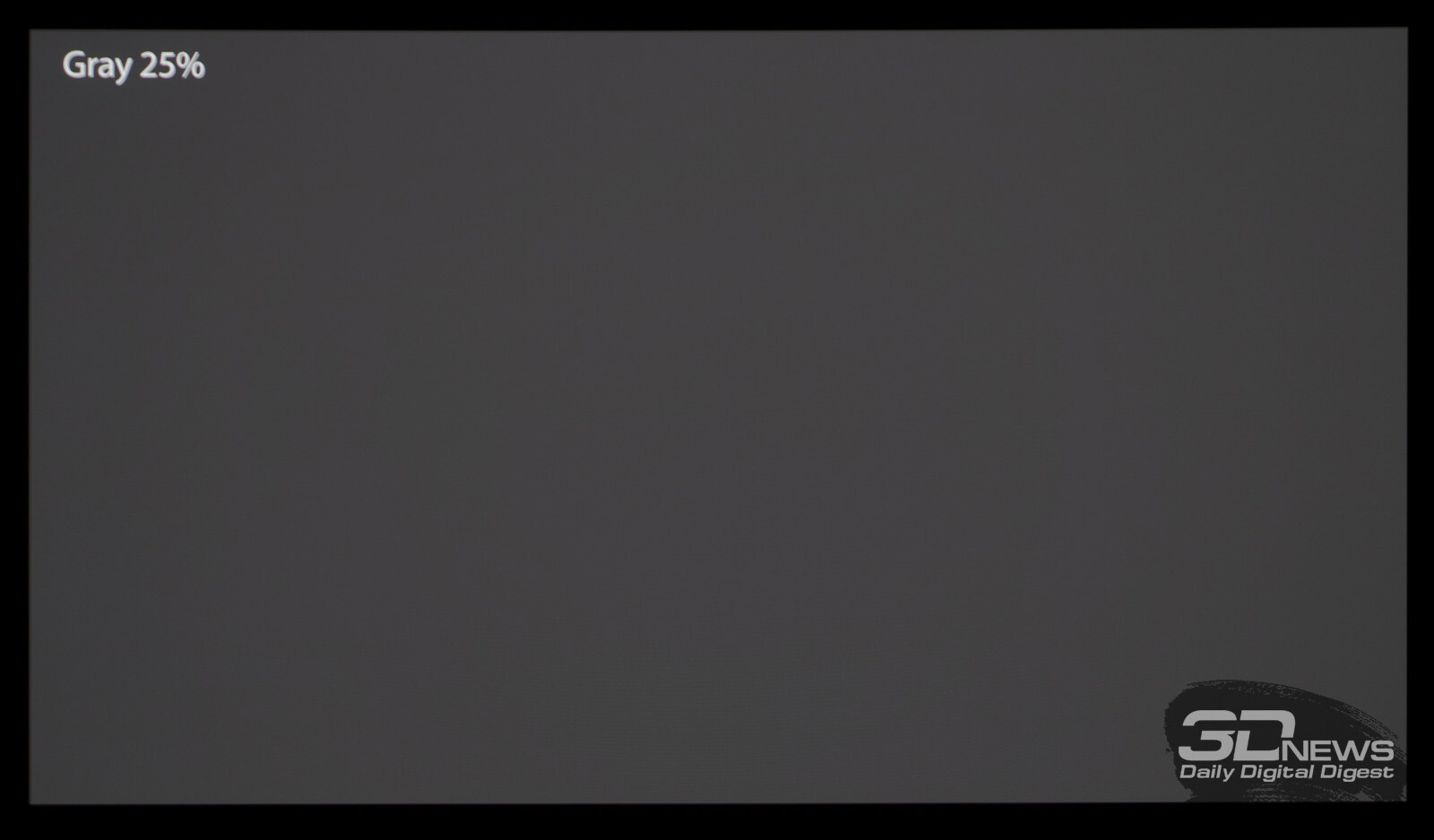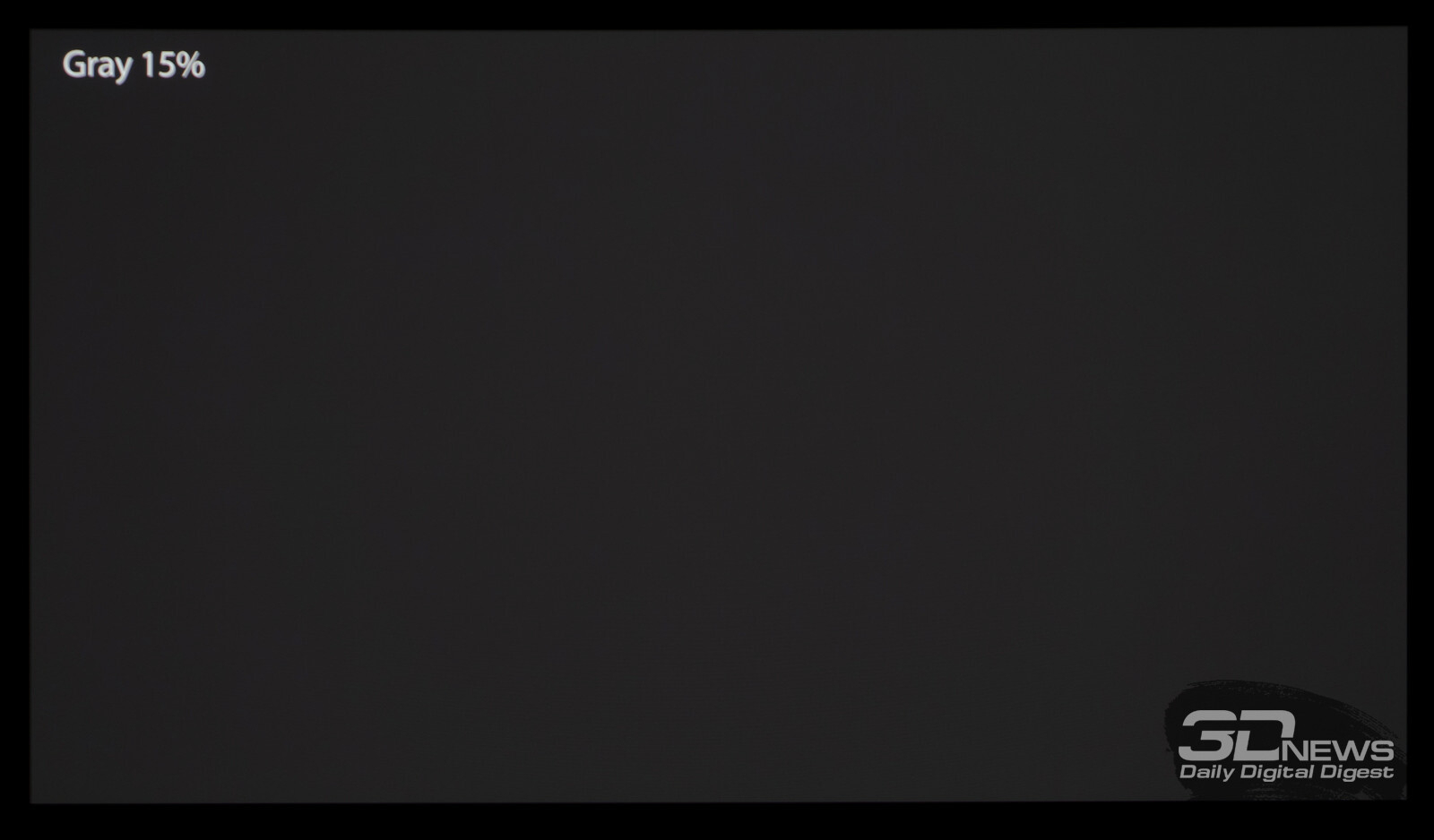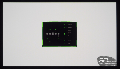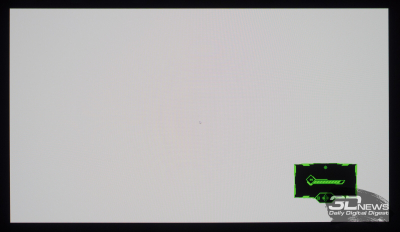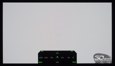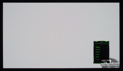 Что касается вывода чёрного поля, то у любого OLED с этим нет никаких проблем. При выводе на экран чёрной заливки все пиксели выключаются — и мы остаёмся свидетелями присутствия белого текста в верхнем левом углу и работающего индикатора питания. Никакого Glow-эффекта и проблем с «подсветкой», как у LCD.