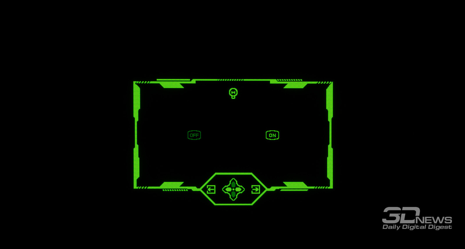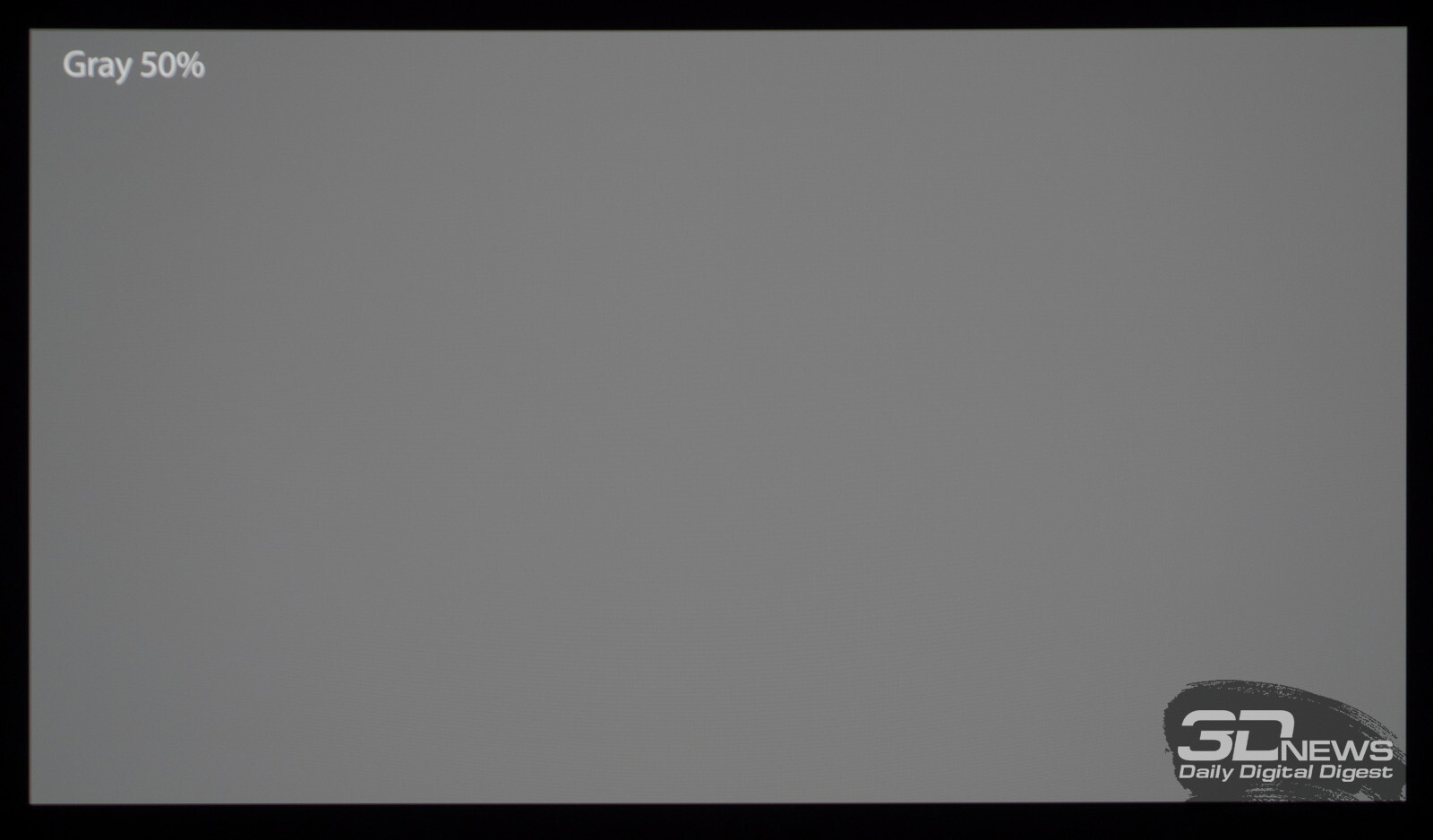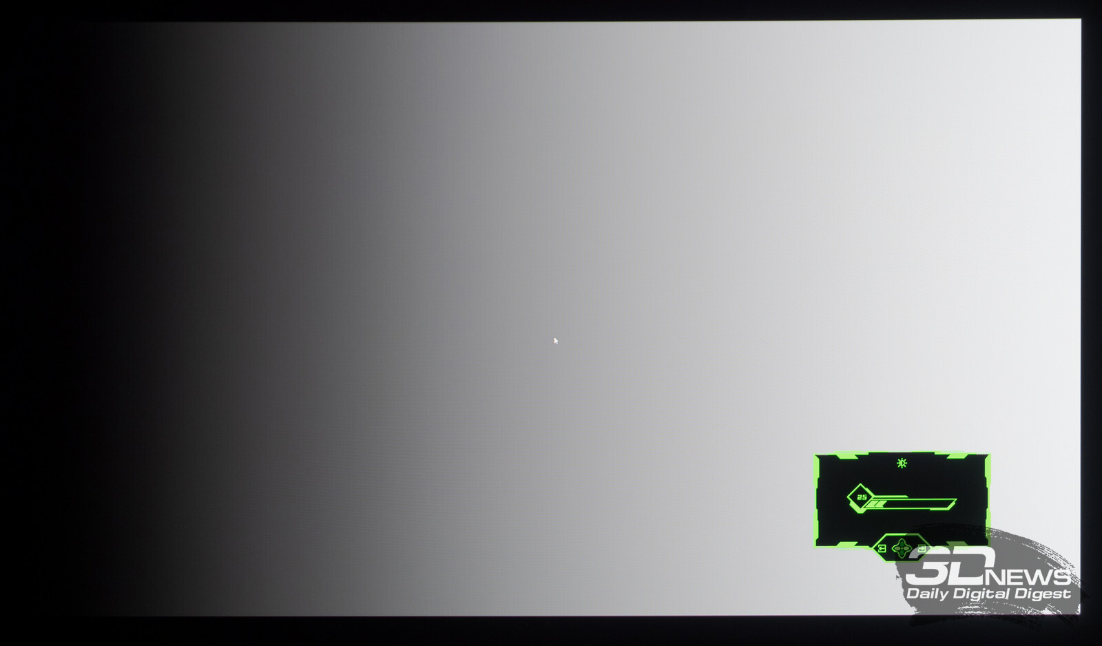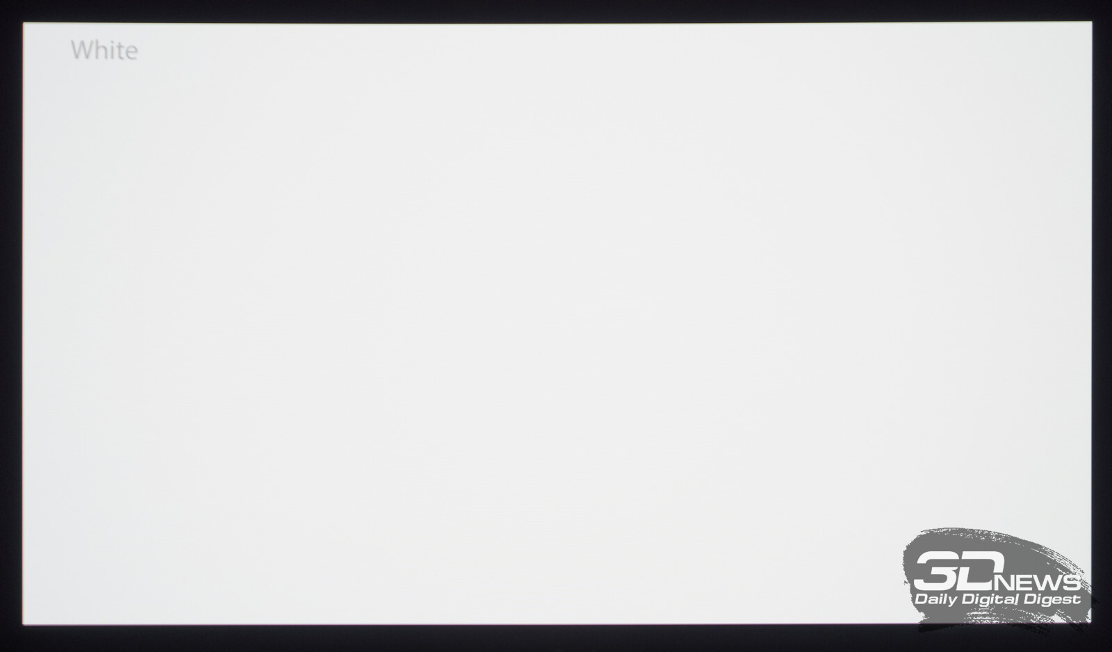 Что касается вывода чёрного поля, то у любого OLED с этим нет никаких проблем. При выводе на экран чёрной заливки все пиксели выключаются — и мы остаёмся свидетелями присутствия белого текста в верхнем левом углу и работающего индикатора питания. Никакого Glow-эффекта и проблем с «подсветкой», как у LCD.