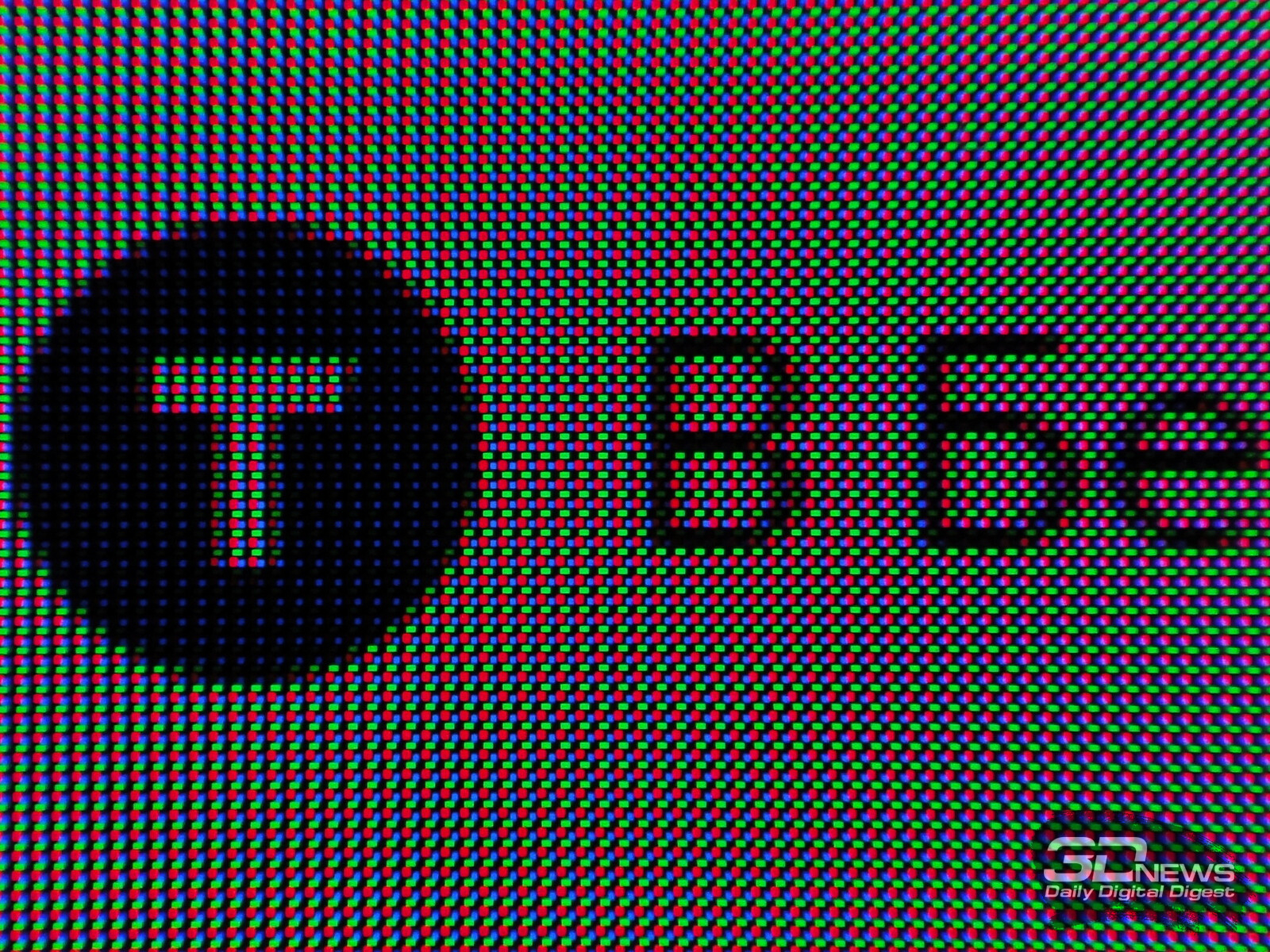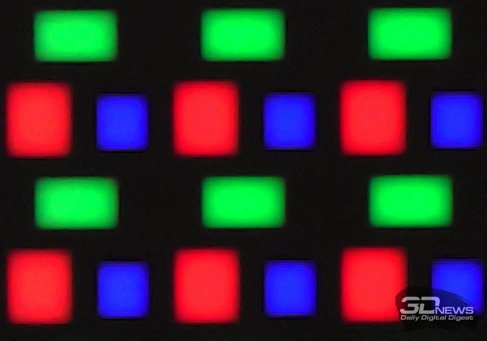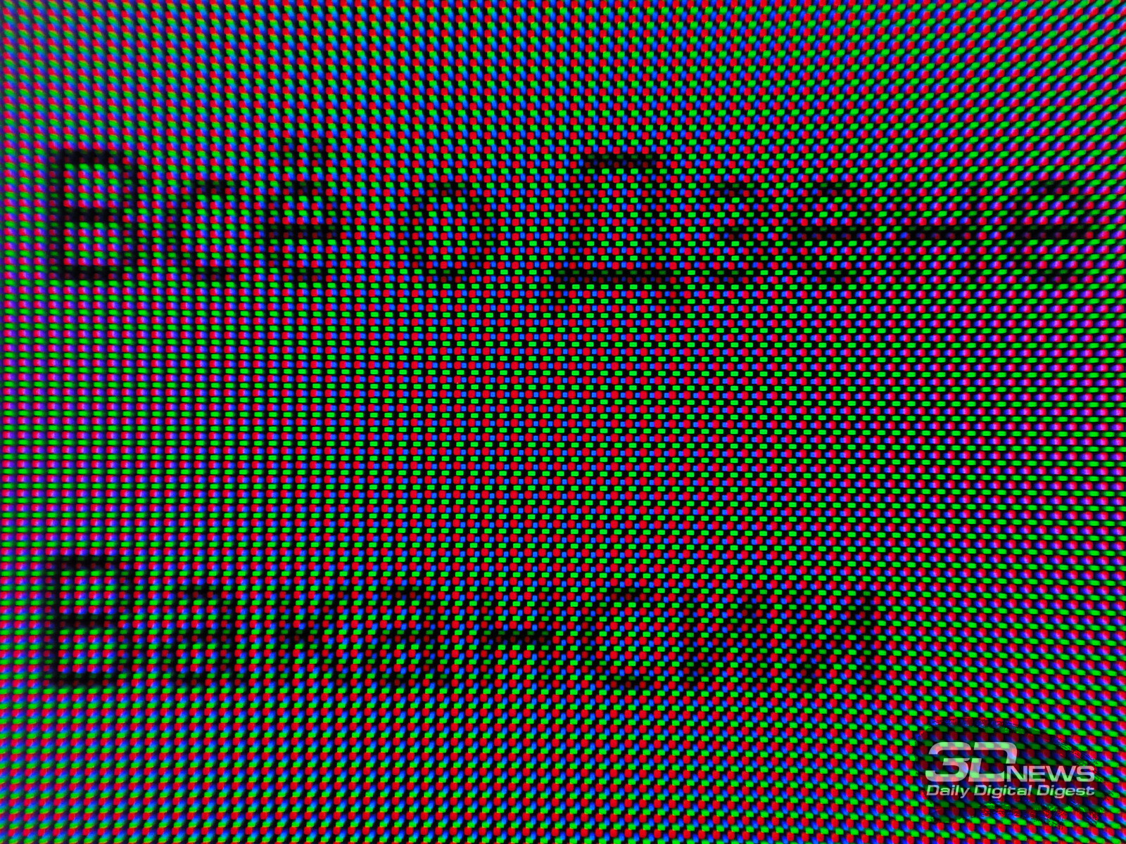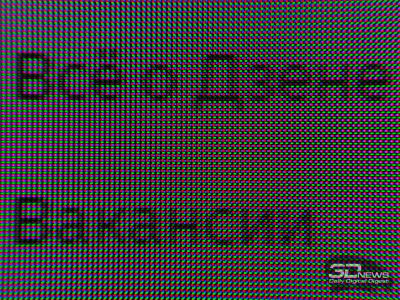 Как и у всех прямых конкурентов и QD-OLED второго и третьего поколений, в первую очередь видна следующая структура пикселей: три субпикселя собраны в треугольник, но в отличие от QD-OLED первого поколения они представлены в виде прямоугольников и квадратов и занимают большее пространство подложки матрицы.