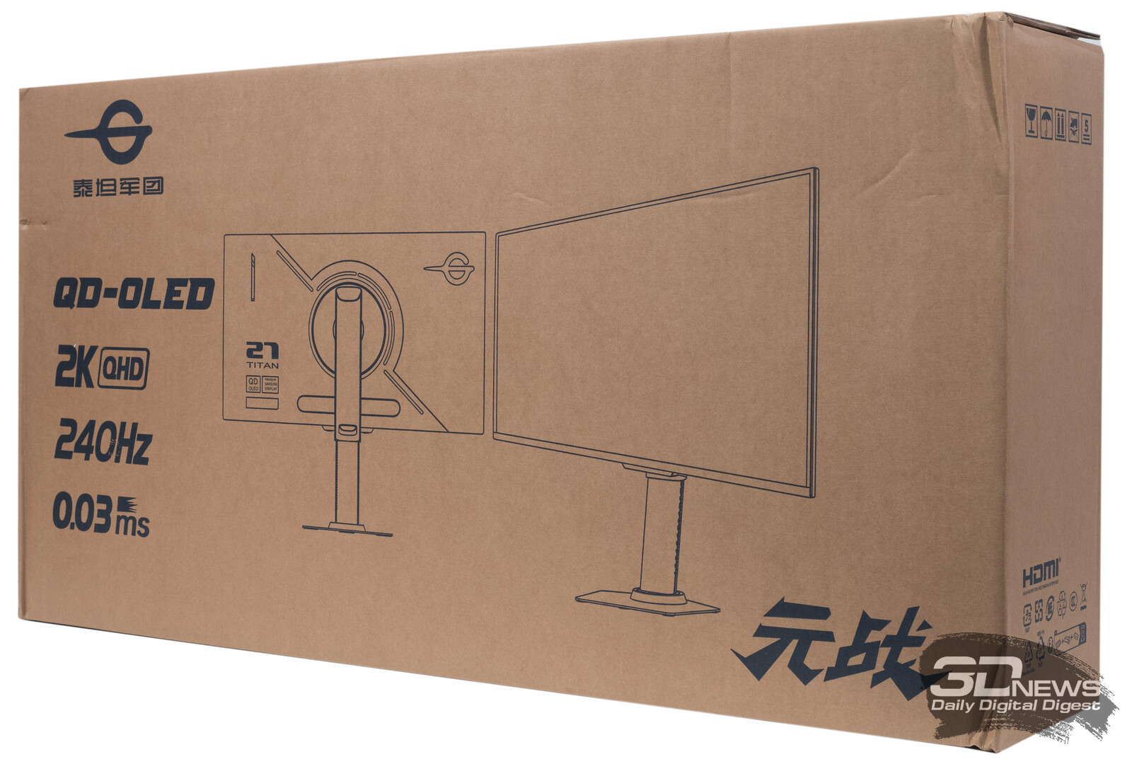 Titan Army G2785S поставляется в крупной и достаточно лёгкий по наполнению коробке из некрашеного картона с простым визуальным оформлением. При доставке из Китая упаковка дополнительно защищена внешней коробкой со всеми необходимыми наклейками, требующими от перевозчика осторожной перевозки груза.