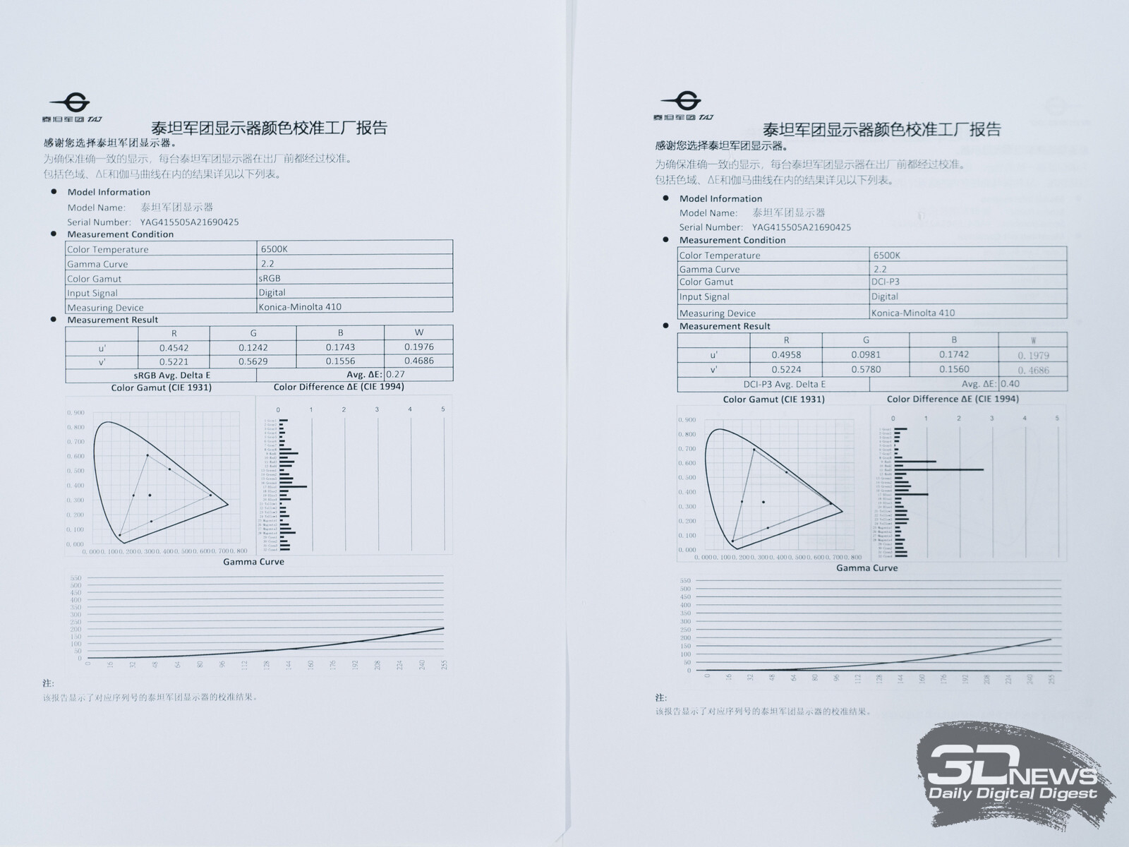 - бумажные отчёты о заводской калибровке режимов эмуляции sRGB и DCI-P3;