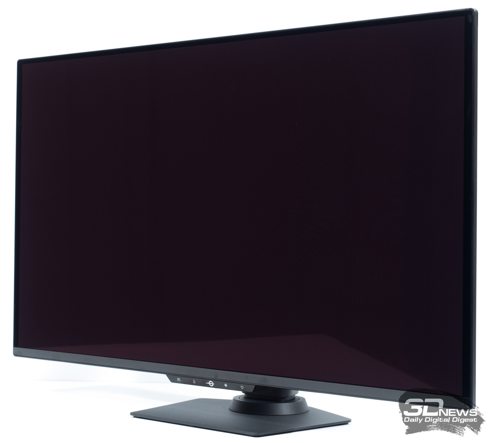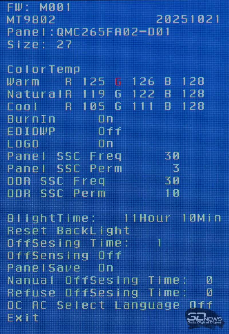 За последние 3 года у нас накопился большой опыт работы с OLED-мониторами и телевизорами разных производителей. Благодаря этому мы знаем, что в современных QD-OLED-решениях всех четырёх поколений поляризационный слой не применяется. Поверхность экрана — полуглянцевая, с характерным фиолетово-розовым оттенком на свету. Панель способна работать в 10-битном режиме и соответственно отображает до 1,07 миллиарда цветов