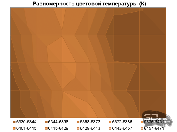 Нет у монитора Titan Army и проблем с равномерностью цветовой температуры по всему полю экрана. Среднее отклонение от центральной точки оказалось на уровне 0,6 %, а максимальное всего 1,3 %. Различия цветовой температуры по полю экрана не превышают 110 К. Тут без слов… одни положительные эмоции.