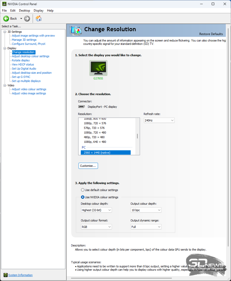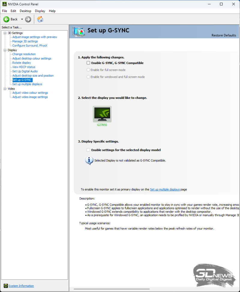Новый монитор G2785S полноценно поддерживает стандарт VESA Adaptive-Sync, а также соответствует требованиям AMD FreeSync Premium и, конечно, с легкостью переваривает NVIDIA G-Sync в режиме Compatible (оба без официального сертификата). Рабочий диапазон составляет 48-240 Гц, но при включении технологии LFC (Low Framerate Compensation) он может быть расширен по нижней границе.