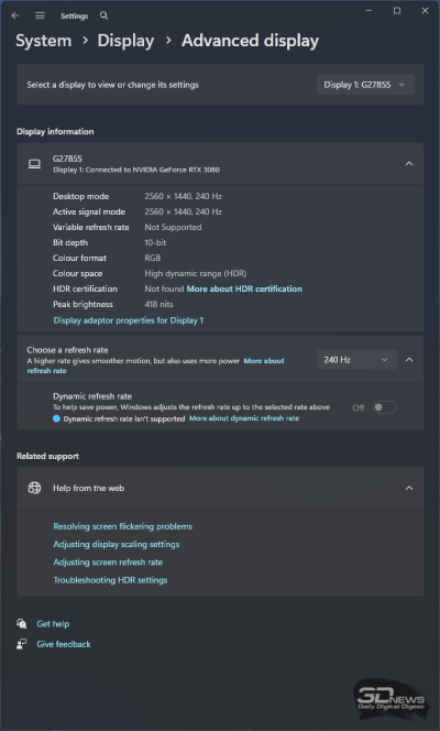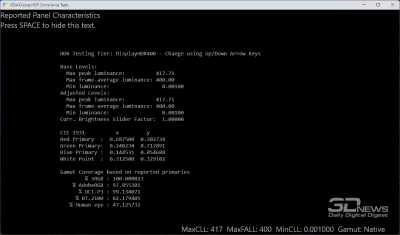 Новинка лишь частично соответствует стандарту VESA DisplayHDR 400 True Black и полноценно поддерживает воспроизведение HDR10-контента. Как и другие устройства с аналогичной матрицей, она должна достигать пиковых значений яркости не ниже 400 нит на небольших участках экрана (при заполнении 1-10 % APL), а вот при полном заполнении нам обещают на выше 200 нит – для затемнённых помещений, даже учитывая глянцевое покрытие матрицы – вполне достаточно.