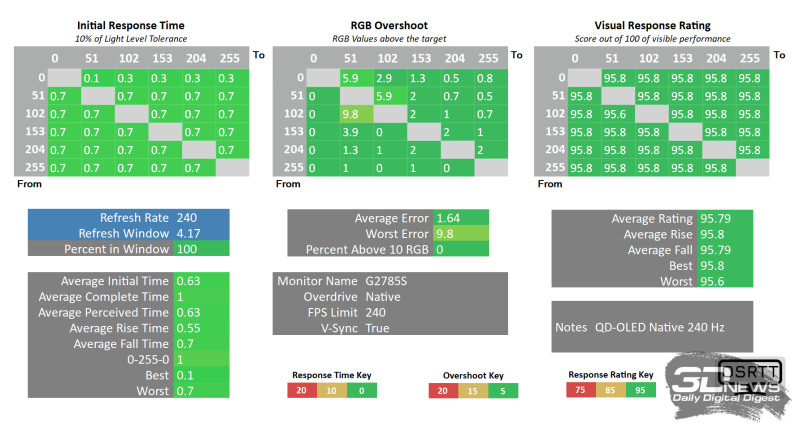 Фактически же все OLED-мониторы на одинаковых матрицах дают идентичные результаты скорости, но некоторые из них демонстрируют разный подход производителей к защите органических светодиодов и отработке полноэкранных цветовых переходов. К тому же, используемое оборудование не позволяет со 100% точностью проверить скорость столь быстрых OLED, а поэтому знайте – подобные G2785S мониторы способны на куда большие подвиги и время отклика на части переходов точно ниже, чем 0,1 мс. В этом нет никаких сомнений – проблемы скорости отклика игровым OLED абсолютно не свойственны.