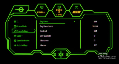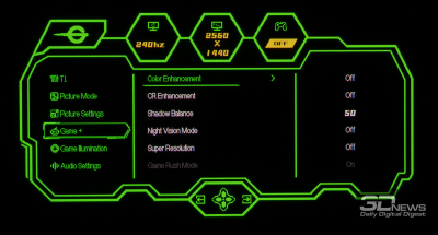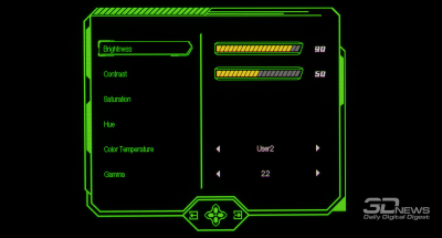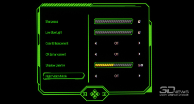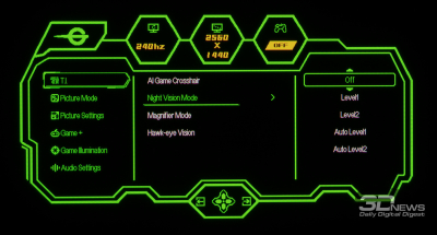 Теперь рассмотрим дополнительные возможности настройки цветопередачи монитора. Особое внимание мы уделили функции Night Vision из игрового раздела меню, которая предназначена для улучшения различимости в тёмных сценах, и доступным режимам Gamma, позволяющим быстро скорректировать общую контрастность изображения на экране.